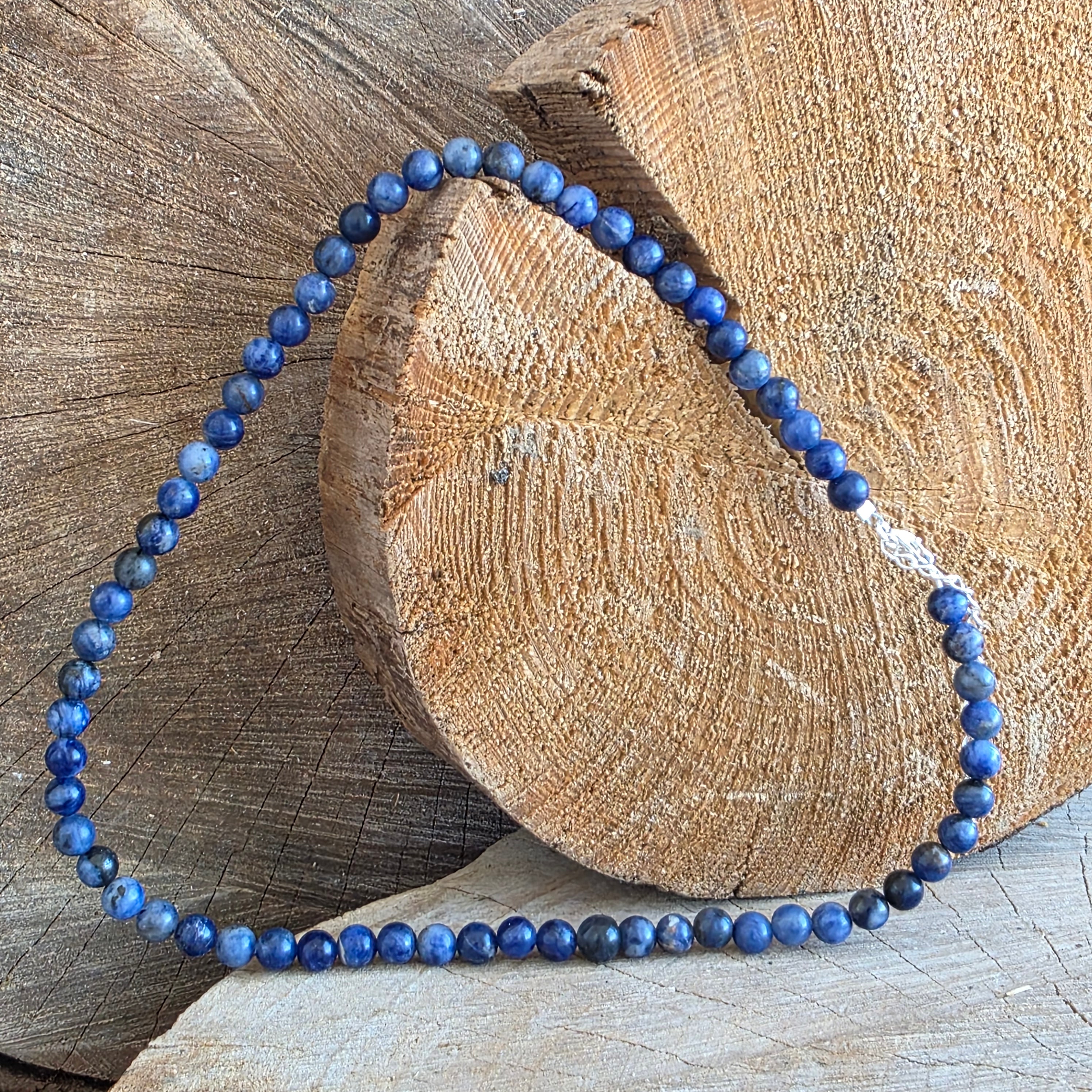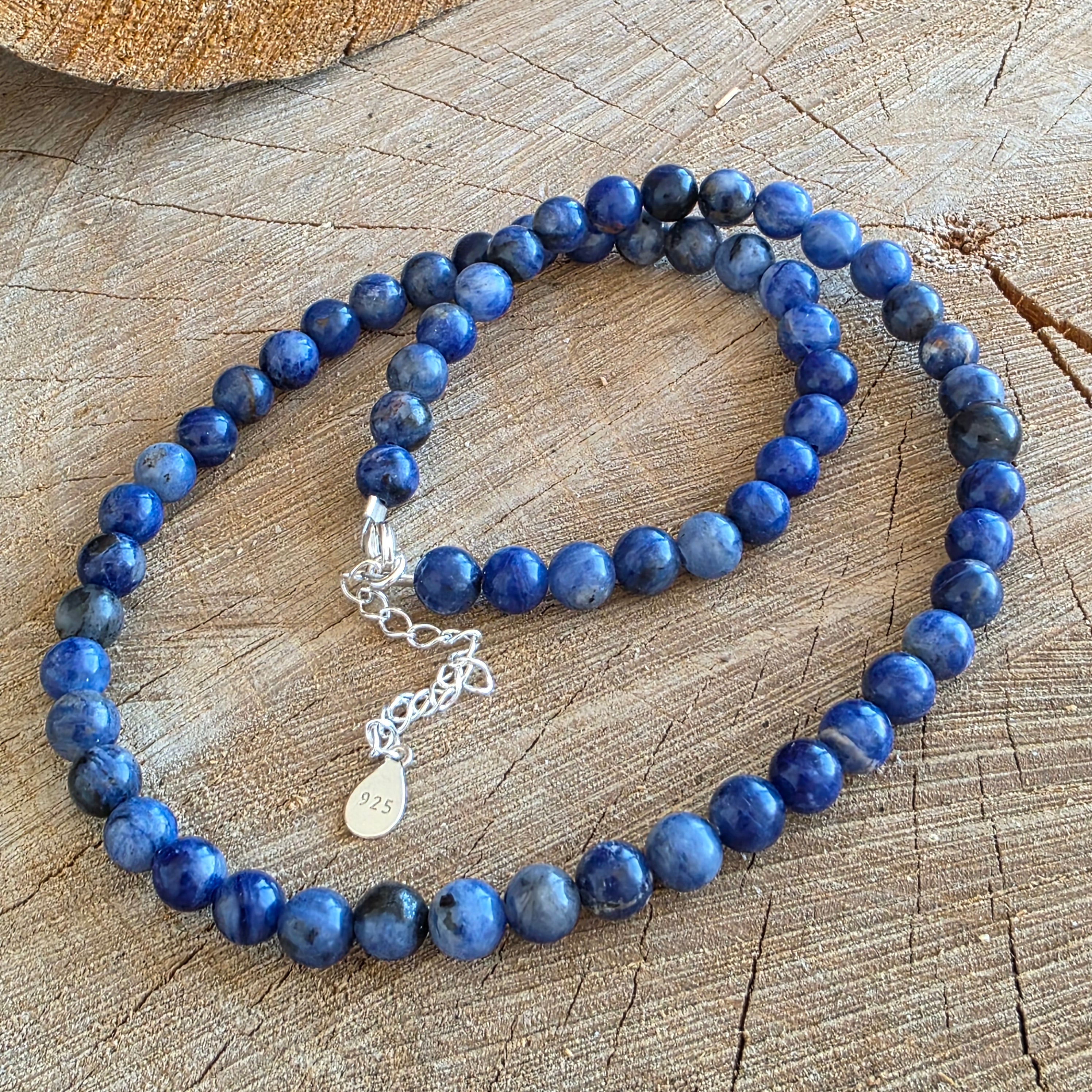 Naszyjnik o wyraźnej i głębokiej obecności, wykonany z 8-milimetrowych kulek sodalitu, które tworzą dobrze zdefiniowaną i zrównoważoną linię wokół szyi. Intensywny niebieski kolor z naturalnymi, białymi lub szarymi wtrąceniami nadaje kamieniowi poważny i wyrazisty wygląd, a kulisty kształt podkreśla poczucie stabilności i spójności wizualnej. Projekt jest prosty i świadomy, pozwalając, aby kolor i naturalna struktura sodalitu były centralnym elementem.