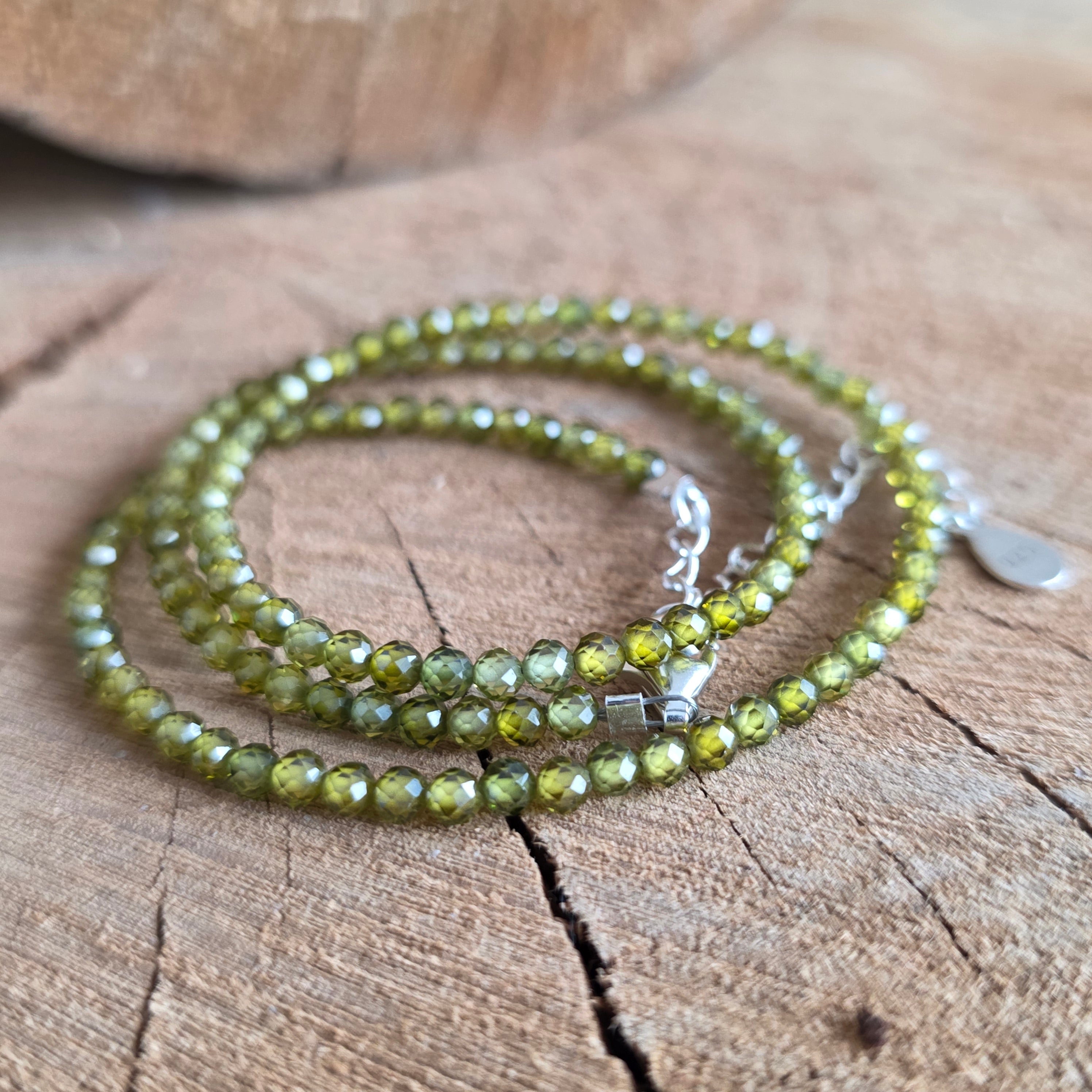 Ten naszyjnik wykonany jest z naturalnego zielonego cyrkonu, wybranego ze względu na świeże odcienie i subtelny, elegancki połysk. Fasetowane kulki o średnicy 2,5 mm delikatnie odbijają światło, tworząc subtelną grę migotania, która nadaje biżuterii wyrafinowany i świetlisty charakter.