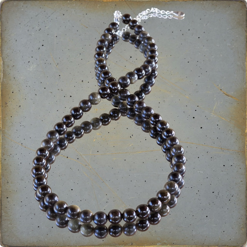 Naszyjnik o eleganckiej i tajemniczej prezencji, wykonany z 6 mm kul złotego obsydianu, które harmonijnie układają się wokół szyi, tworząc zrównoważoną i płynną linię. Głęboka czerń kamienia jest przesiąknięta subtelnymi złotymi refleksami, które pojawiają się i znikają w zależności od światła i ruchu, dodając biżuterii głębi i charakteru. Sferyczny kształt podkreśla naturalny połysk obsydianu i tworzy spokojną, lecz ekspresywną ciągłość wizualną.