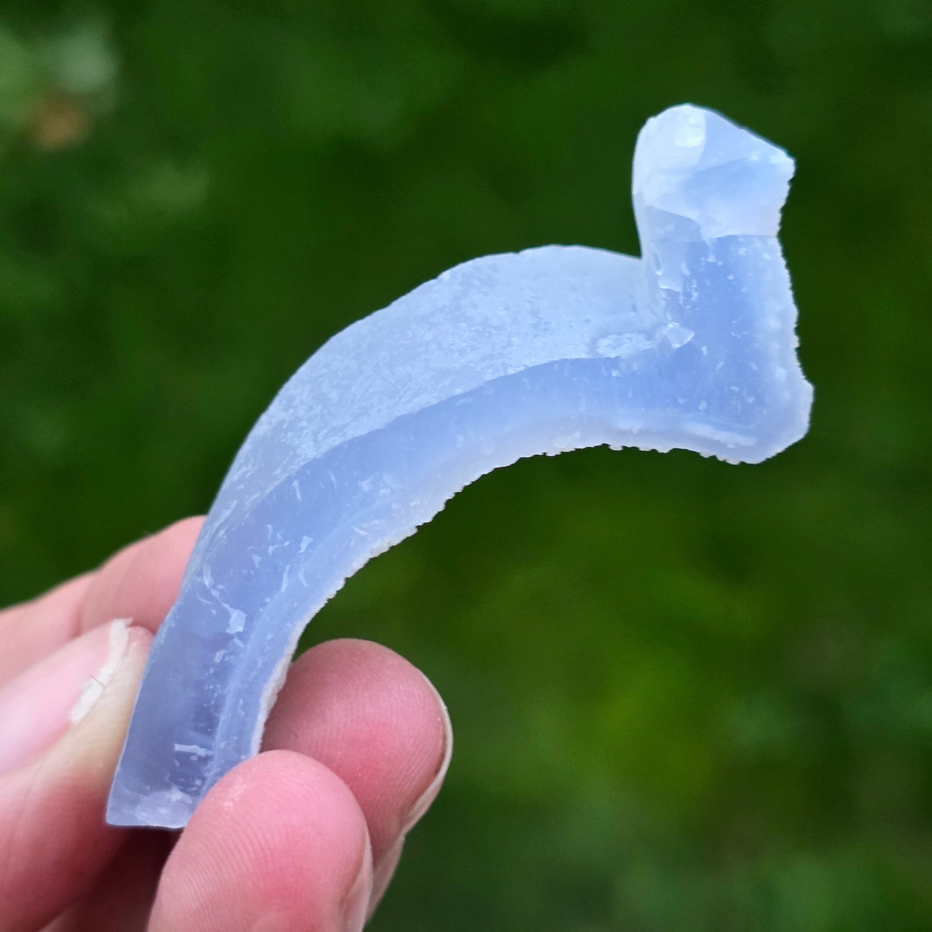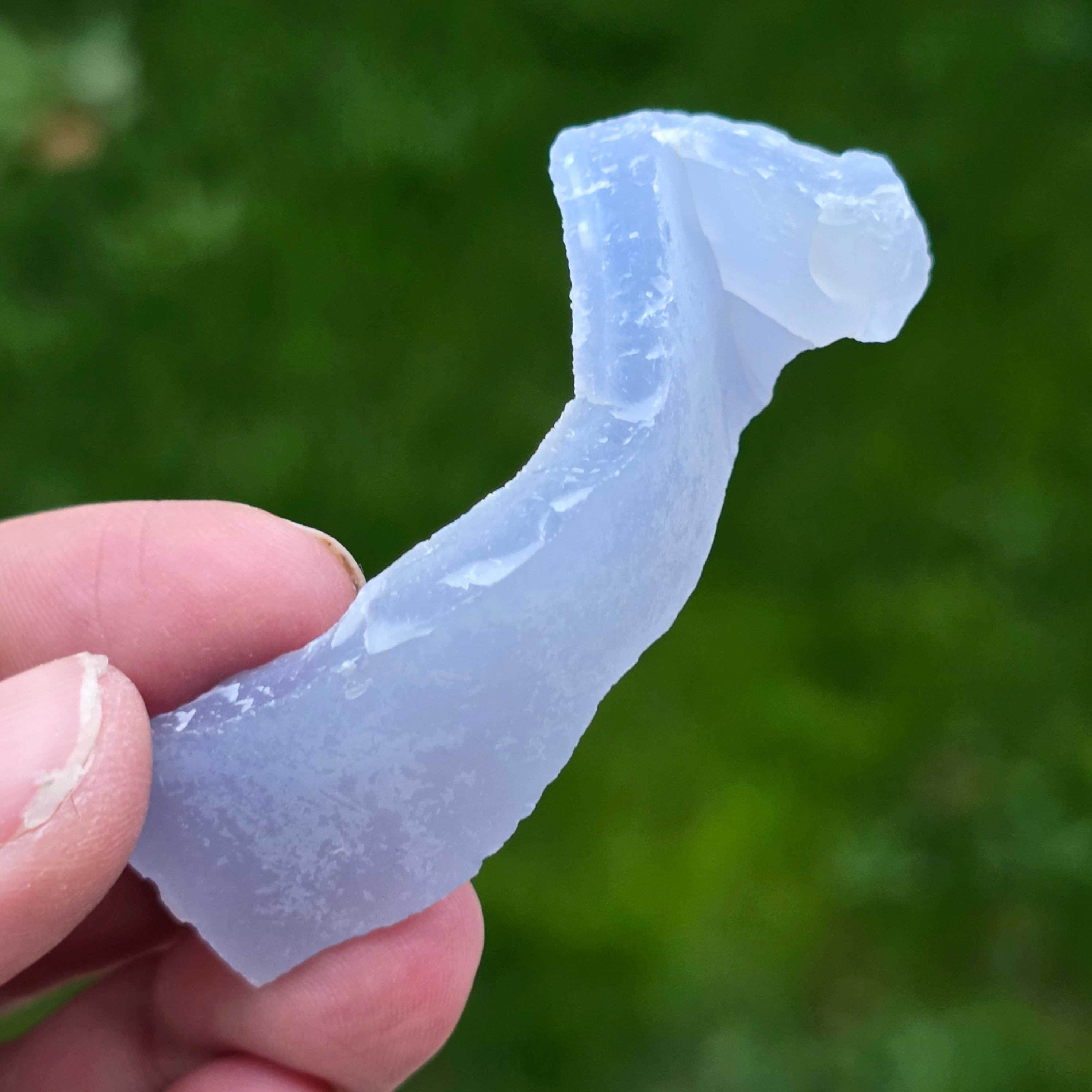 Okaz Niebieskiego Agatu Koronkowego i Niebieskiej Chalcedonii, pochodzący z Nsanje w Malawi. Te niezwykłe formacje przechodzą skomplikowany proces kąpieli w kwaśnym roztworze w Republice Południowej Afryki, który starannie usuwa większość lub wszystkie ślady matrycy, pozostawiając za sobą czysty Niebieski Agat Koronkowy i/lub Niebieską Chalcedonię o wyjątkowym pięknie.