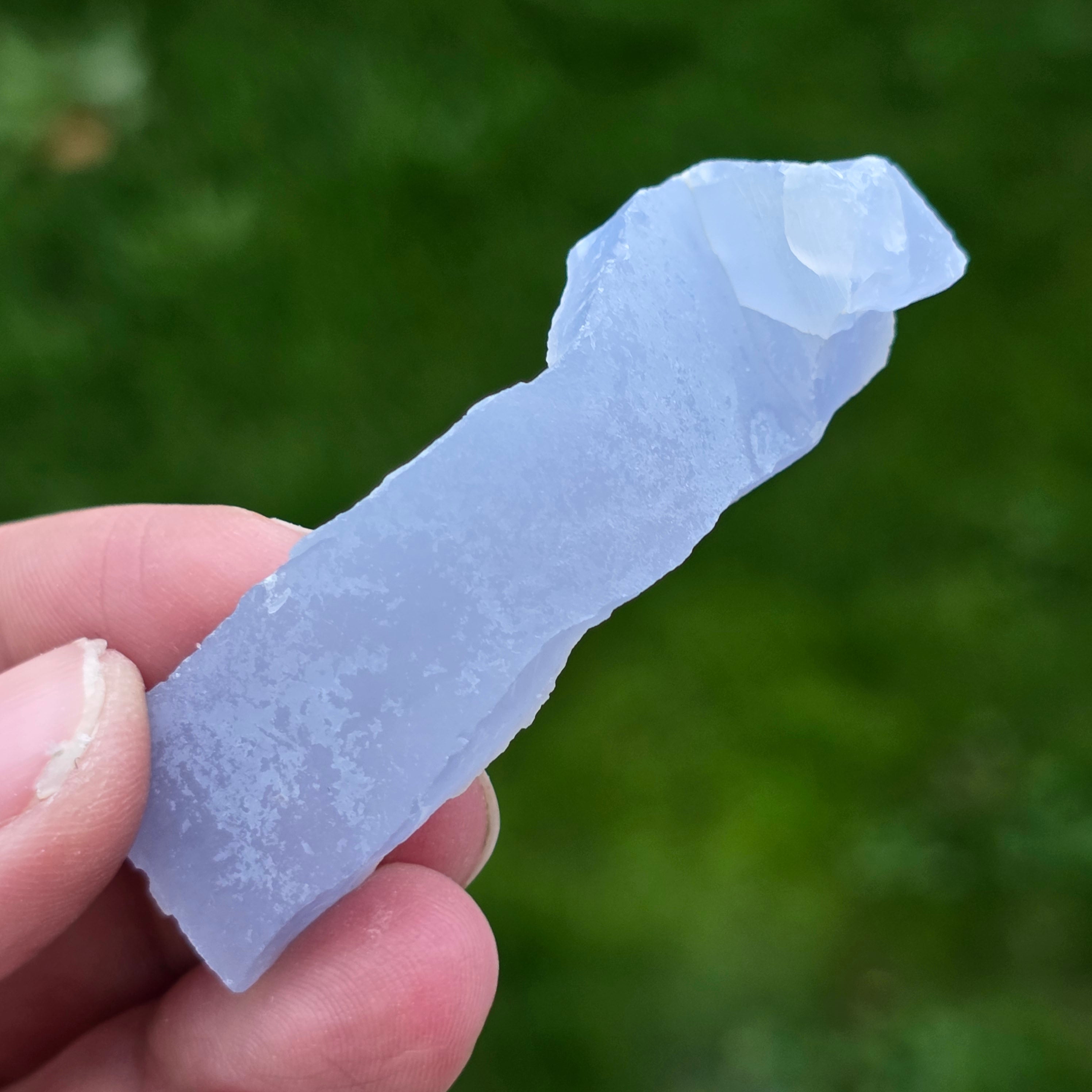 Niebieska chalcedonia jest zazwyczaj kojarzona z komunikacją, wyrażaniem siebie i prawdy, może pomagać w pobudzaniu autentycznej komunikacji.