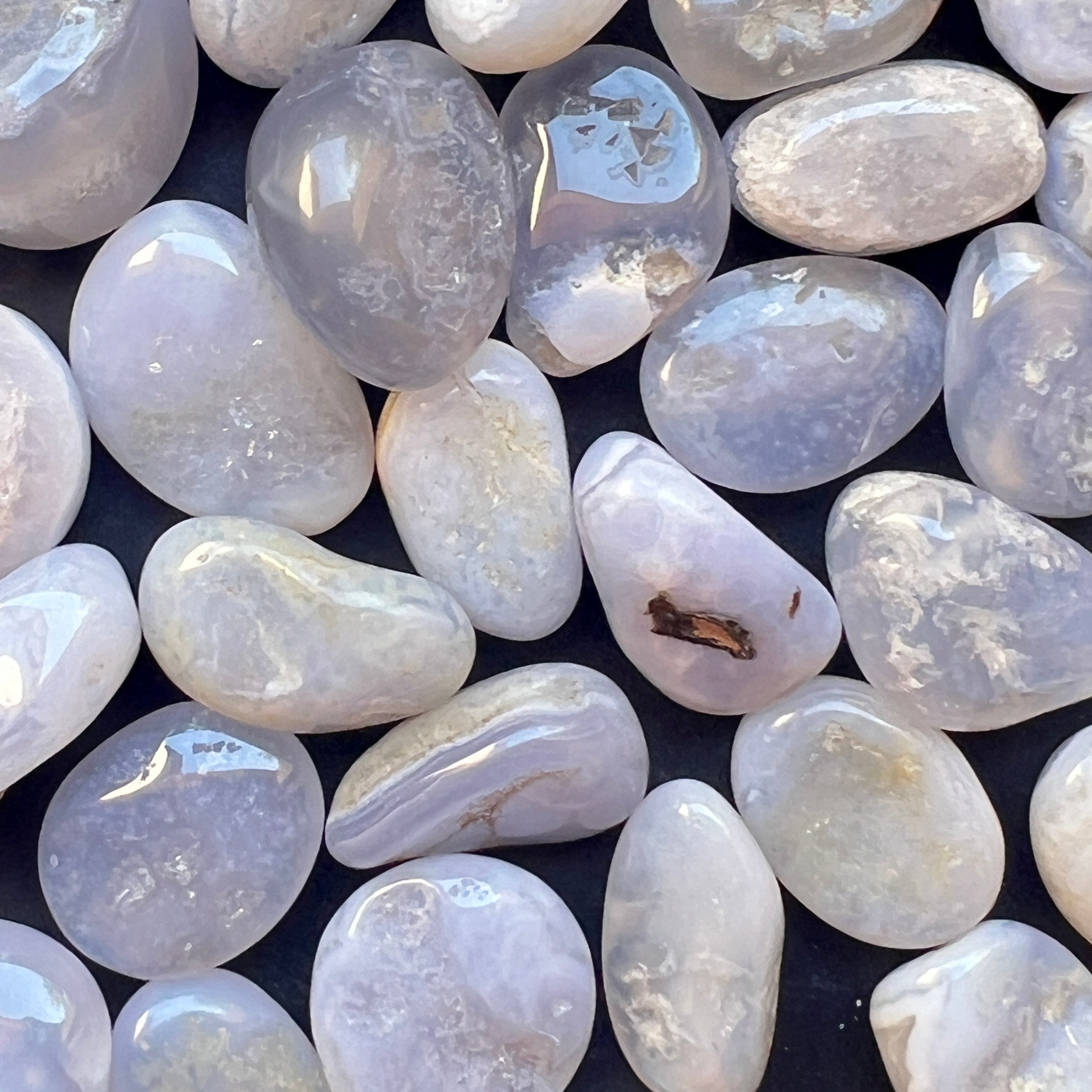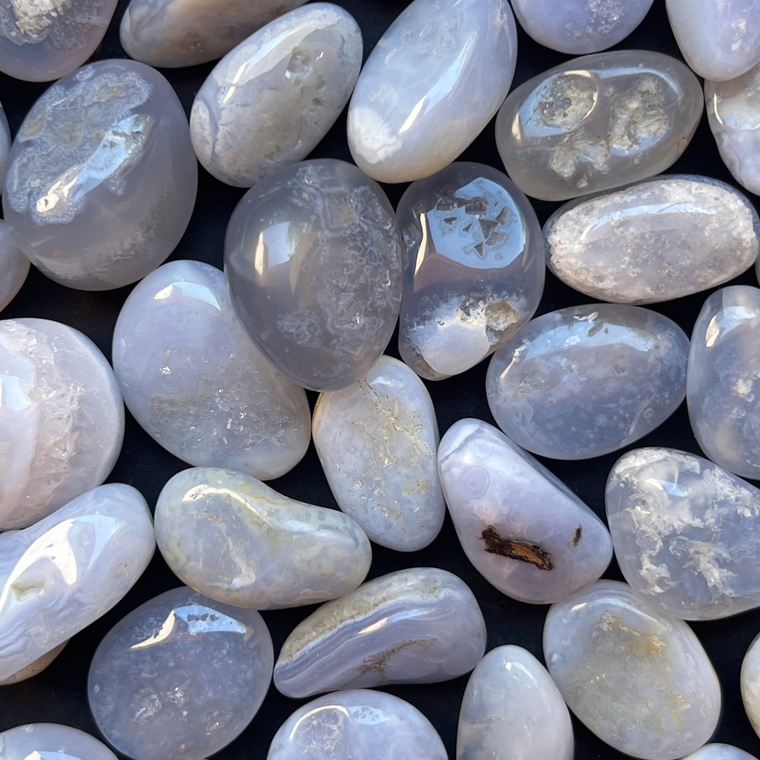 Niebieska chalcedonia jest ogólnie związana z komunikacją, wyrazem siebie i prawdy, może to pomóc stymulować autentyczną komunikację.