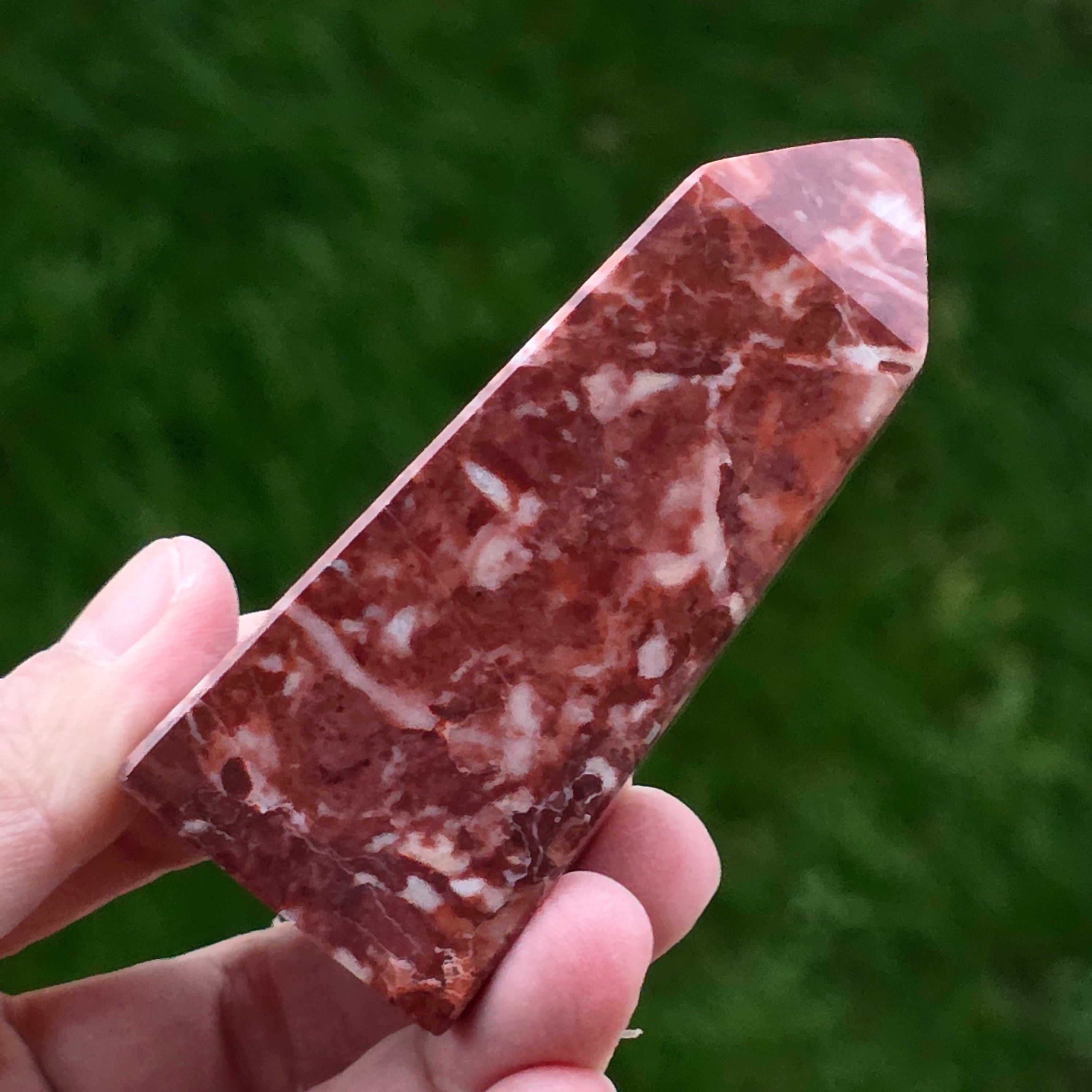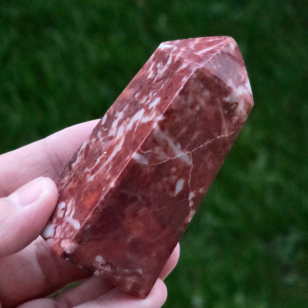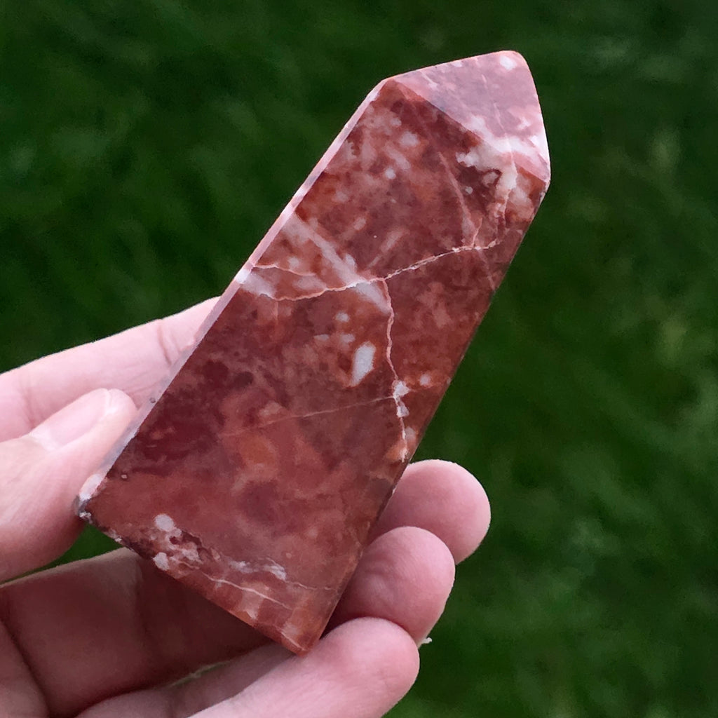 Obeliscul din Jasp Strawberry este o piesă plină de vitalitate, sculptată cu atenție pentru a evidenția nuanțele bogate de roșu căpșună și texturile naturale caracteristice acestui tip de jasp. Fiecare obelisc este unic, cu modele organice ce amintesc de roci sedimentare antice și straturi minerale formate într-un ritm geologic lent.