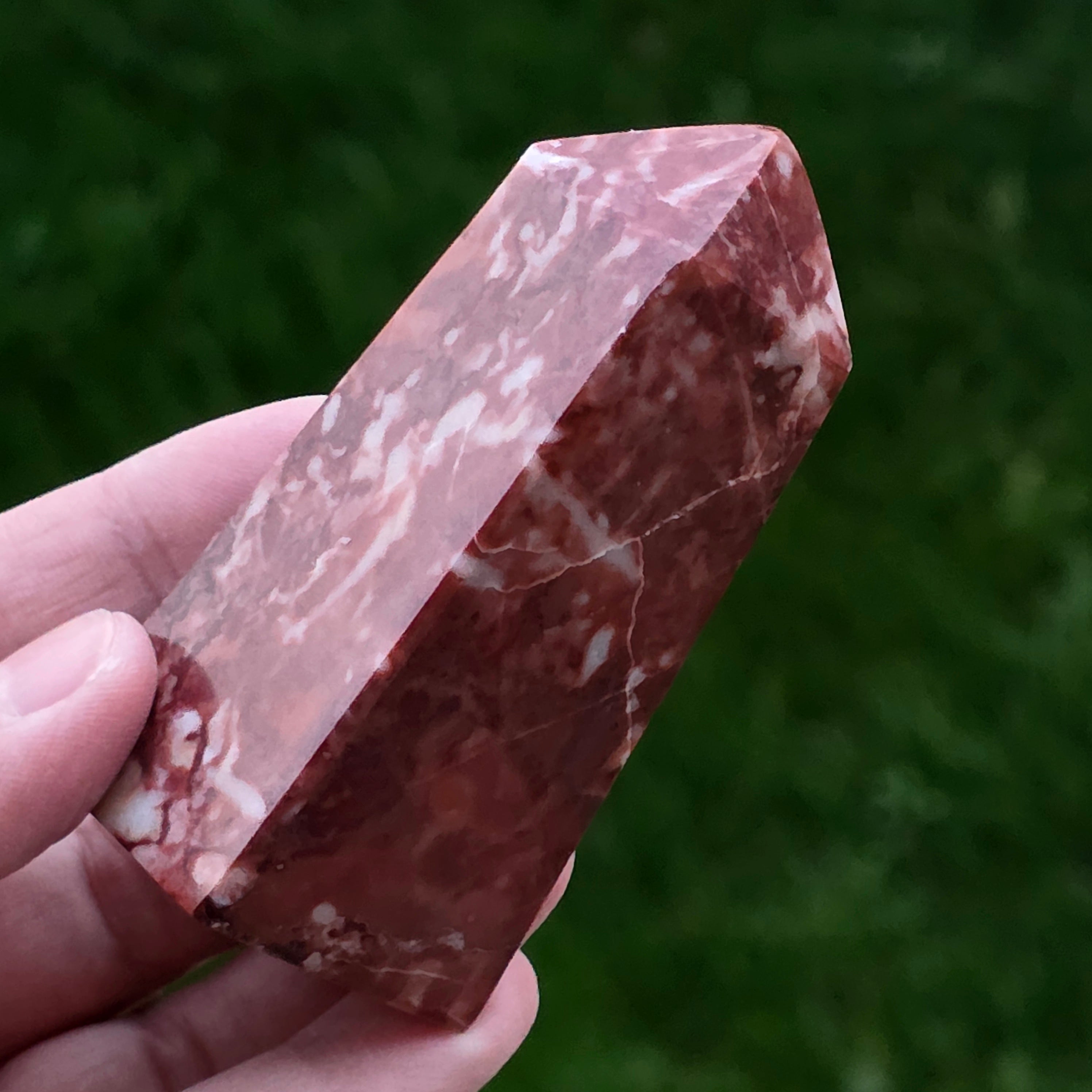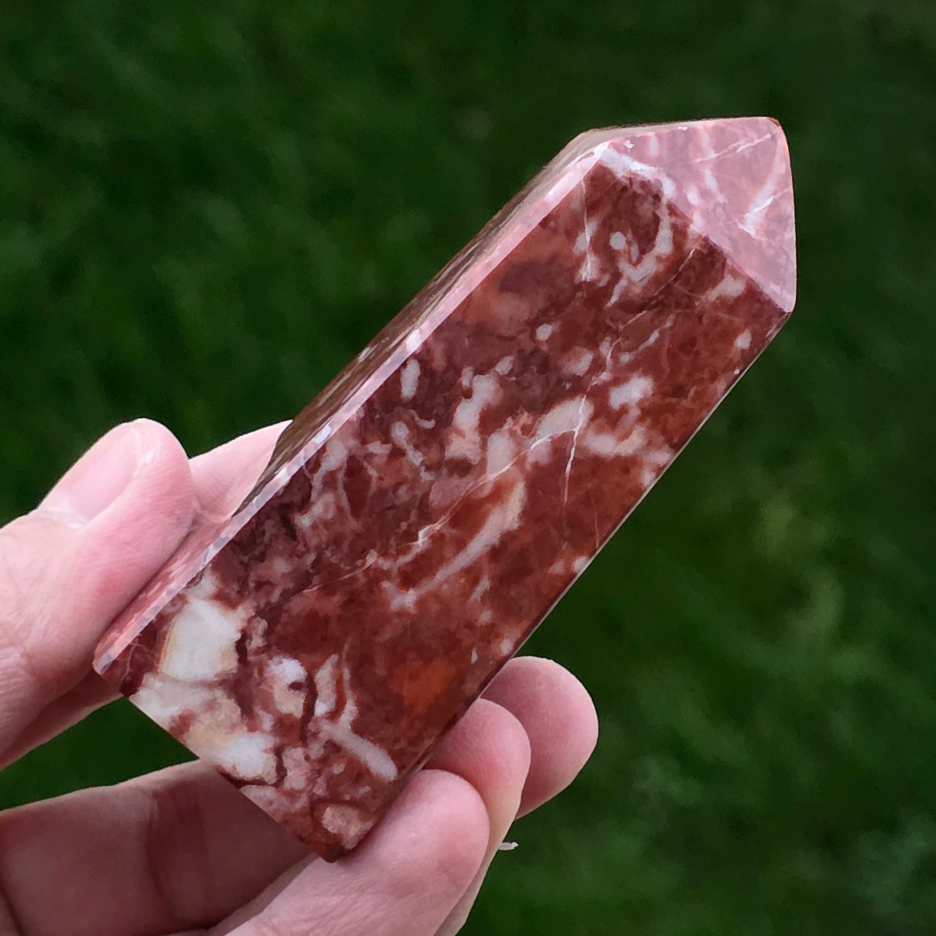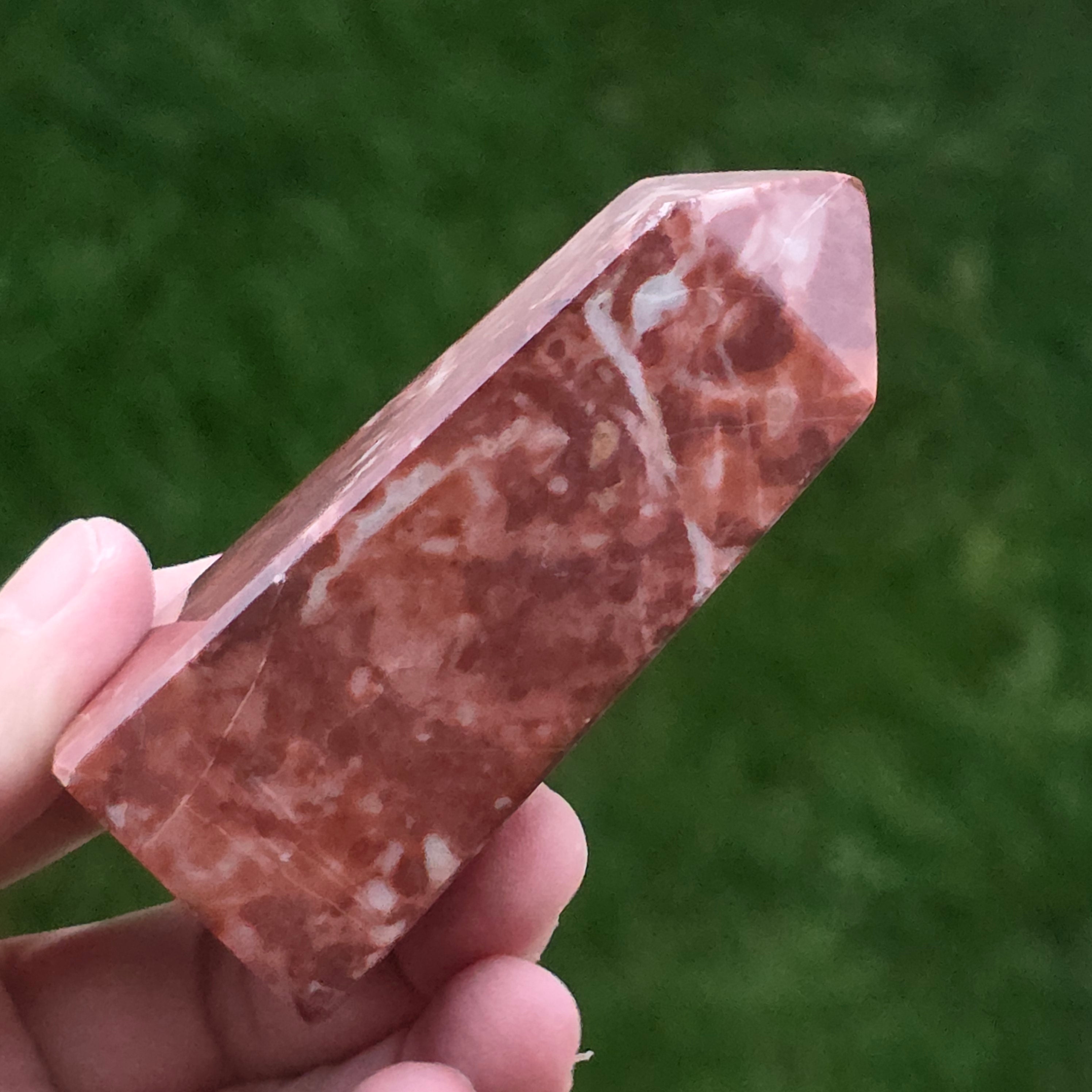Obeliscul din Jasp Strawberry este o piesă plină de vitalitate, sculptată cu atenție pentru a evidenția nuanțele bogate de roșu căpșună și texturile naturale caracteristice acestui tip de jasp. Fiecare obelisc este unic, cu modele organice ce amintesc de roci sedimentare antice și straturi minerale formate într-un ritm geologic lent.