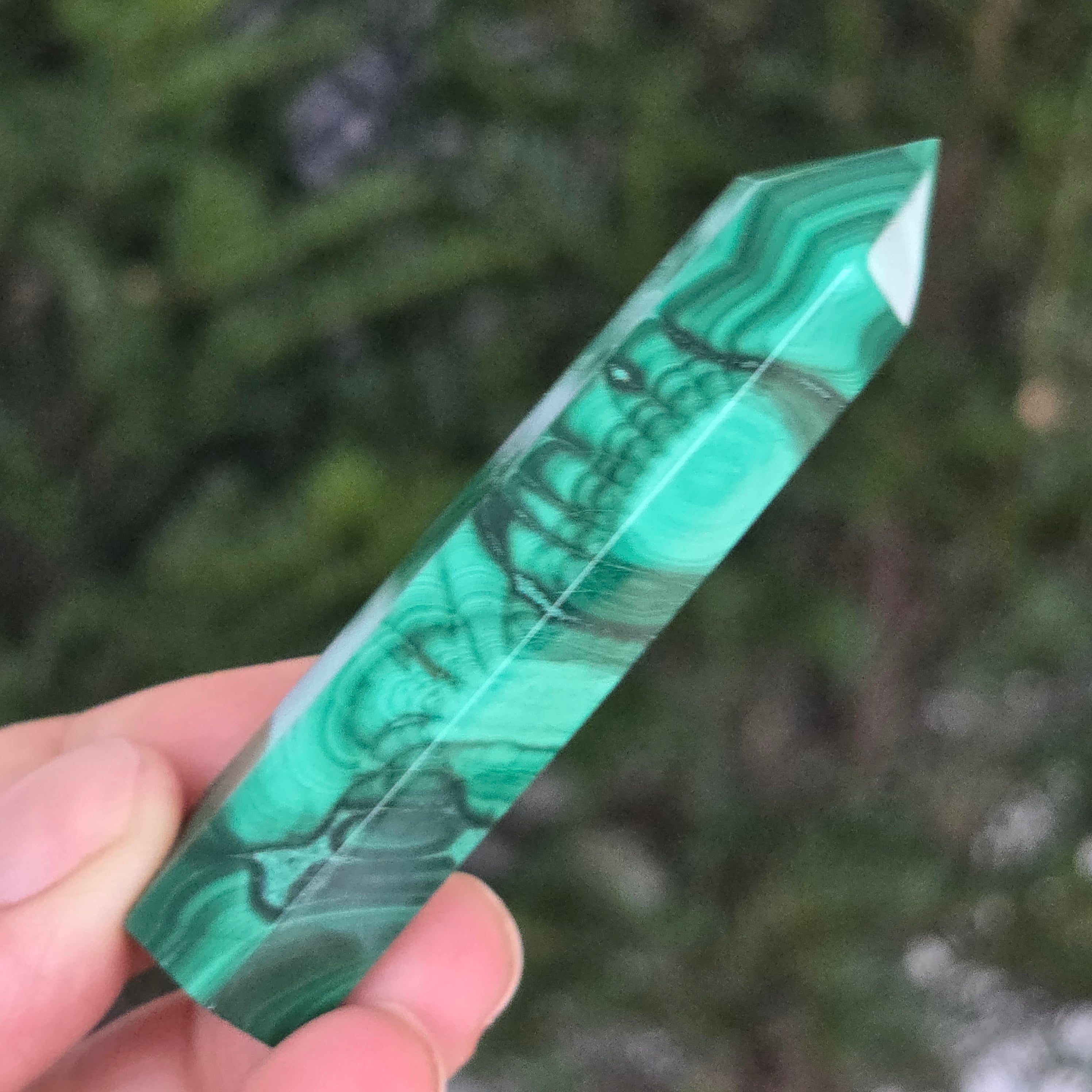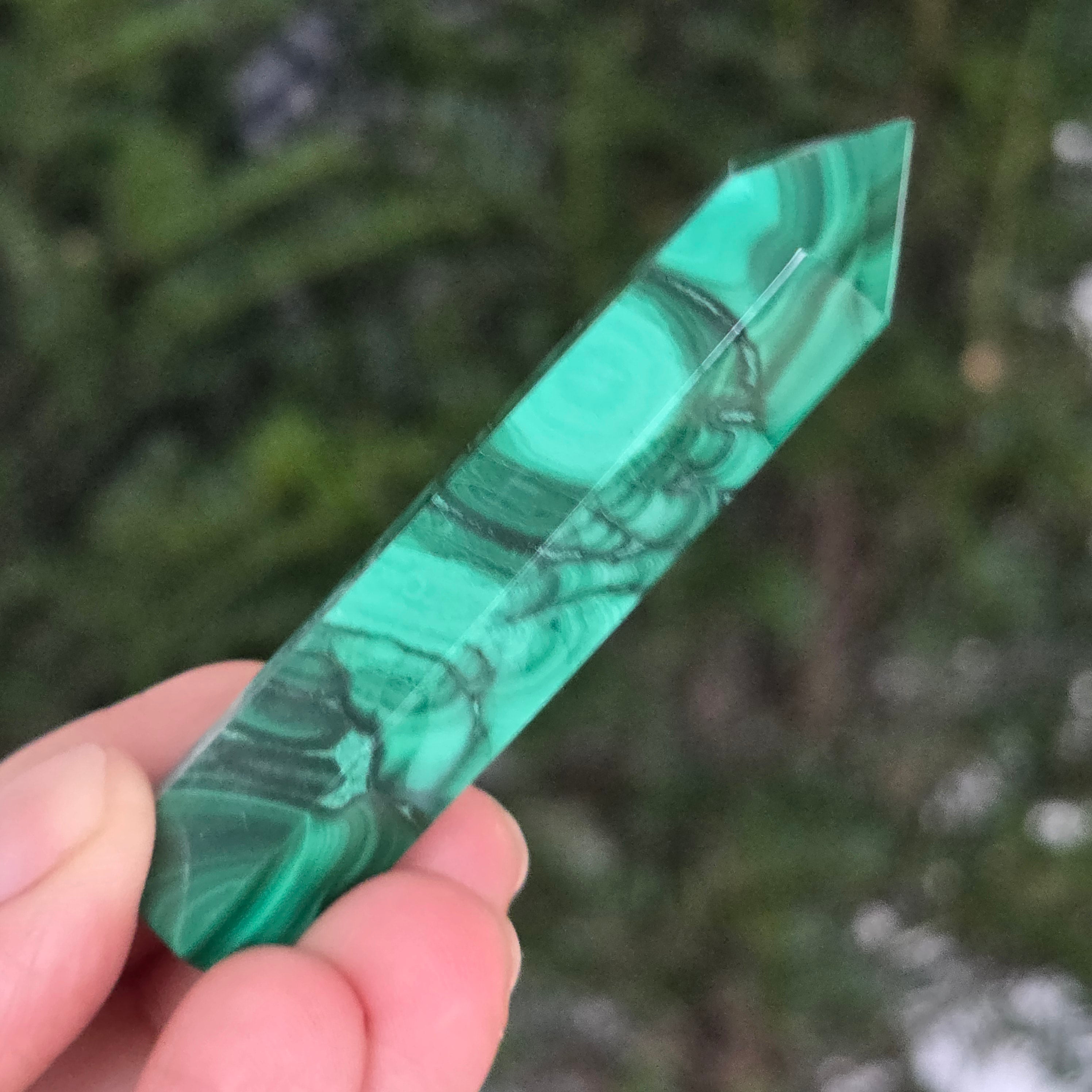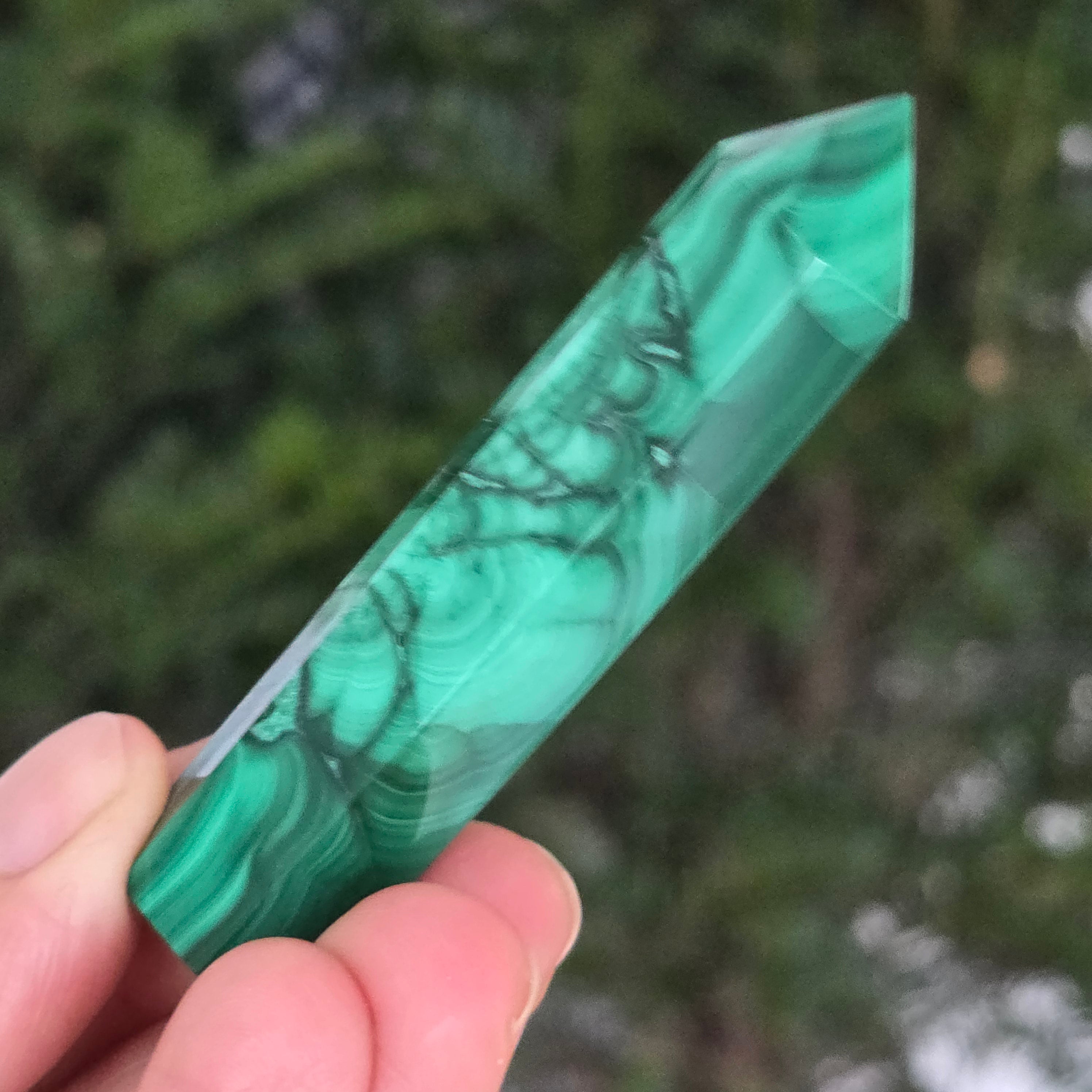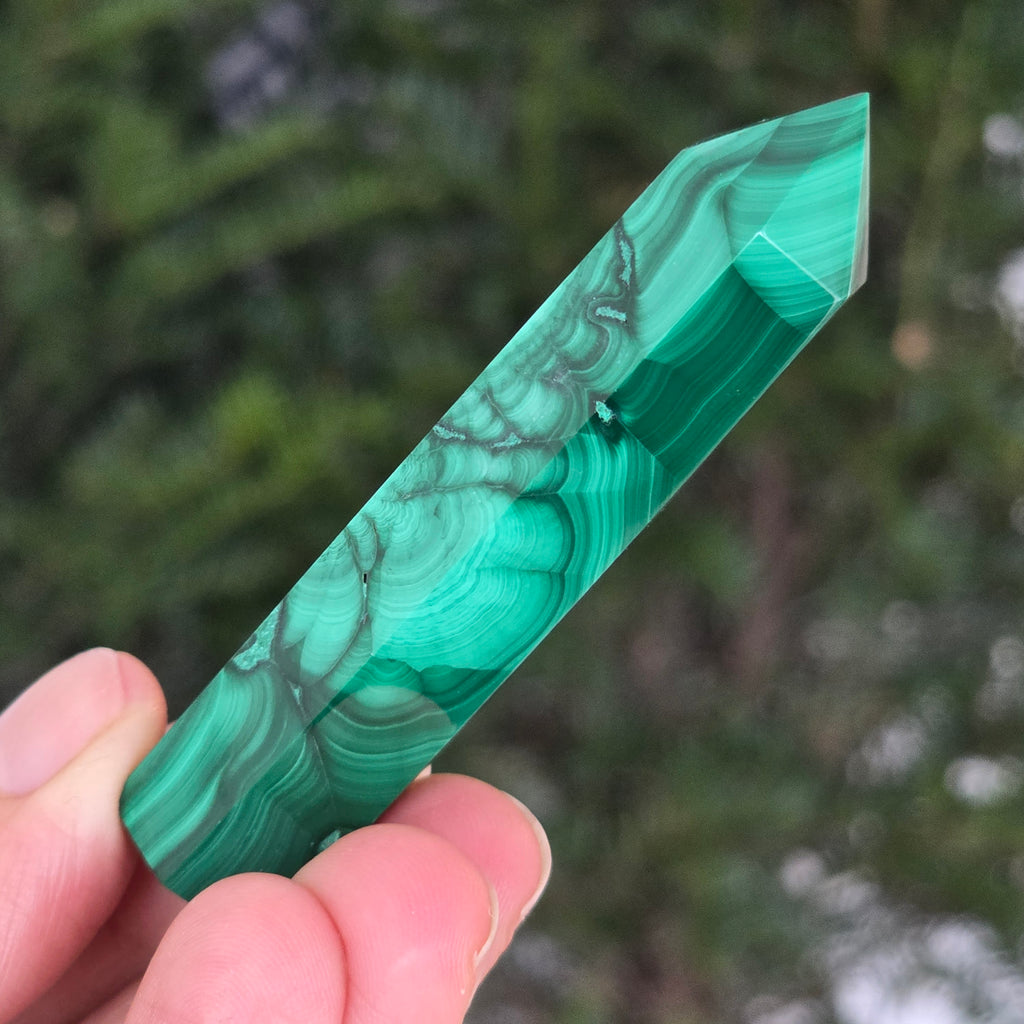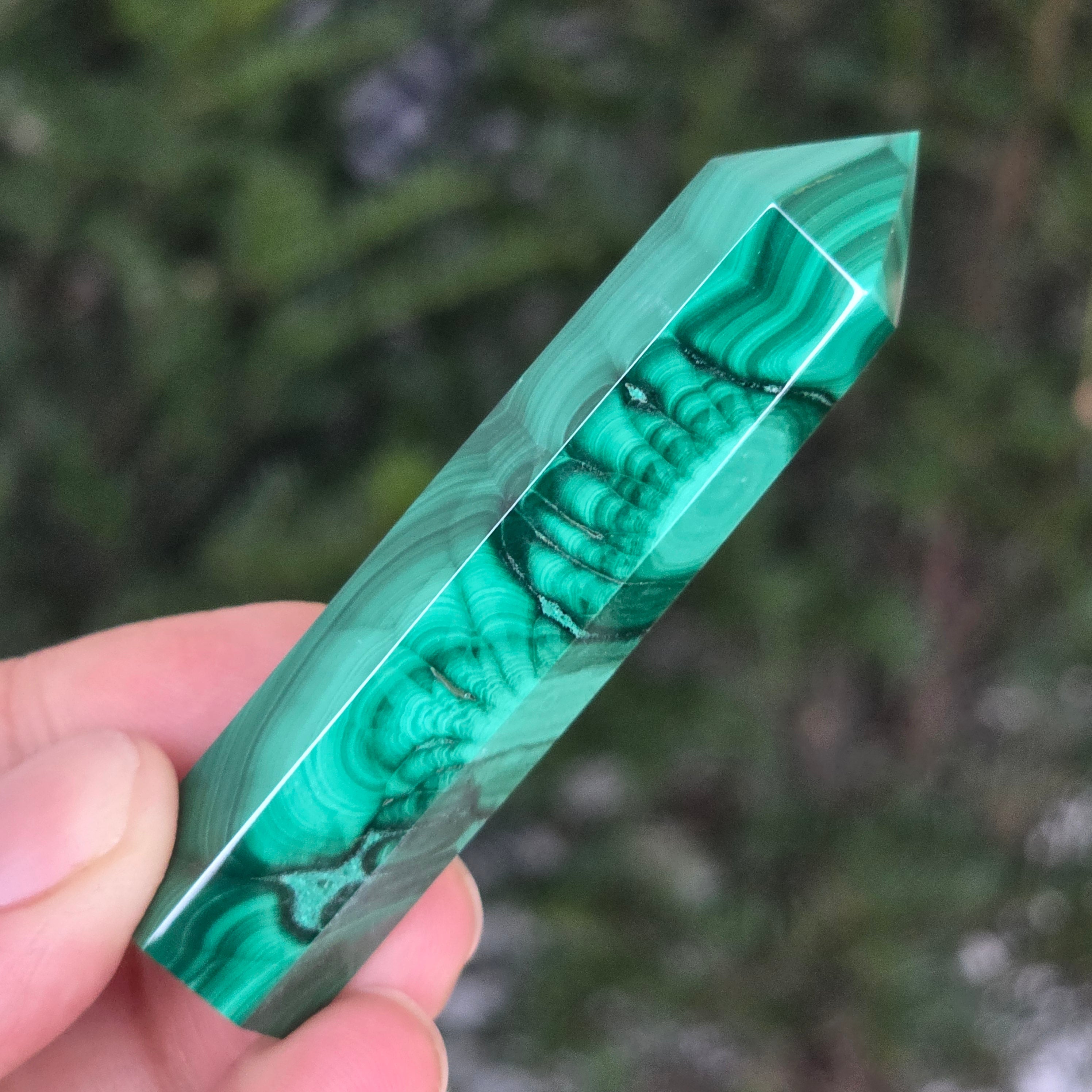 Un obelisc ce pare să fi prins viață din adâncurile verzi ale planetei. Această piesă unicat din malachit natural, dezvăluie straturi fascinante de verde smarald, verde închis și nuanțe mătăsoase de jad, dispuse în modele concentrice unice, ca niște hărți ale energiilor interioare. Polişat manual până la o strălucire catifelată, obeliscul emană o eleganță minerală profundă.