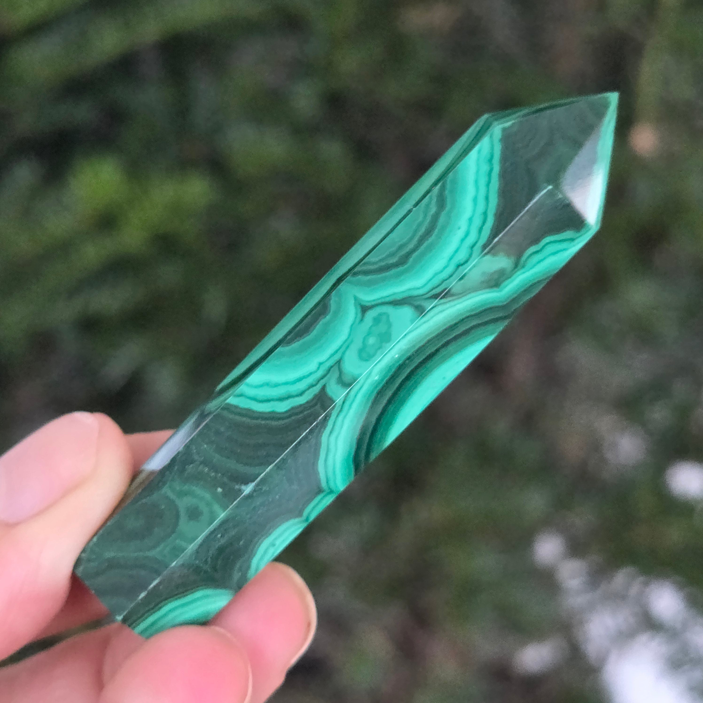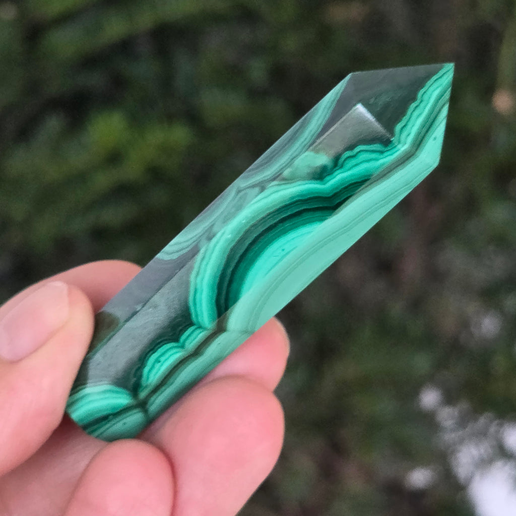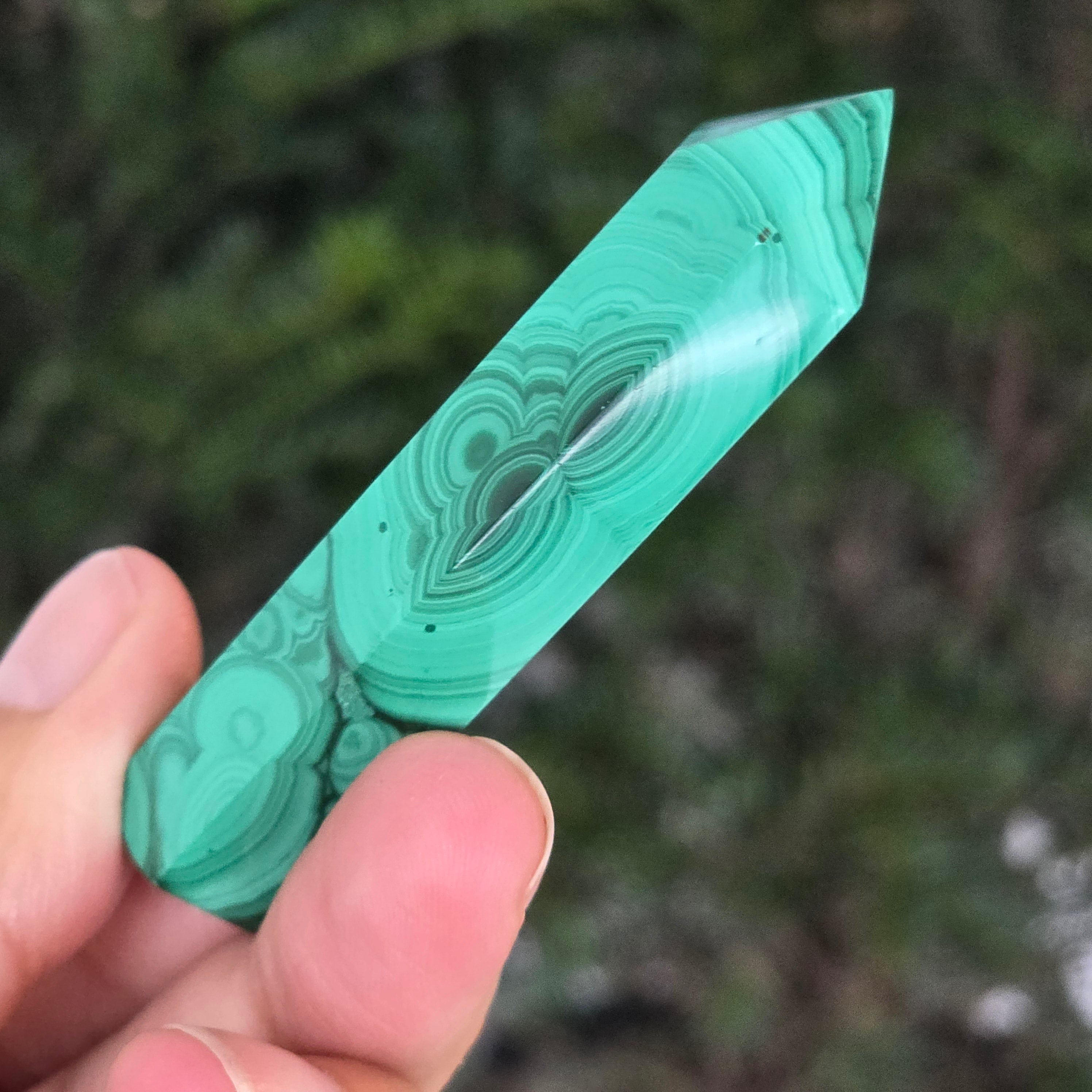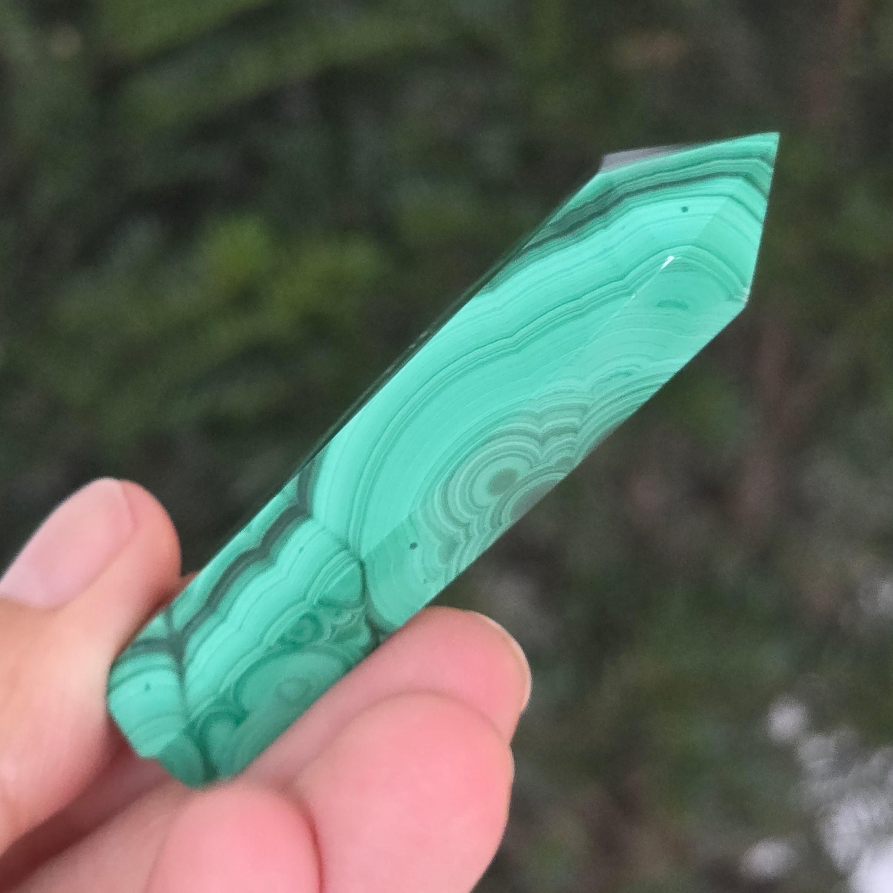 Un obelisc ce pare să fi prins viață din adâncurile verzi ale planetei. Această piesă unicat din malachit natural, dezvăluie straturi fascinante de verde smarald, verde închis și nuanțe mătăsoase de jad, dispuse în modele concentrice unice, ca niște hărți ale energiilor interioare. Polişat manual până la o strălucire catifelată, obeliscul emană o eleganță minerală profundă.