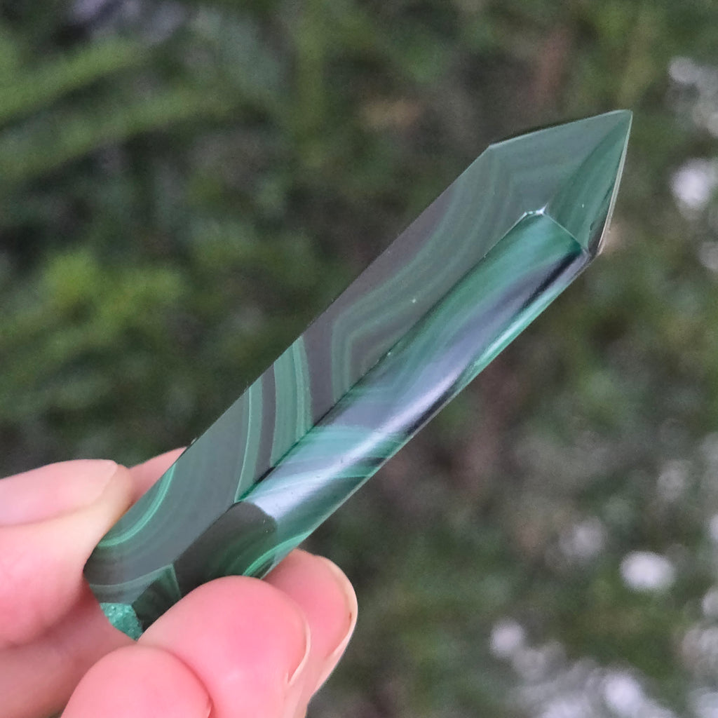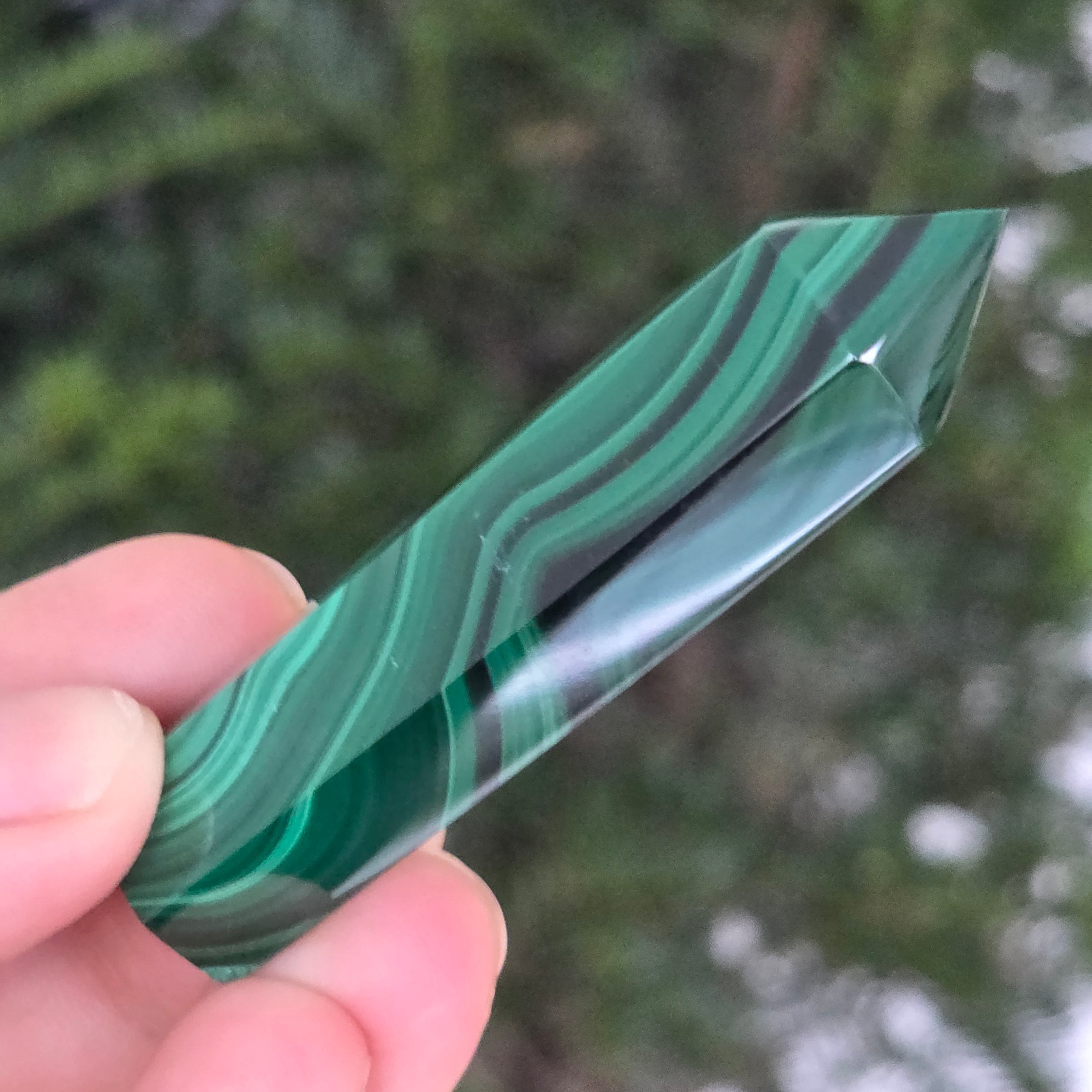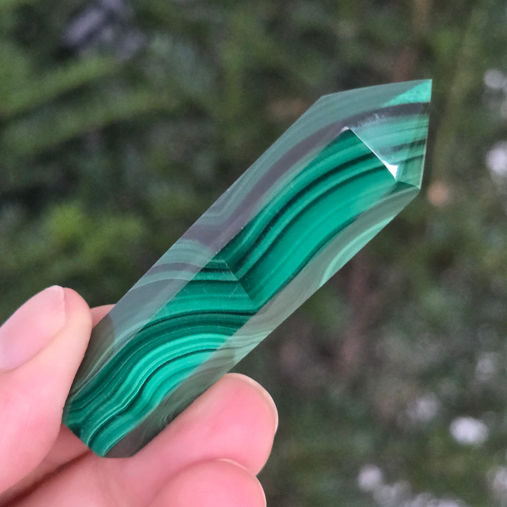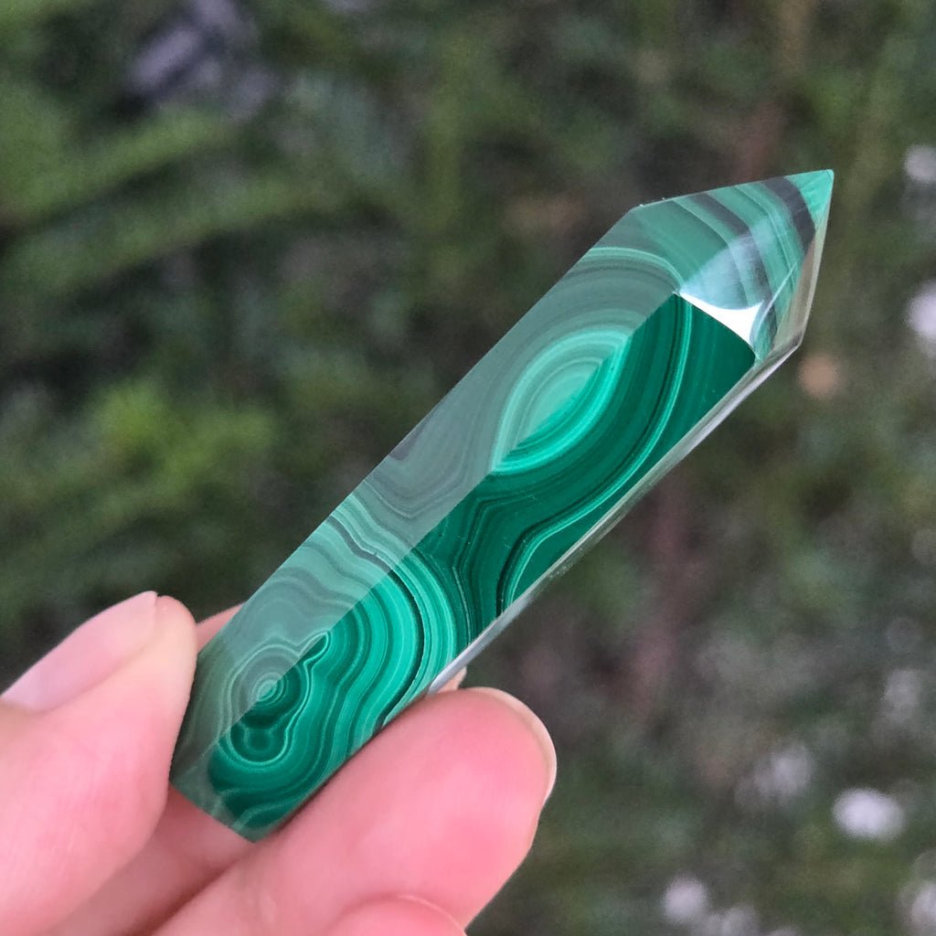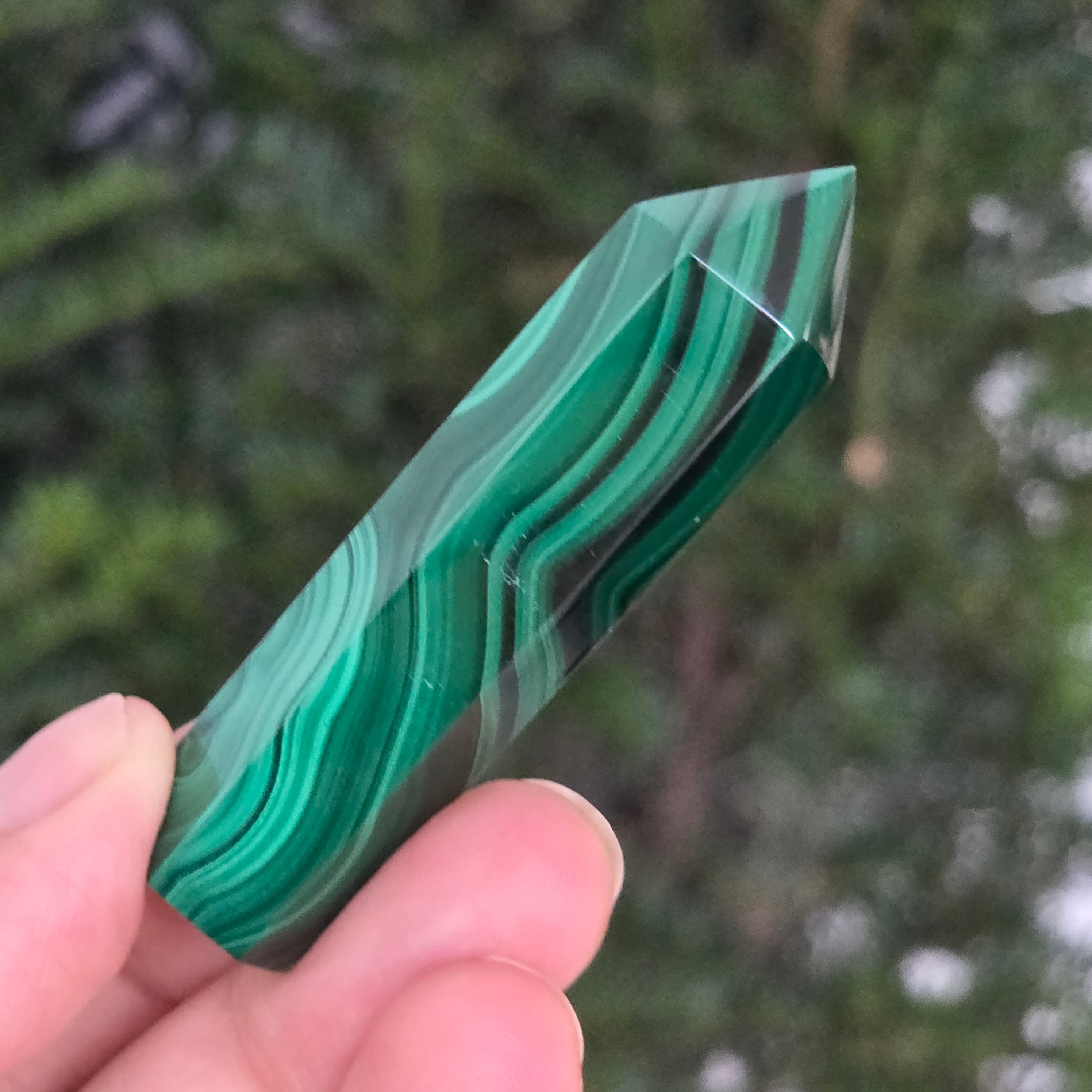 Un obelisc ce pare să fi prins viață din adâncurile verzi ale planetei. Această piesă unicat din malachit natural, dezvăluie straturi fascinante de verde smarald, verde închis și nuanțe mătăsoase de jad, dispuse în modele concentrice unice, ca niște hărți ale energiilor interioare. Polişat manual până la o strălucire catifelată, obeliscul emană o eleganță minerală profundă.
