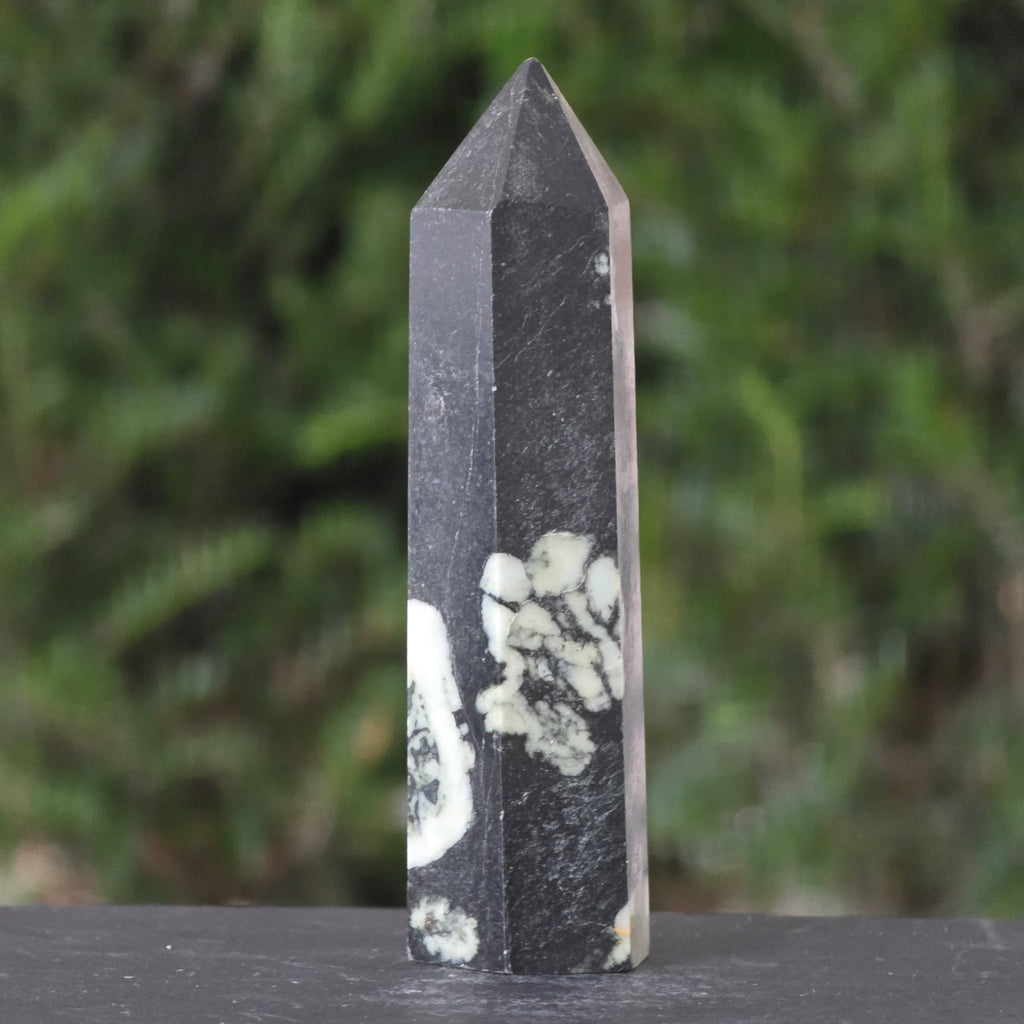 Obeliscul din piatră Crizantemă este o sculptură a contrastelor perfecte — o piatră neagră în care lumina s-a înrădăcinat sub forma unei flori eterne. Fiecare petală albă pare o amintire a echilibrului cosmic dintre haos și armonie.