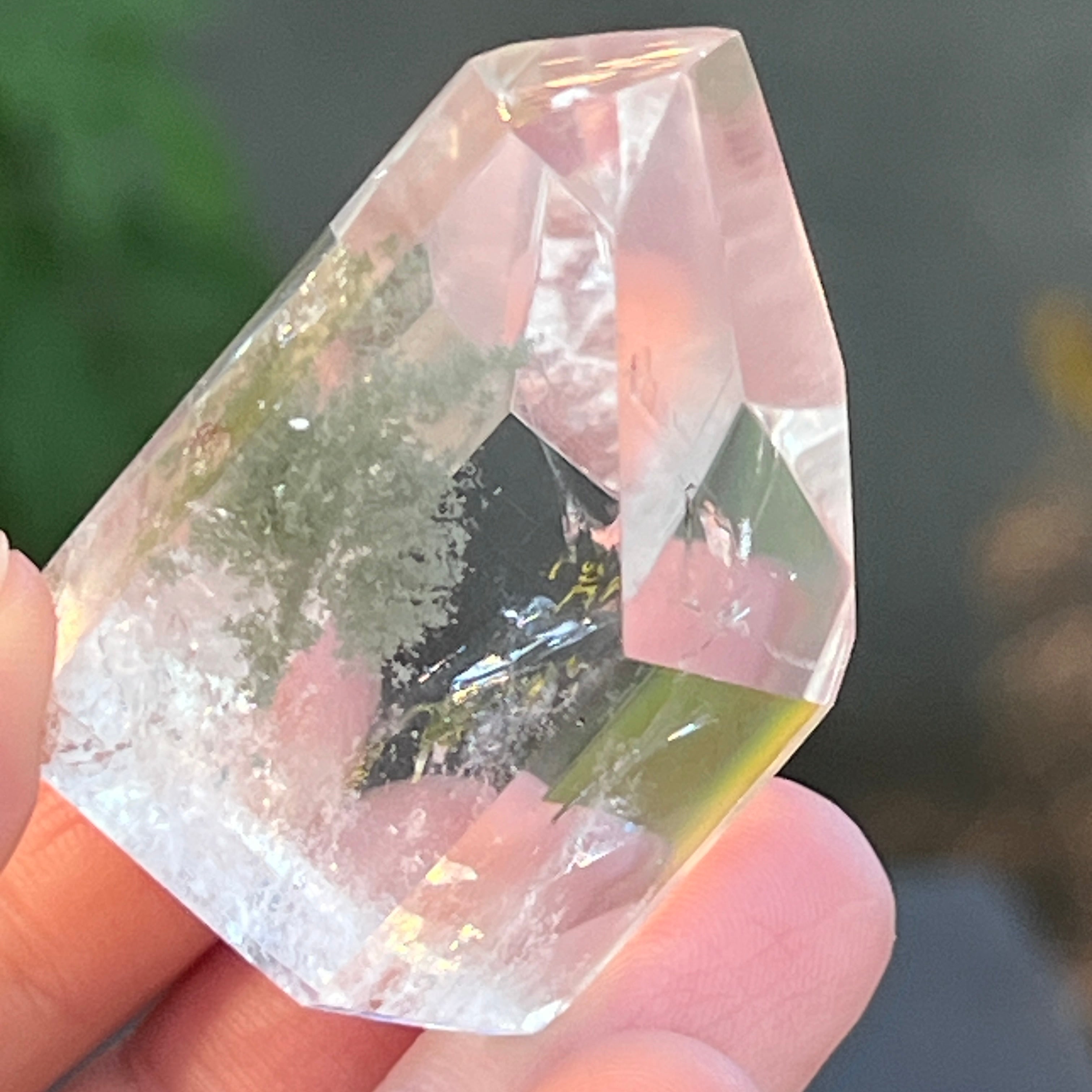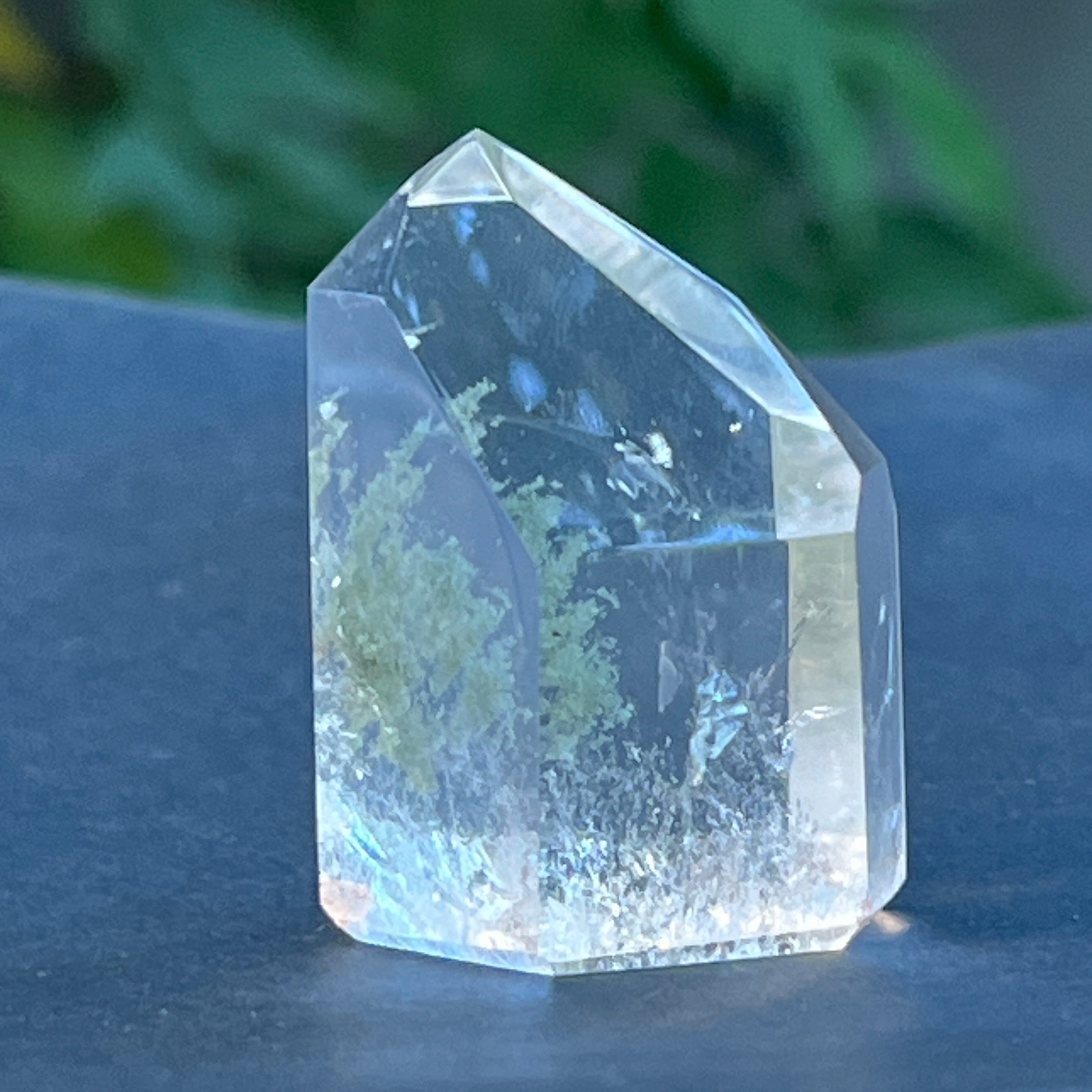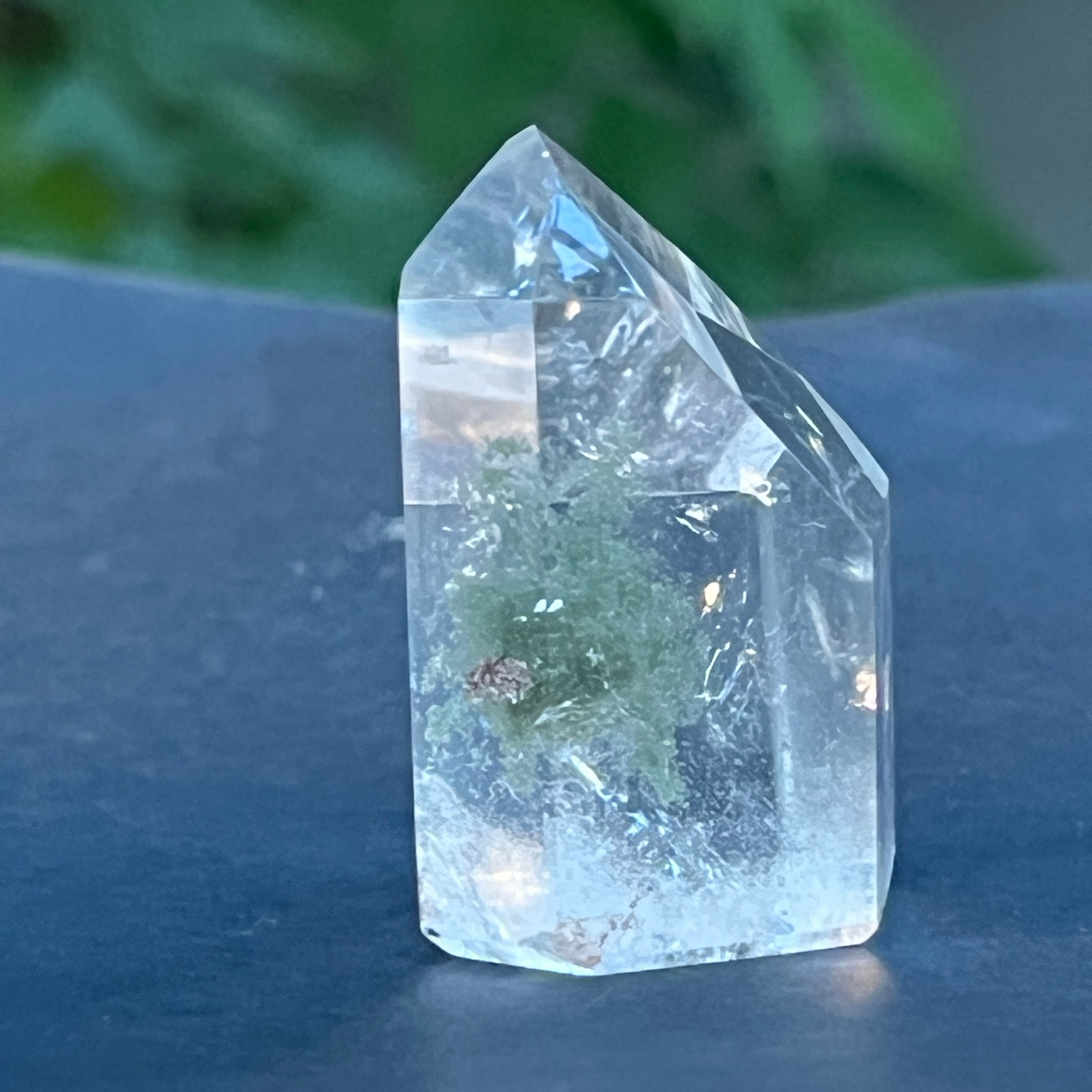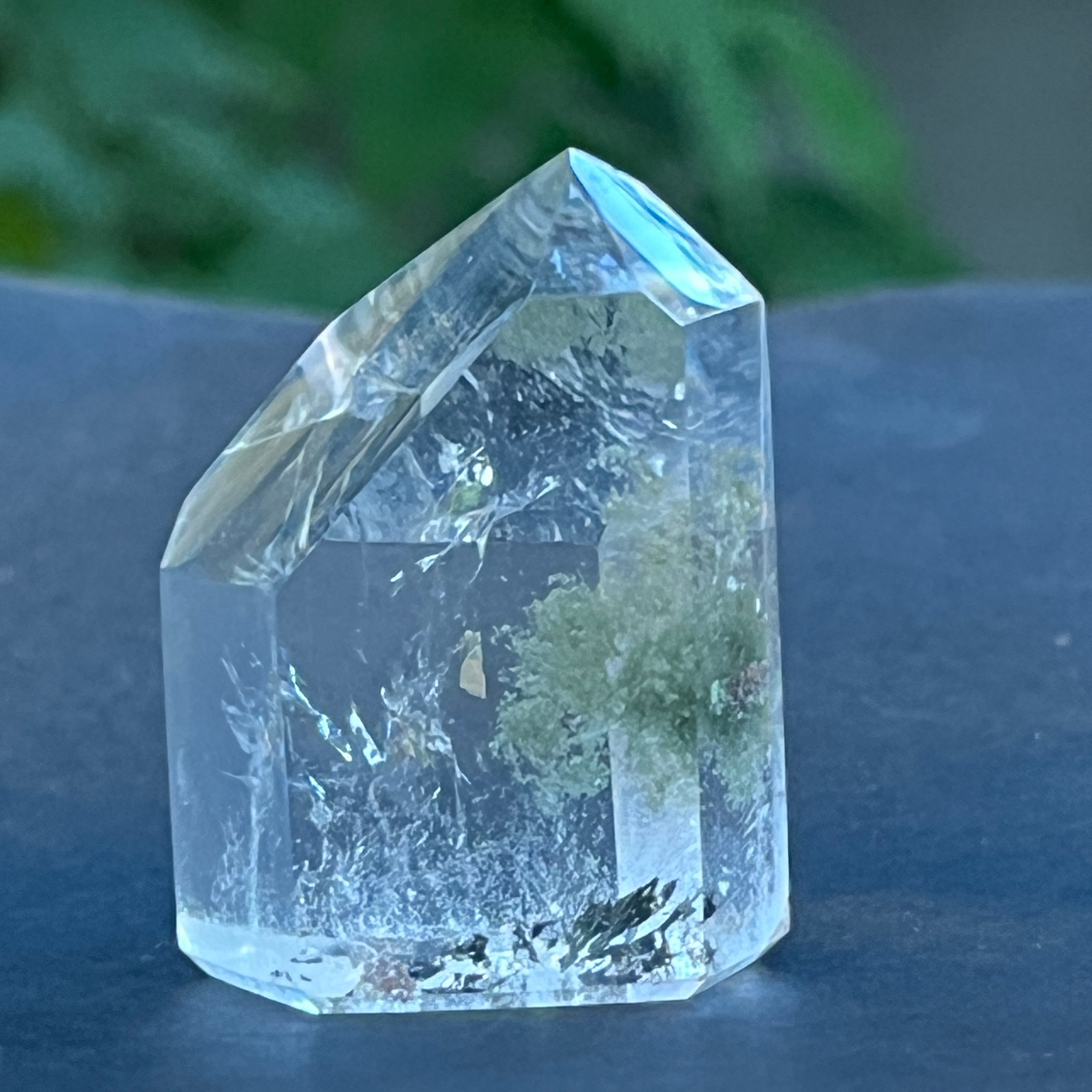 Kwarc chlorytowy to fascynująca odmiana bezbarwnego kwarcu, która wykazuje zielone inkluzje ze względu na mineralny chloryn. Inkluzje te wahają się od delikatnych, cienkich, przypominających włókna kształtów do gęstszych i bardziej rozproszonych kształtów, w zależności od tego, w jaki sposób chloryn został wychwycony w masie kwarcowej podczas jej formowania.