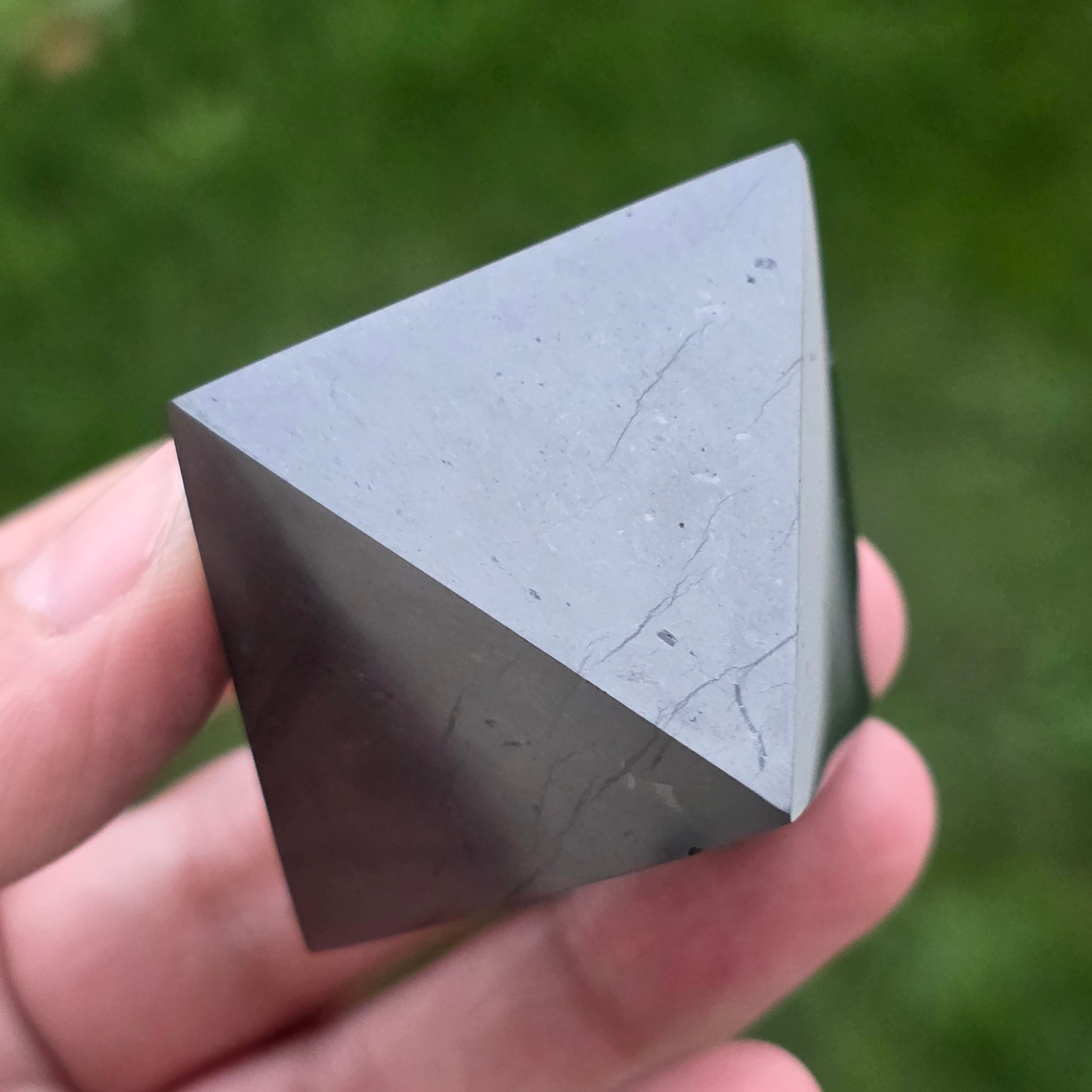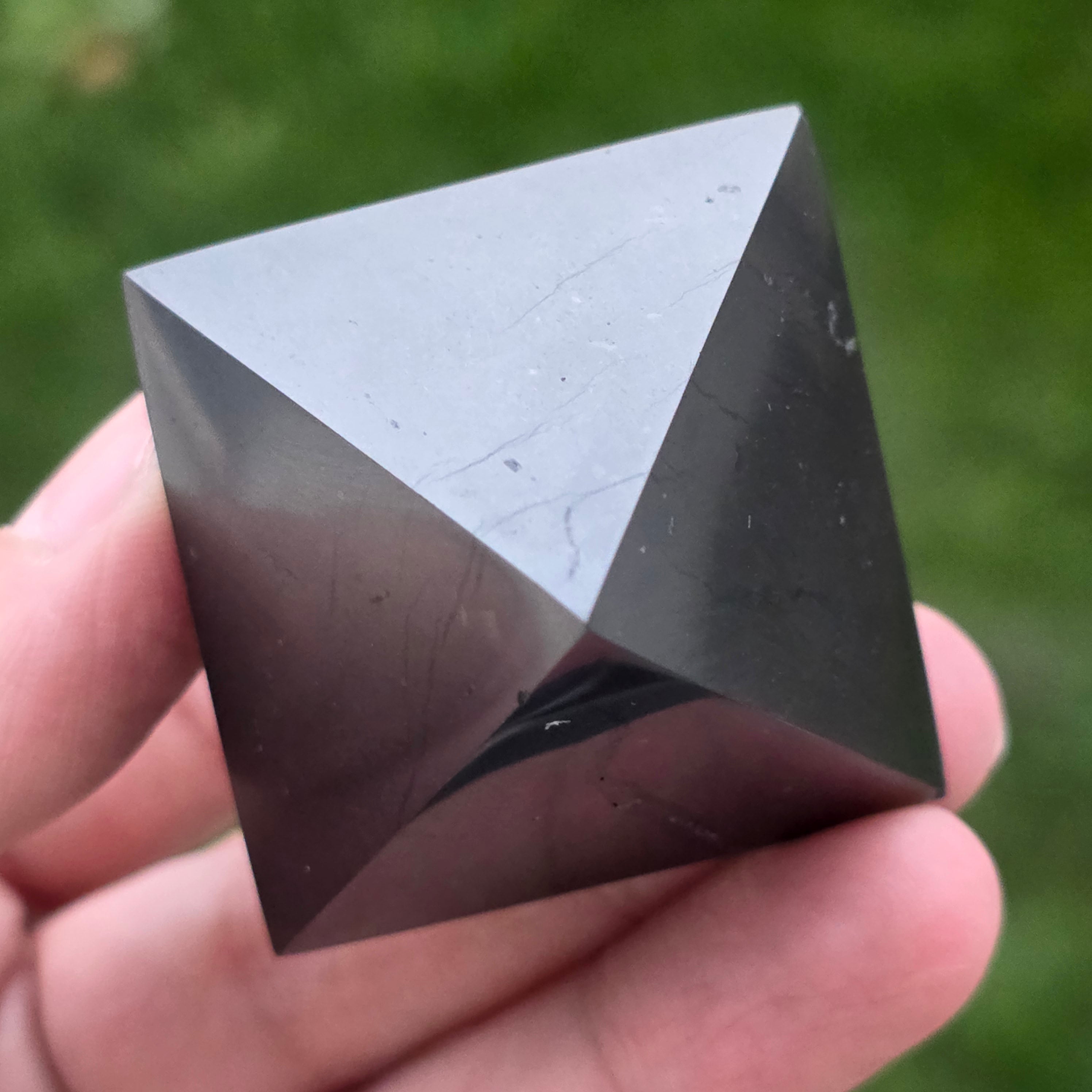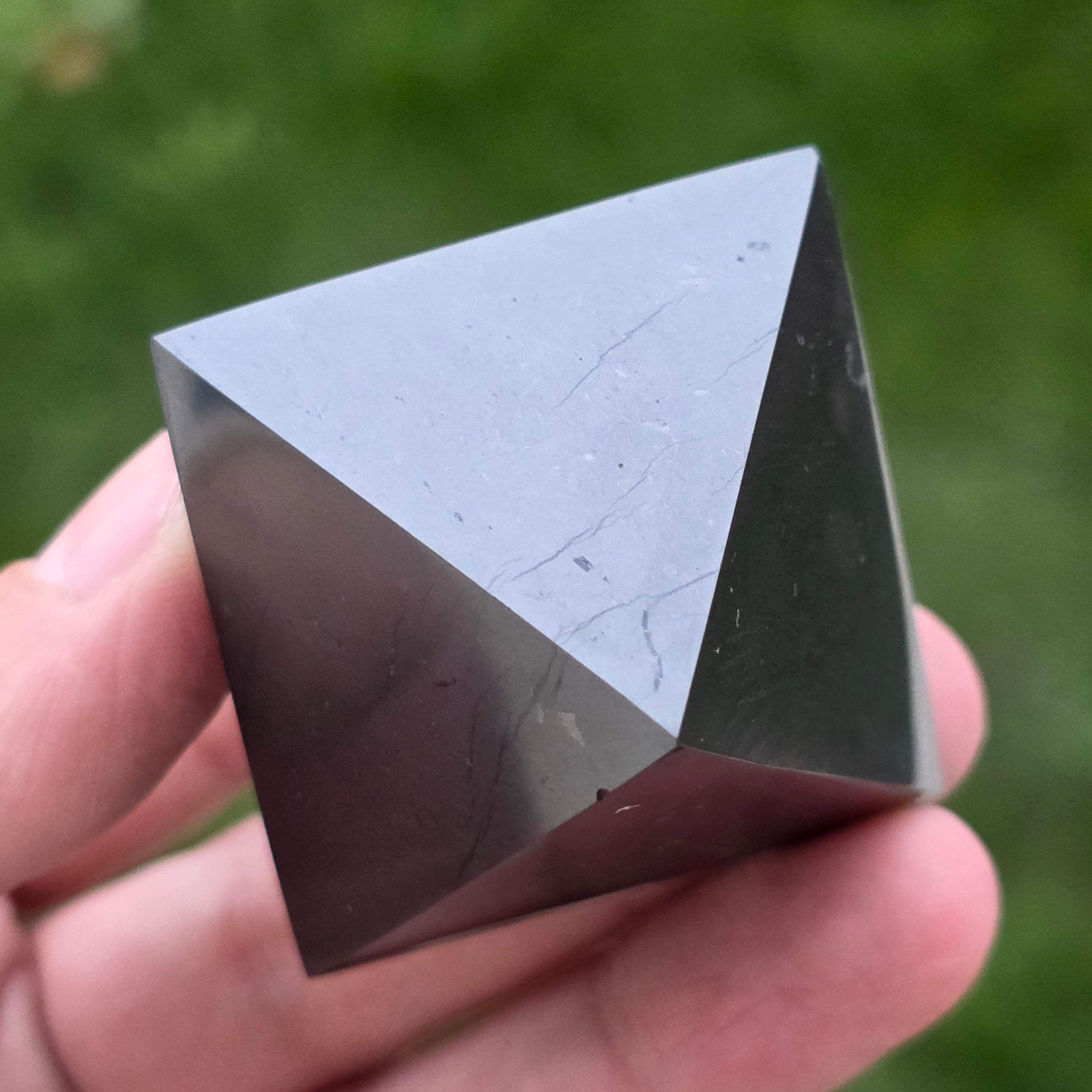 Oktadron z szungitu jest formą równowagi i klarowności umysłowej. W geometrii sakralnej oktadron jest związany z elementem powietrza oraz harmonizowaniem planu mentalnego i emocjonalnego. Jego idealnie symetryczna struktura wspiera wewnętrzny porządek, roztropność oraz zdolność patrzenia na sytuacje z jasnej i zrównoważonej perspektywy.