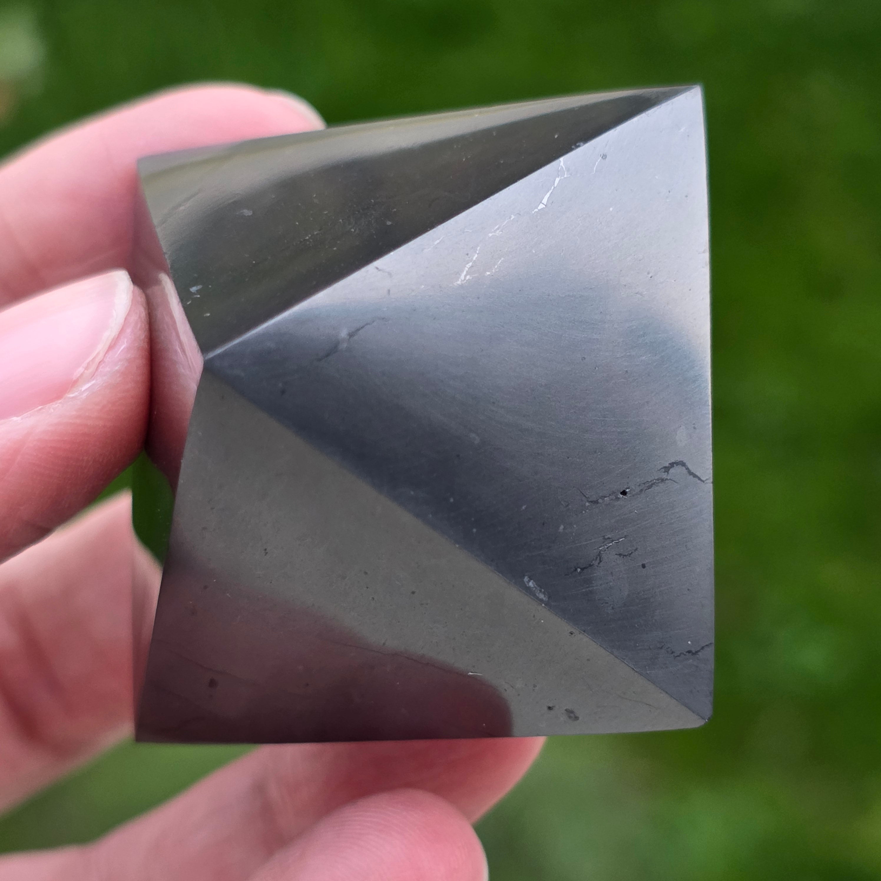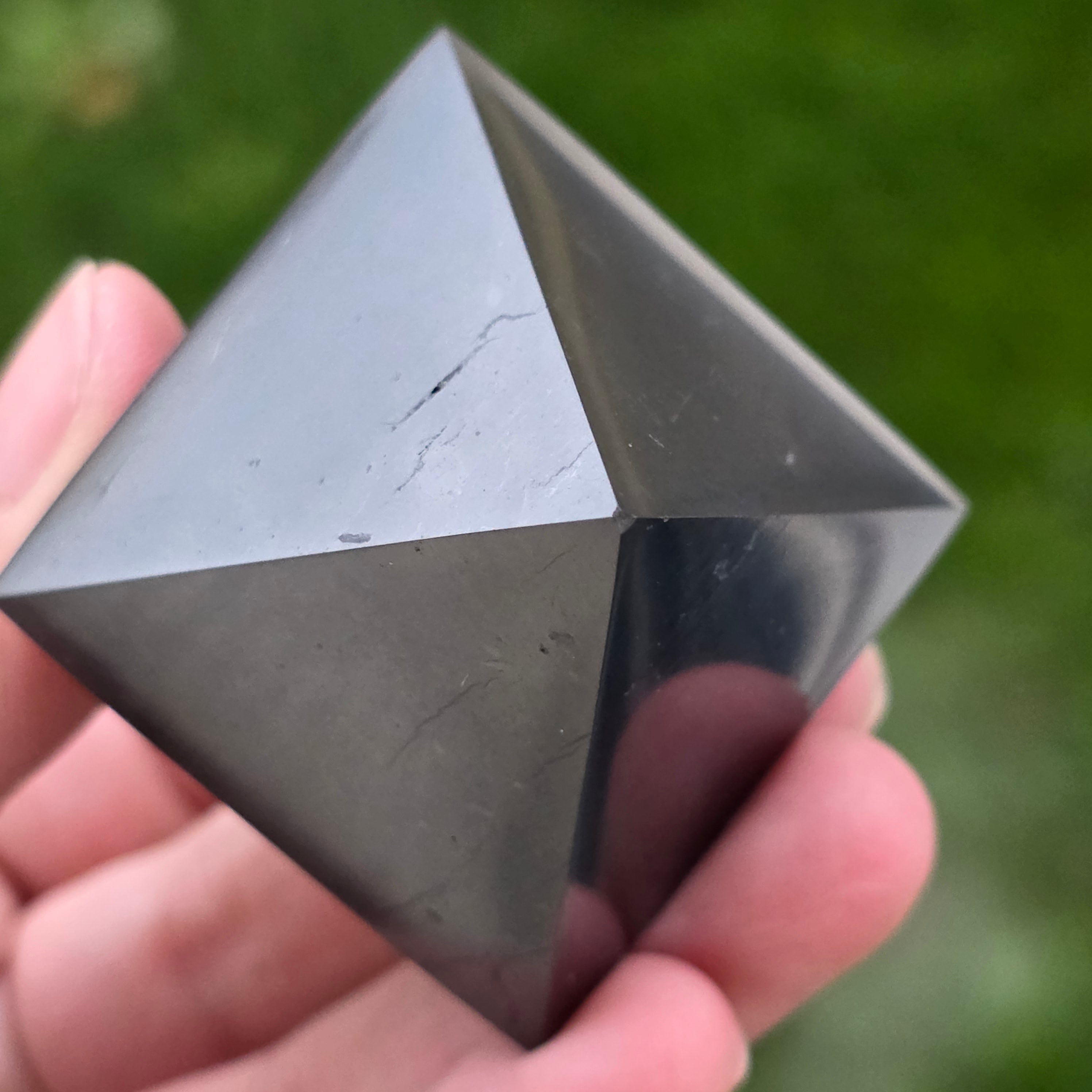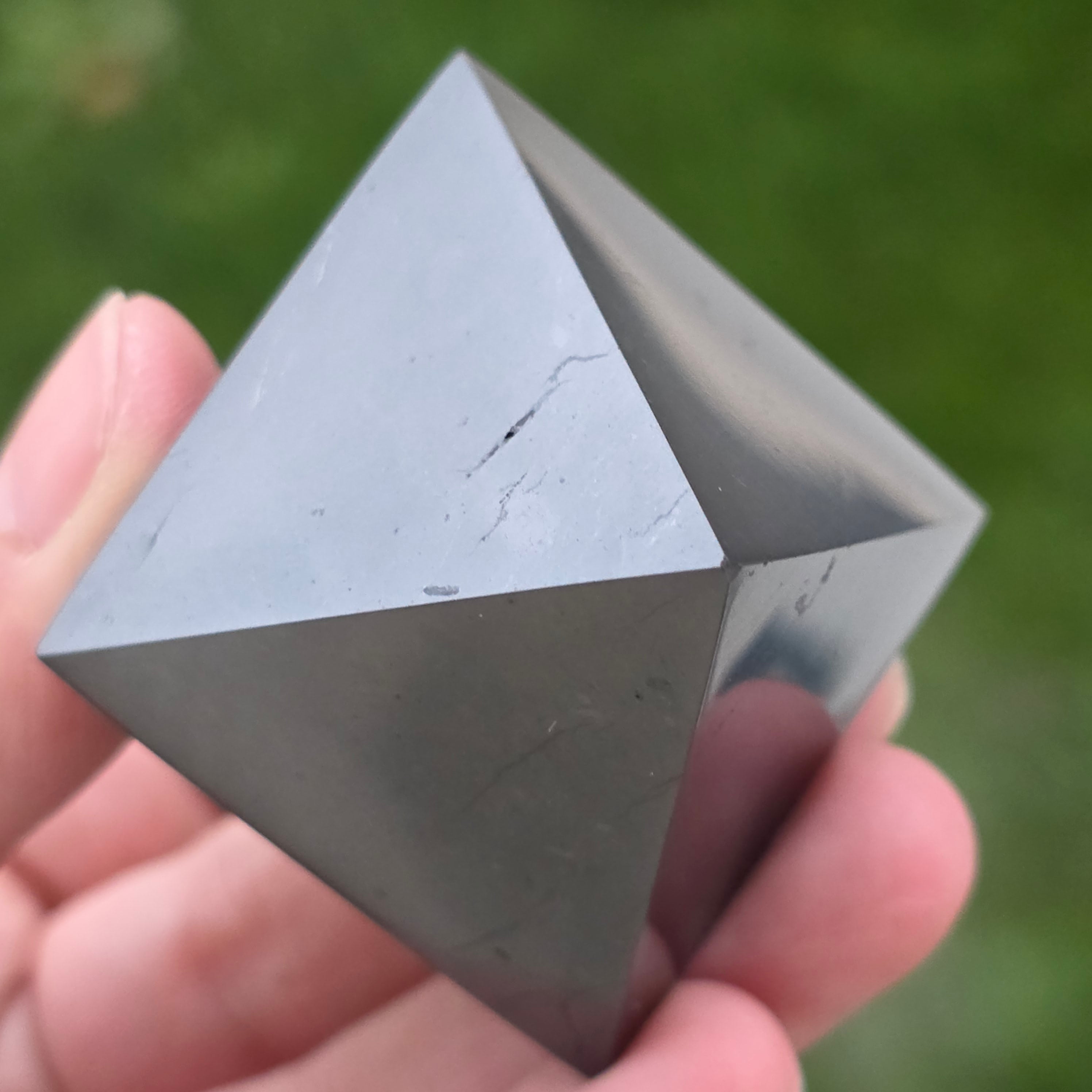 Oktadron z szungitu jest formą równowagi i klarowności umysłowej. W geometrii sakralnej oktadron jest związany z elementem powietrza oraz harmonizowaniem planu mentalnego i emocjonalnego. Jego idealnie symetryczna struktura wspiera wewnętrzny porządek, roztropność oraz zdolność patrzenia na sytuacje z jasnej i zrównoważonej perspektywy.