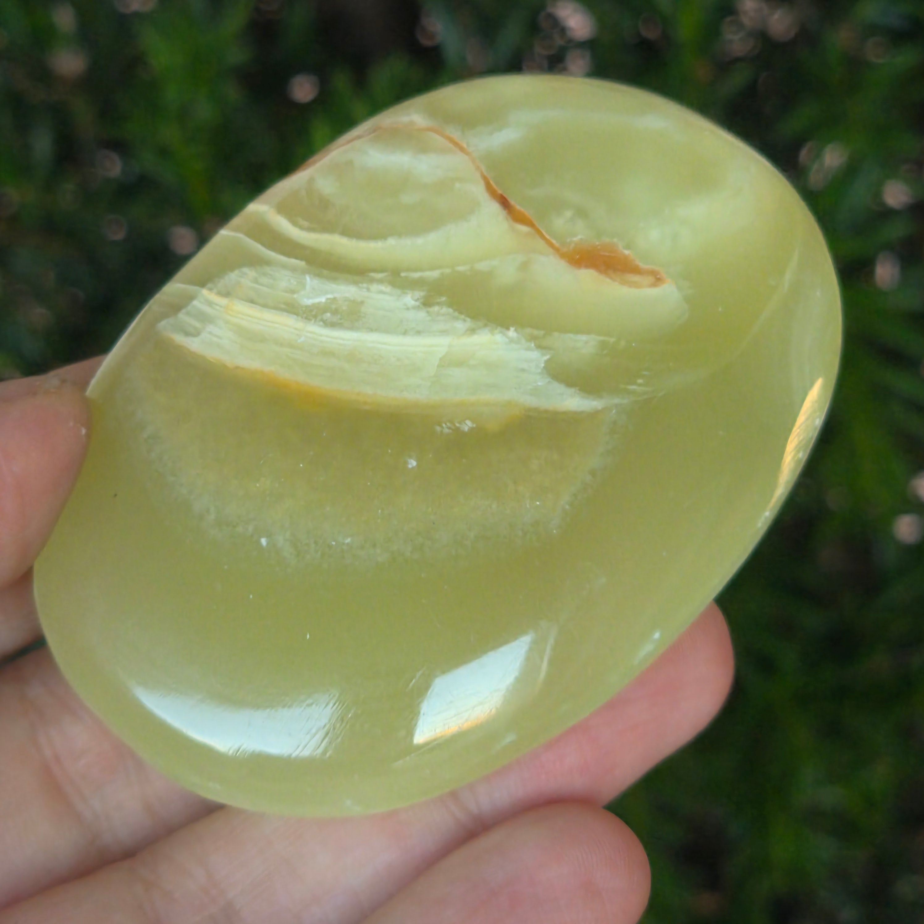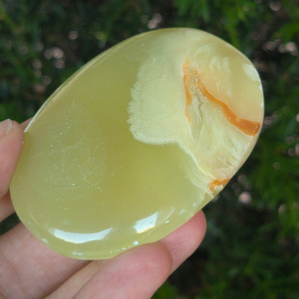 Trzymany w ręku, ten naturalny zielony palmowy onyks staje się sprzymierzeńcem równowagi, cichym przypomnieniem harmonii ciała i ducha. Jest idealny do medytacji, relaksu lub po prostu jako przedmiot dekoracyjny o delikatnej i wyrafinowanej energii.