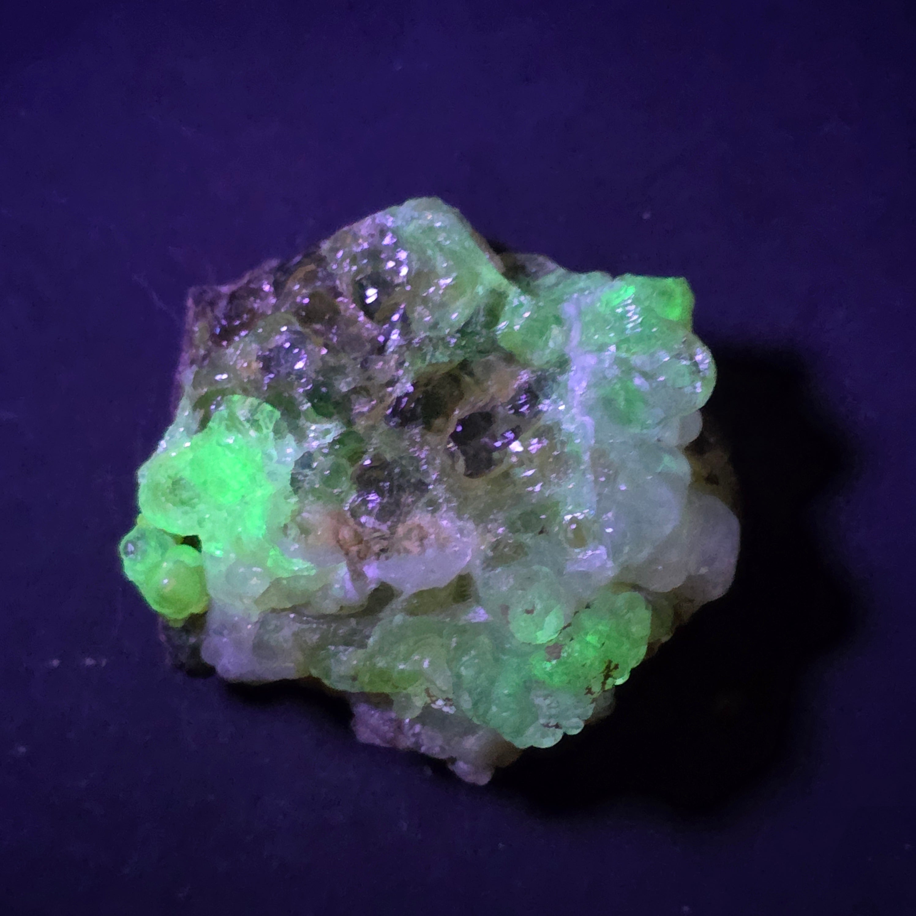 În lumină naturală, opalul hialit apare incolor până la alb-translucid, cu un aspect discret și elegant. Sub lumină ultravioletă însă, mineralul se transformă complet, emițând o strălucire verde neon, puternică și uniformă, efect care îl face extrem de căutat de colecționari. Această fluorescență se datorează urmelor naturale de uraniu din structura sa, prezente în cantități foarte mici și stabile.