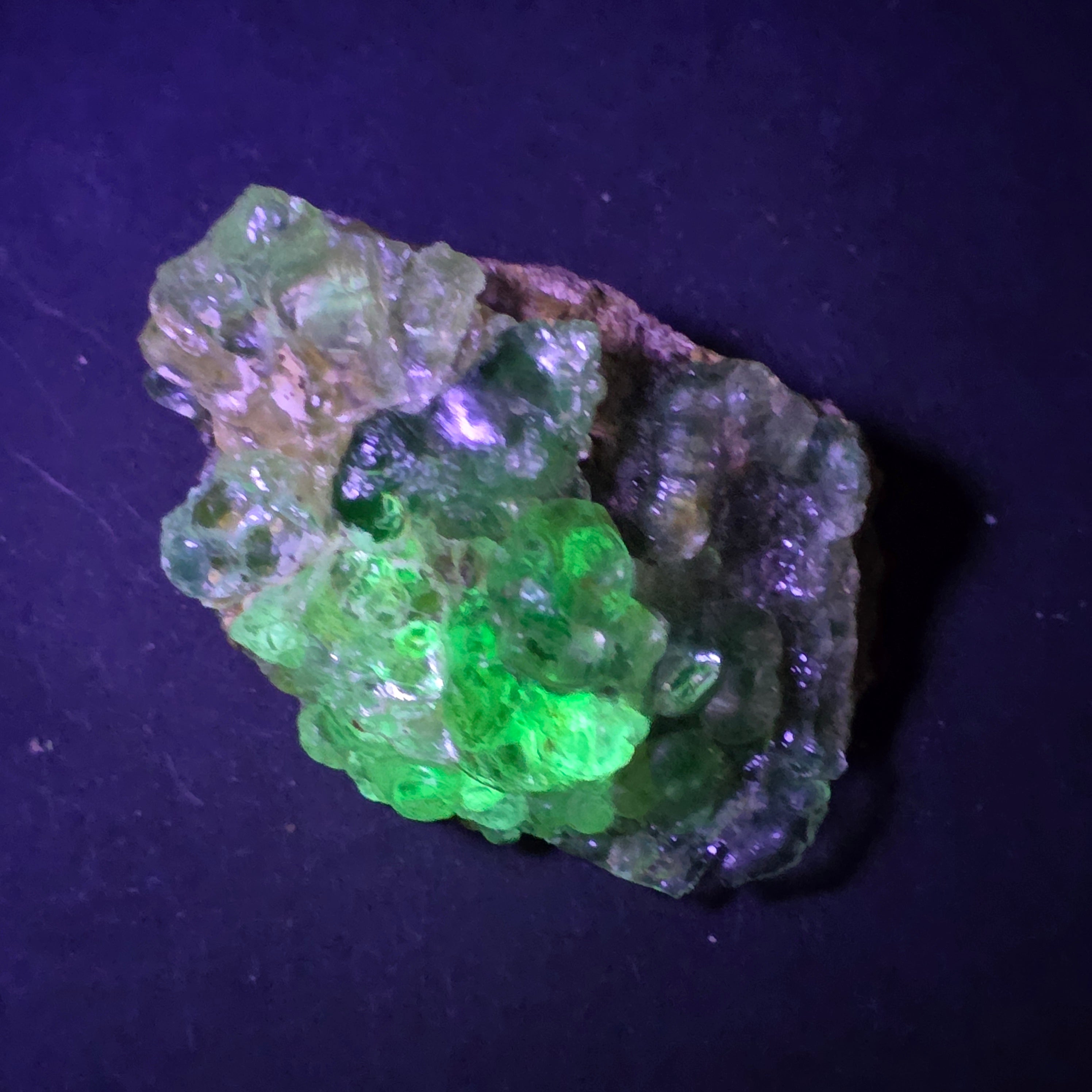 În lumină naturală, opalul hialit apare incolor până la alb-translucid, cu un aspect discret și elegant. Sub lumină ultravioletă însă, mineralul se transformă complet, emițând o strălucire verde neon, puternică și uniformă, efect care îl face extrem de căutat de colecționari. Această fluorescență se datorează urmelor naturale de uraniu din structura sa, prezente în cantități foarte mici și stabile.