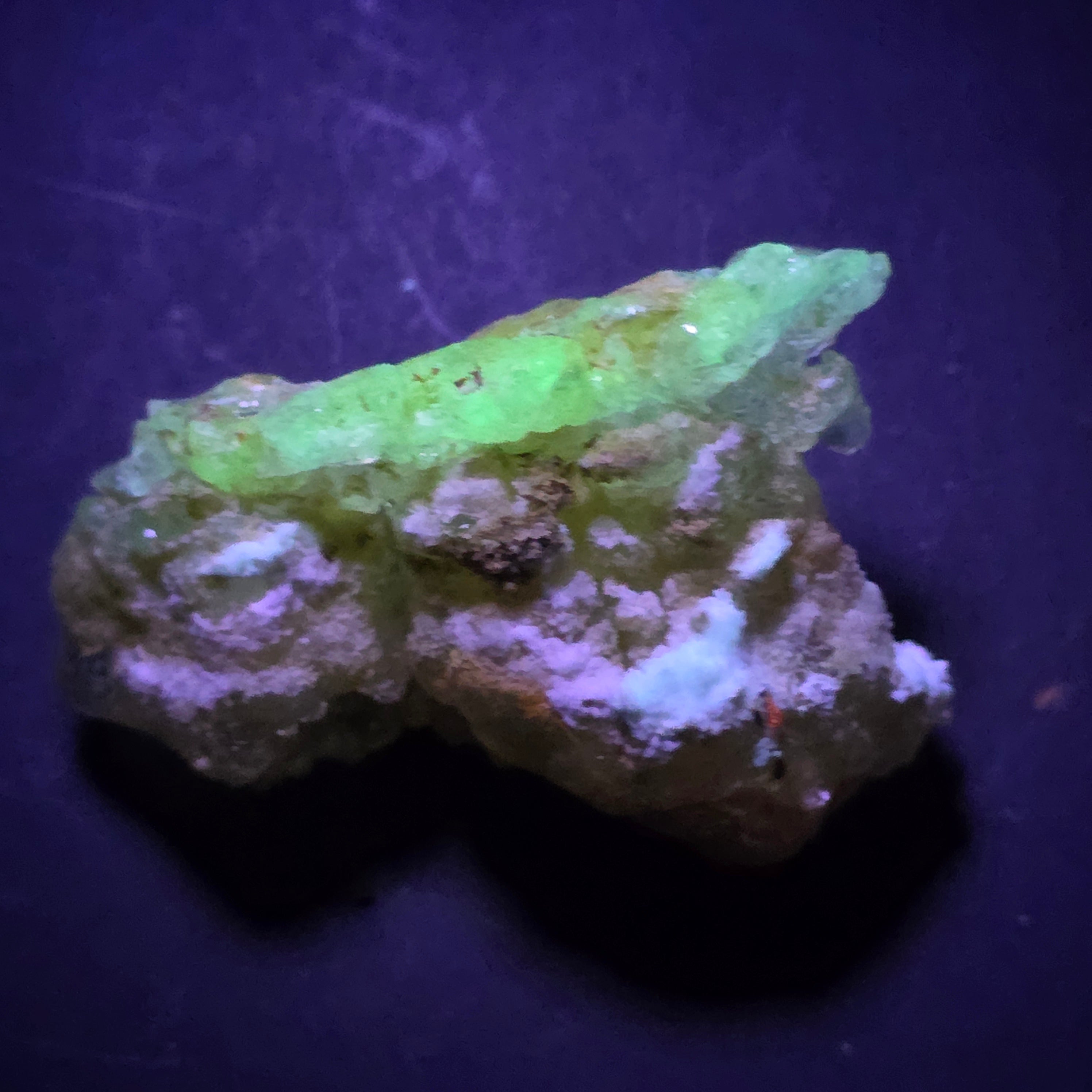 În lumină naturală, opalul hialit apare incolor până la alb-translucid, cu un aspect discret și elegant. Sub lumină ultravioletă însă, mineralul se transformă complet, emițând o strălucire verde neon, puternică și uniformă, efect care îl face extrem de căutat de colecționari. Această fluorescență se datorează urmelor naturale de uraniu din structura sa, prezente în cantități foarte mici și stabile.