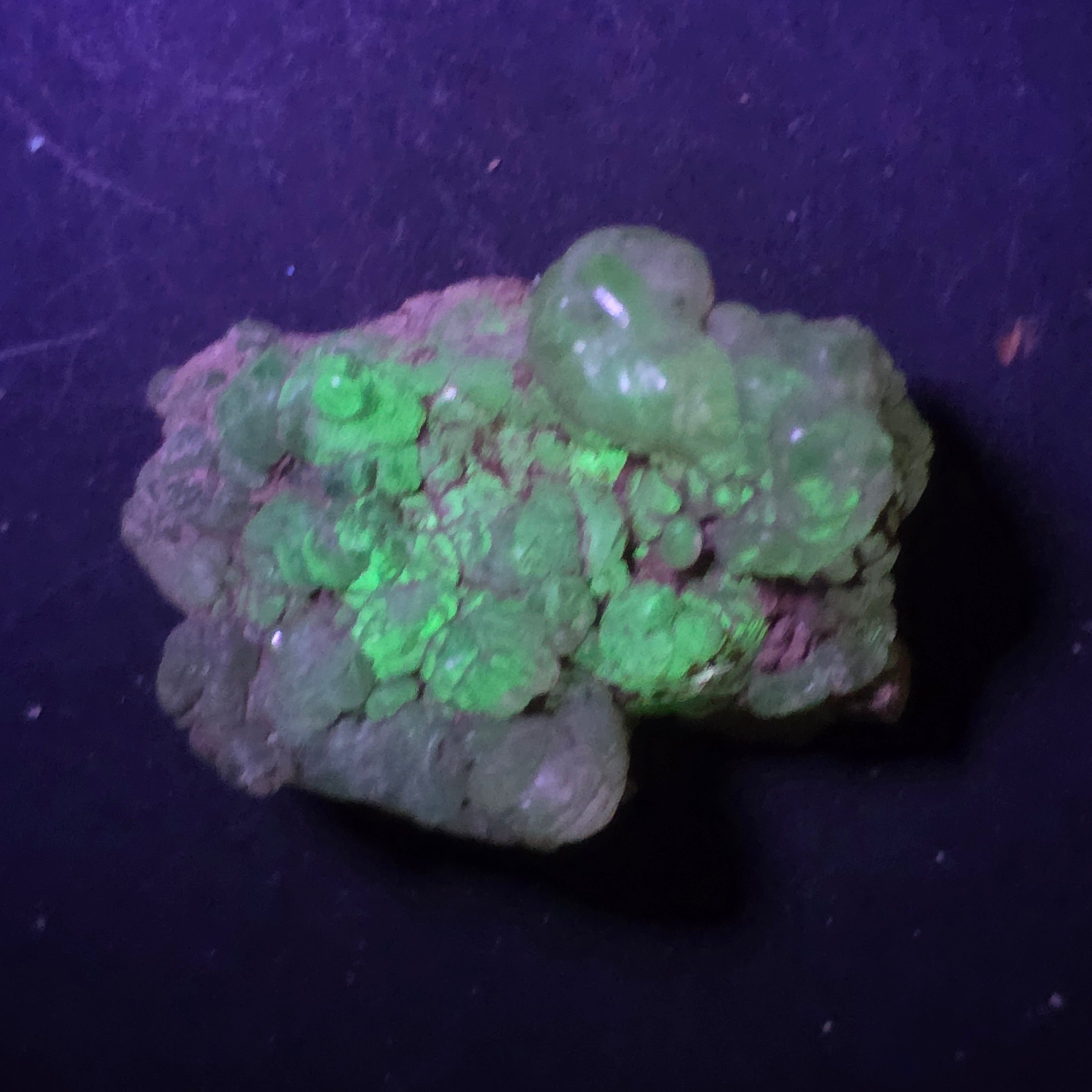 În lumină naturală, opalul hialit apare incolor până la alb-translucid, cu un aspect discret și elegant. Sub lumină ultravioletă însă, mineralul se transformă complet, emițând o strălucire verde neon, puternică și uniformă, efect care îl face extrem de căutat de colecționari. Această fluorescență se datorează urmelor naturale de uraniu din structura sa, prezente în cantități foarte mici și stabile.