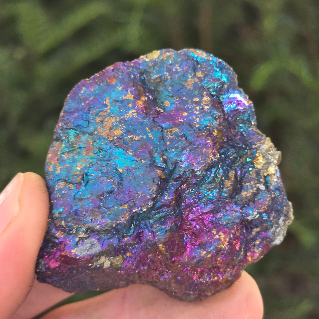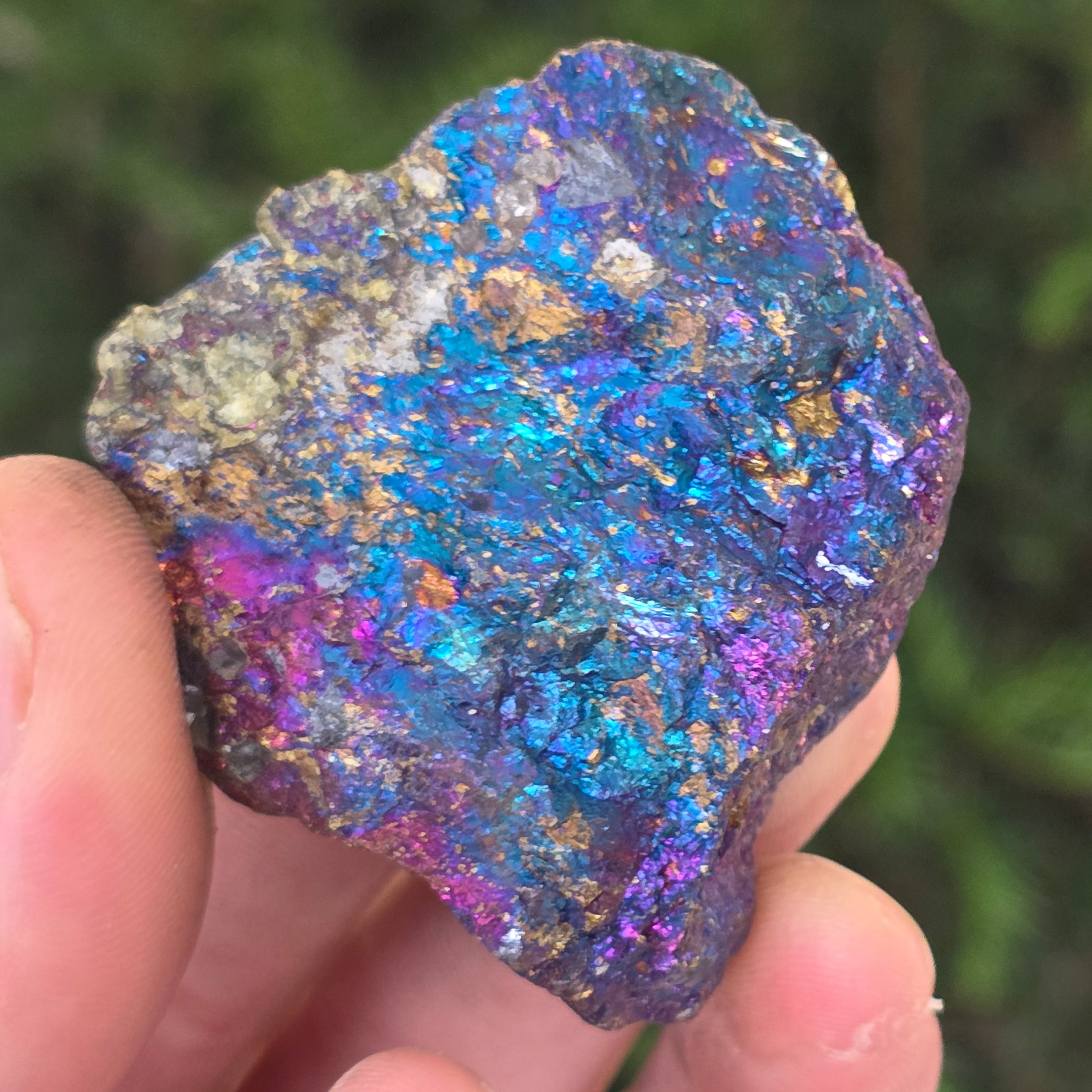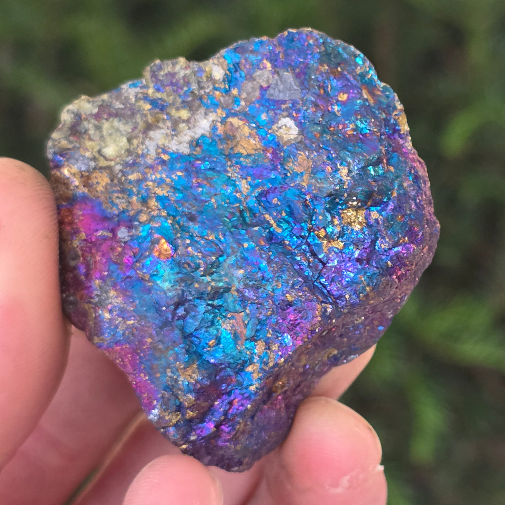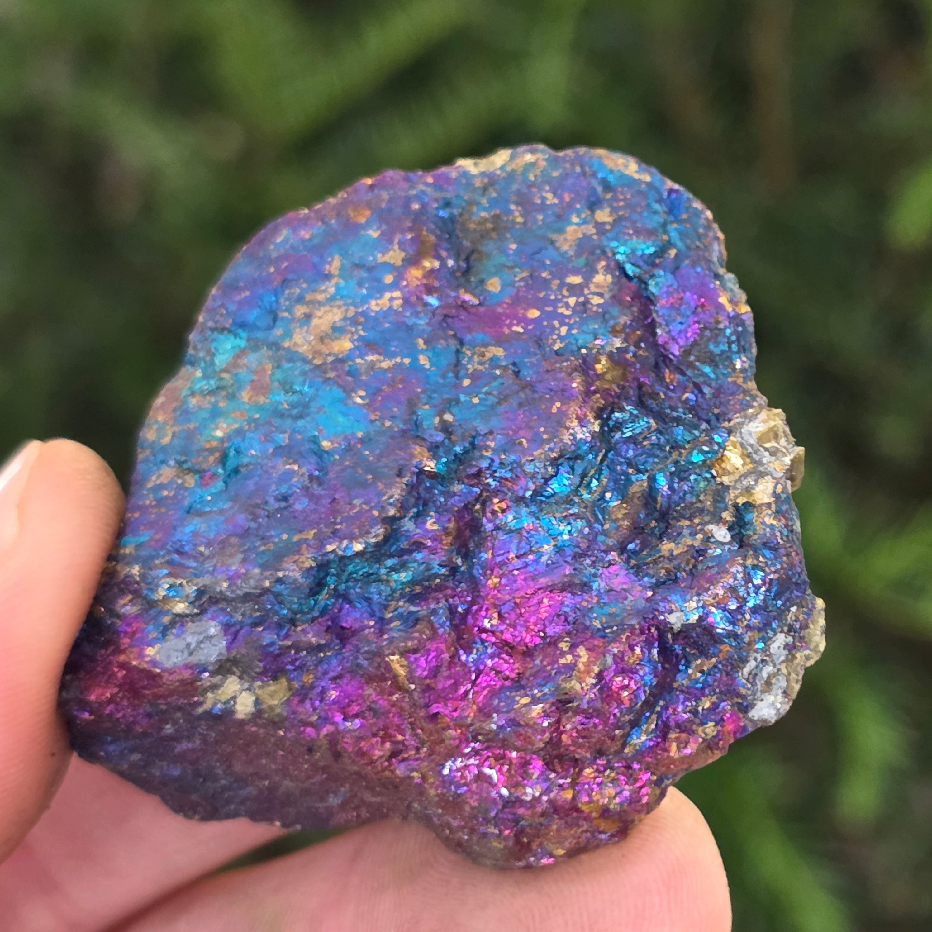Blue Calcopirita, znany również jako Opalizujące zapalenie kalcynowe, jest rodzajem zapalenia cielęcia, które ma jasne odcienie niebieskich, fioletowych, zielonych lub innych opalizujących kolorów. To nawadnianie jest spowodowane cienką warstwą utleniania na powierzchni minerału, naturalny proces, który występuje, gdy zapalenie kalcyny jest narażone na powietrze i wilgoć przez długi okres.