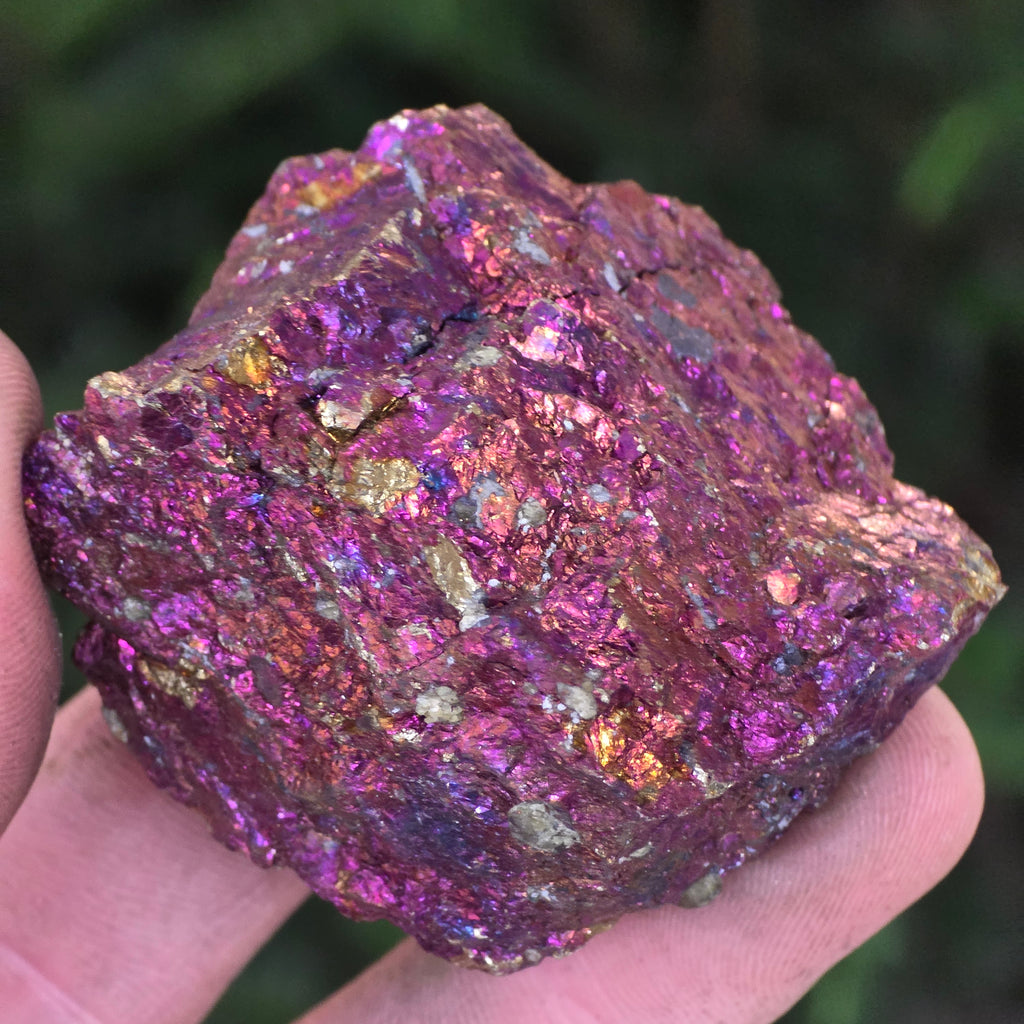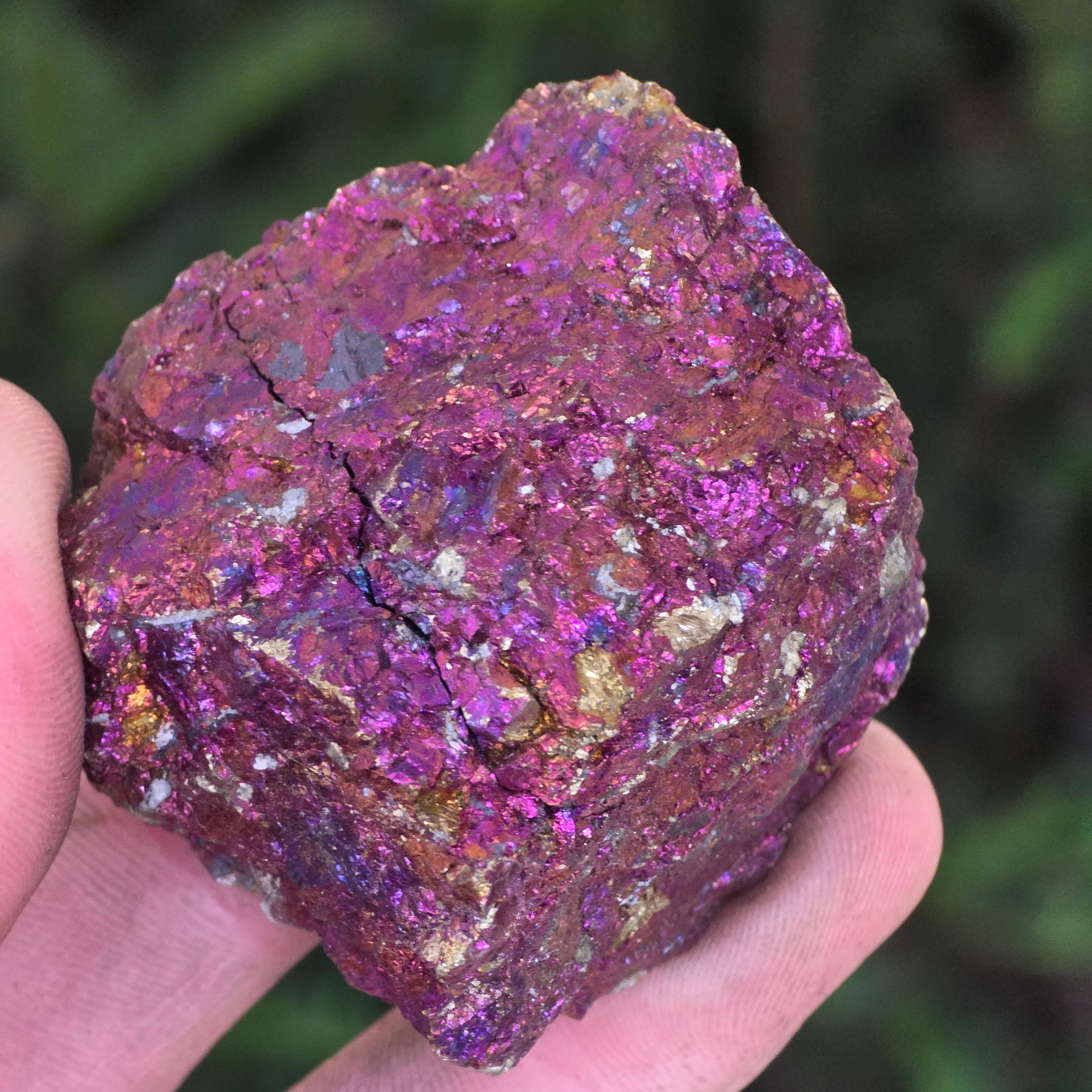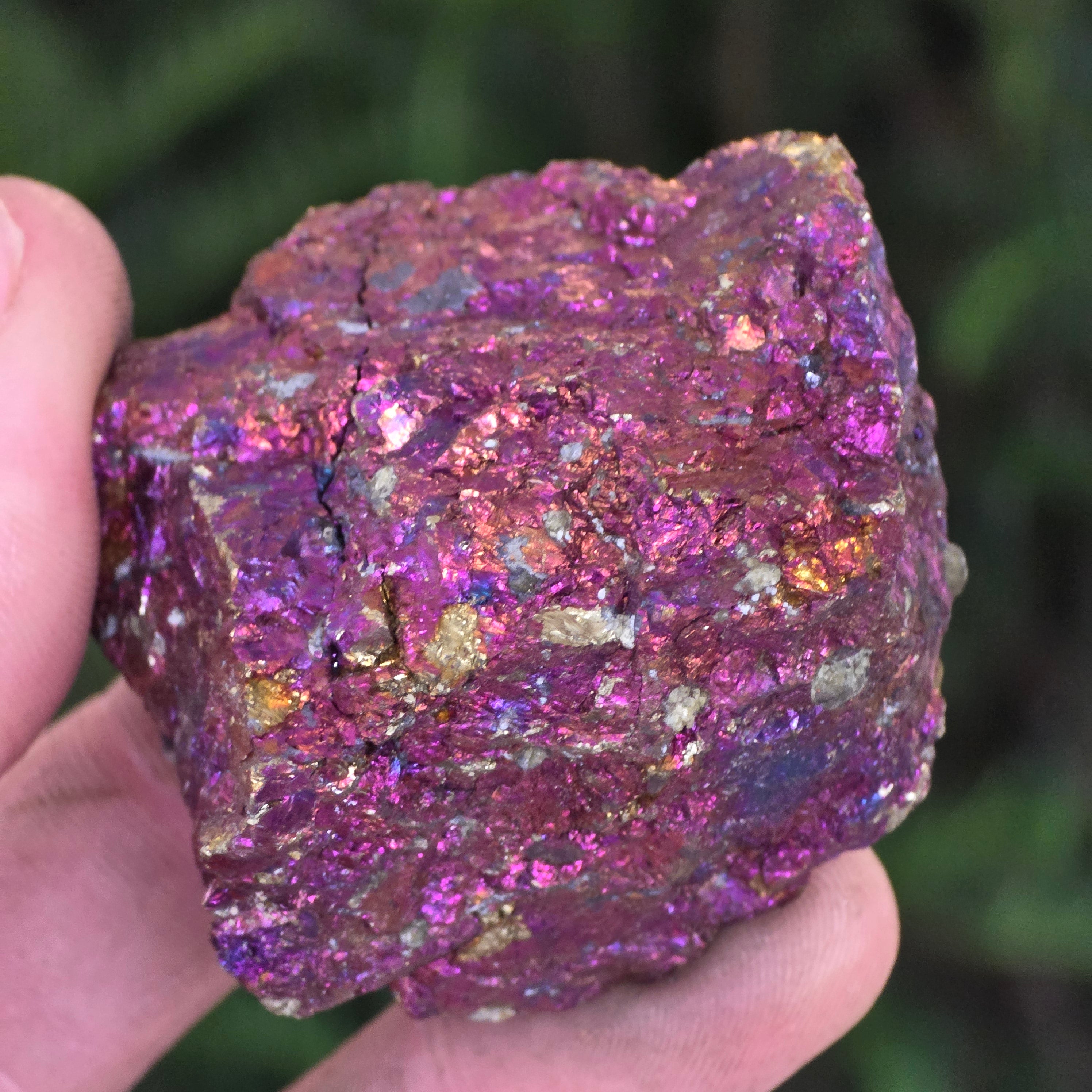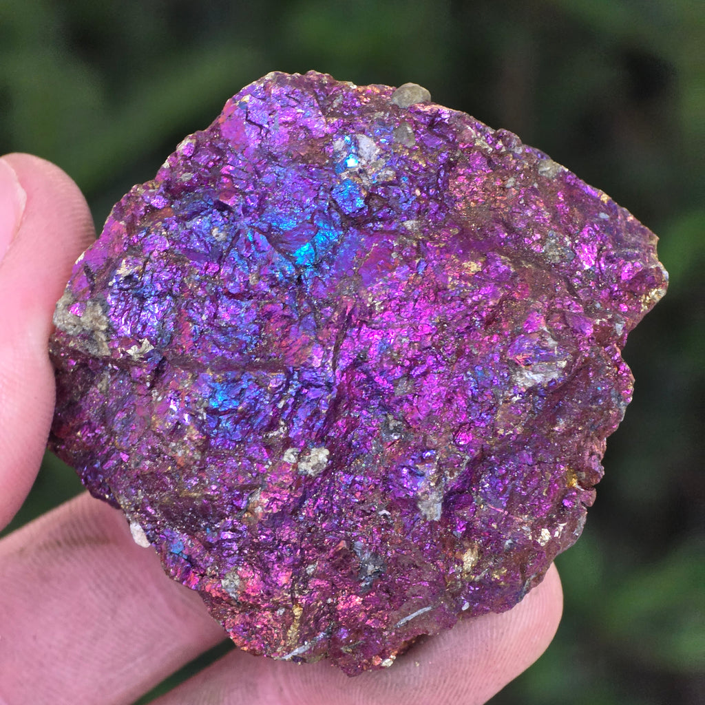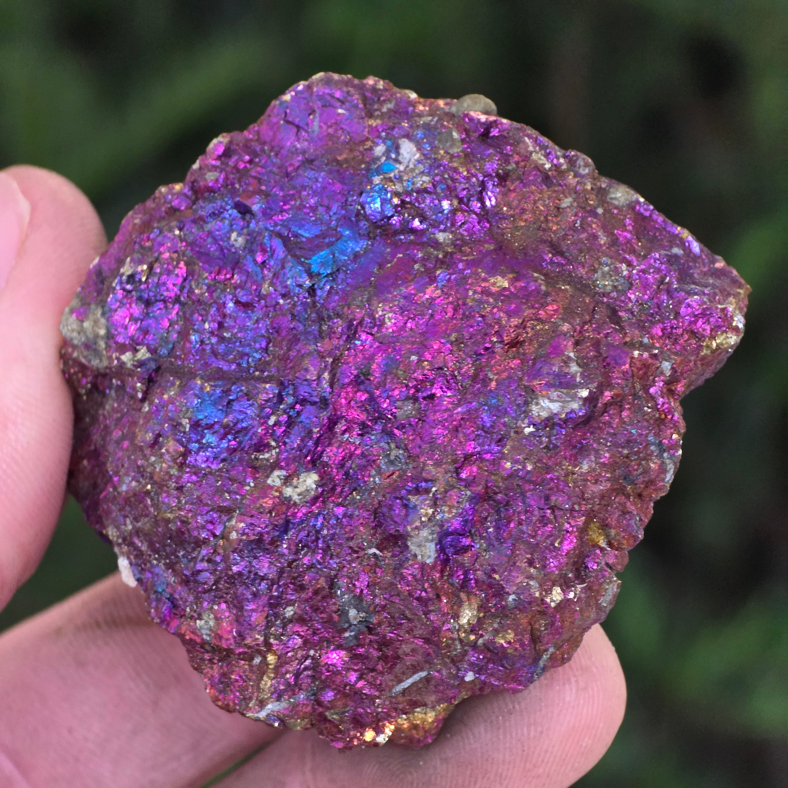 Blue Calcopirita, znany również jako Opalizujące zapalenie kalcynowe, jest rodzajem zapalenia cielęcia, które ma jasne odcienie niebieskich, fioletowych, zielonych lub innych opalizujących kolorów. To nawadnianie jest spowodowane cienką warstwą utleniania na powierzchni minerału, naturalny proces występujący, gdy zapalenie kalcyny jest narażone na powietrze i wilgoć przez długi okres.
