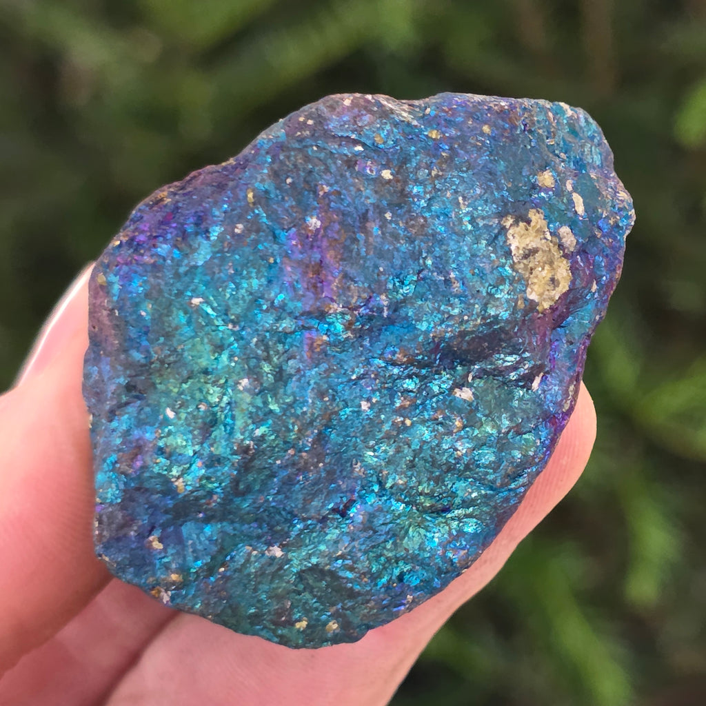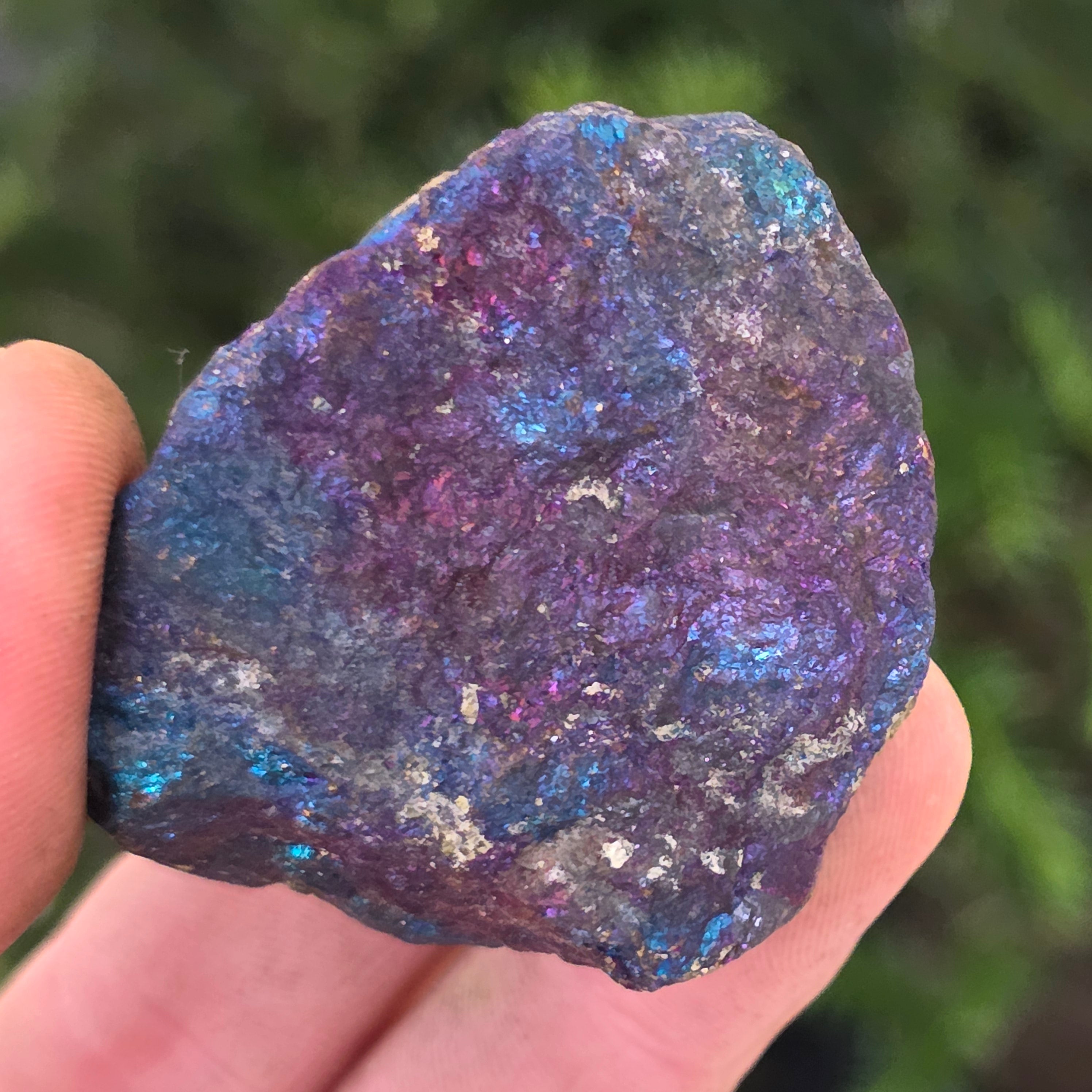 Niebieska chalkopiryt, znana również jako iryzująca chalkopiryt, jest rodzajem chalkopirytu, który wykazuje błyszczące odcienie niebieskiego, fioletowego, zielonego lub innych kolorów iryzujących. Ten efekt iryzacji jest spowodowany cienką warstwą utleniania na powierzchni minerału, co jest naturalnym procesem, który zachodzi, gdy chalkopiryt jest wystawiony na działanie powietrza i wilgoci przez dłuższy czas.