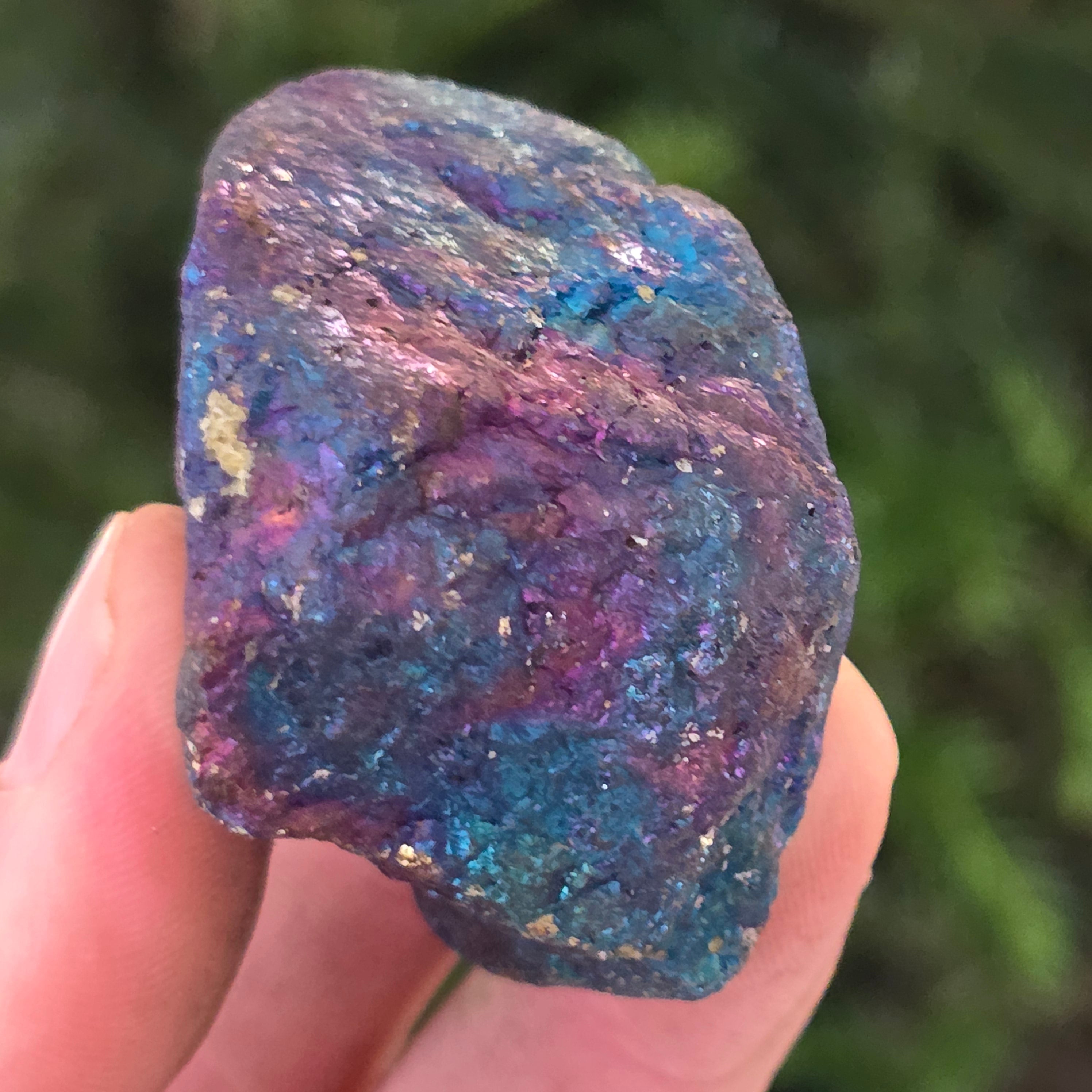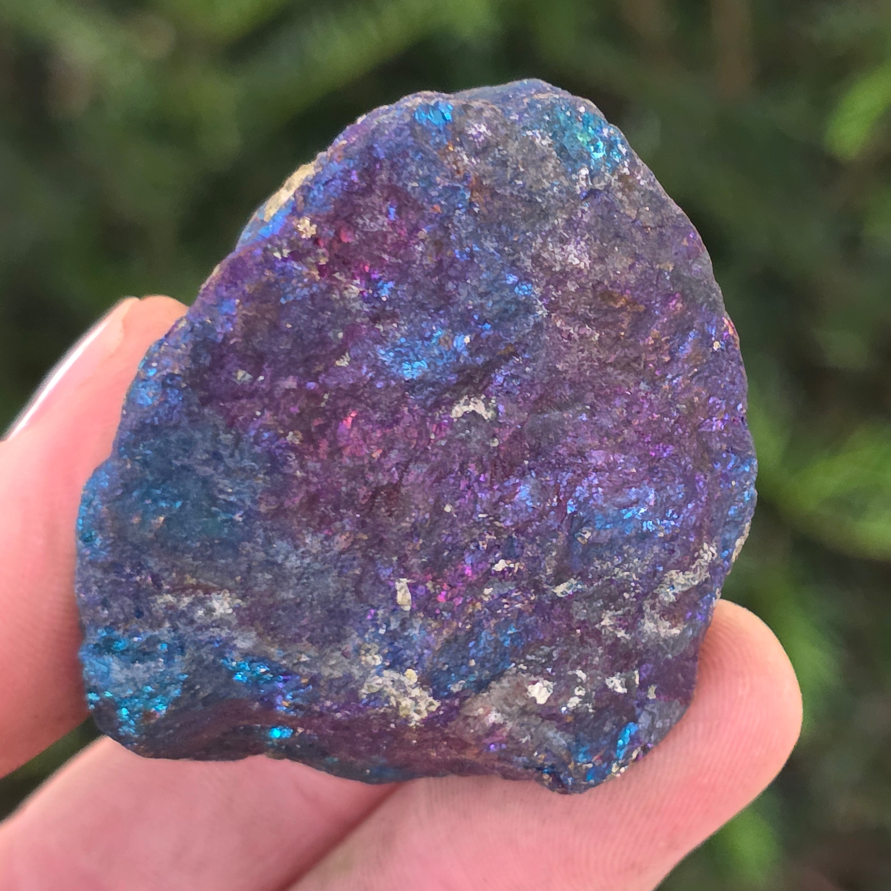 Niebieska i fioletowa chalkopiryt są kojarzone z rozwojem duchowym, intuicją i łączeniem się z wyższymi energiami. Uważa się, że pomagają w uspokojeniu umysłu i stymulowaniu kreatywności. Jej iryzujące odcienie symbolicznie związane są z równowagą i harmonią.
