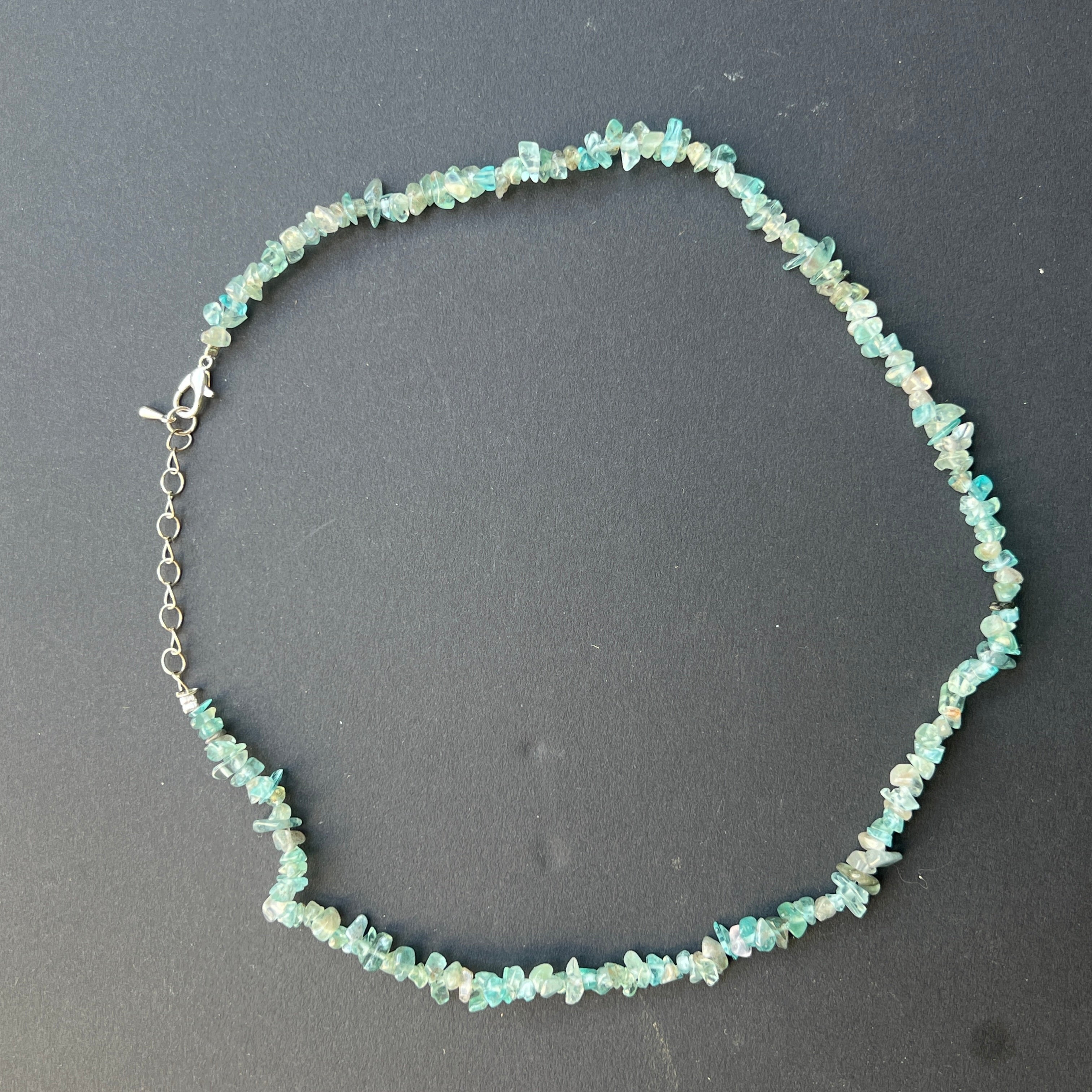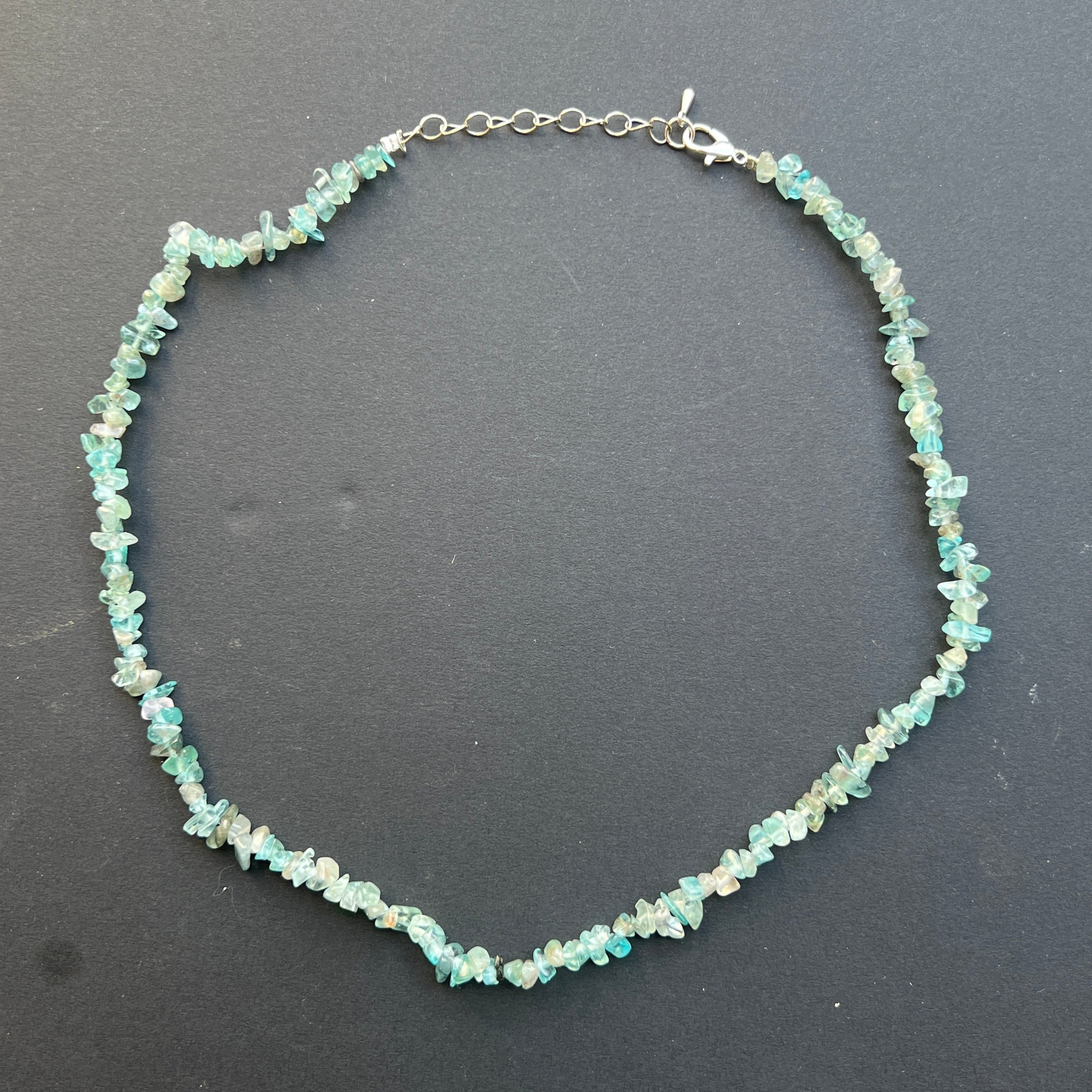 Dodaj dodatkowego koloru i energii swoim strojom dzięki temu naszyjnikowi wykonanemu z naturalnych przezroczystych wiórków apatytu, osadzonemu na 40 cm cienkim łańcuszku, z 5 cm metalowym przedłużeniem dla idealnego dopasowania.
