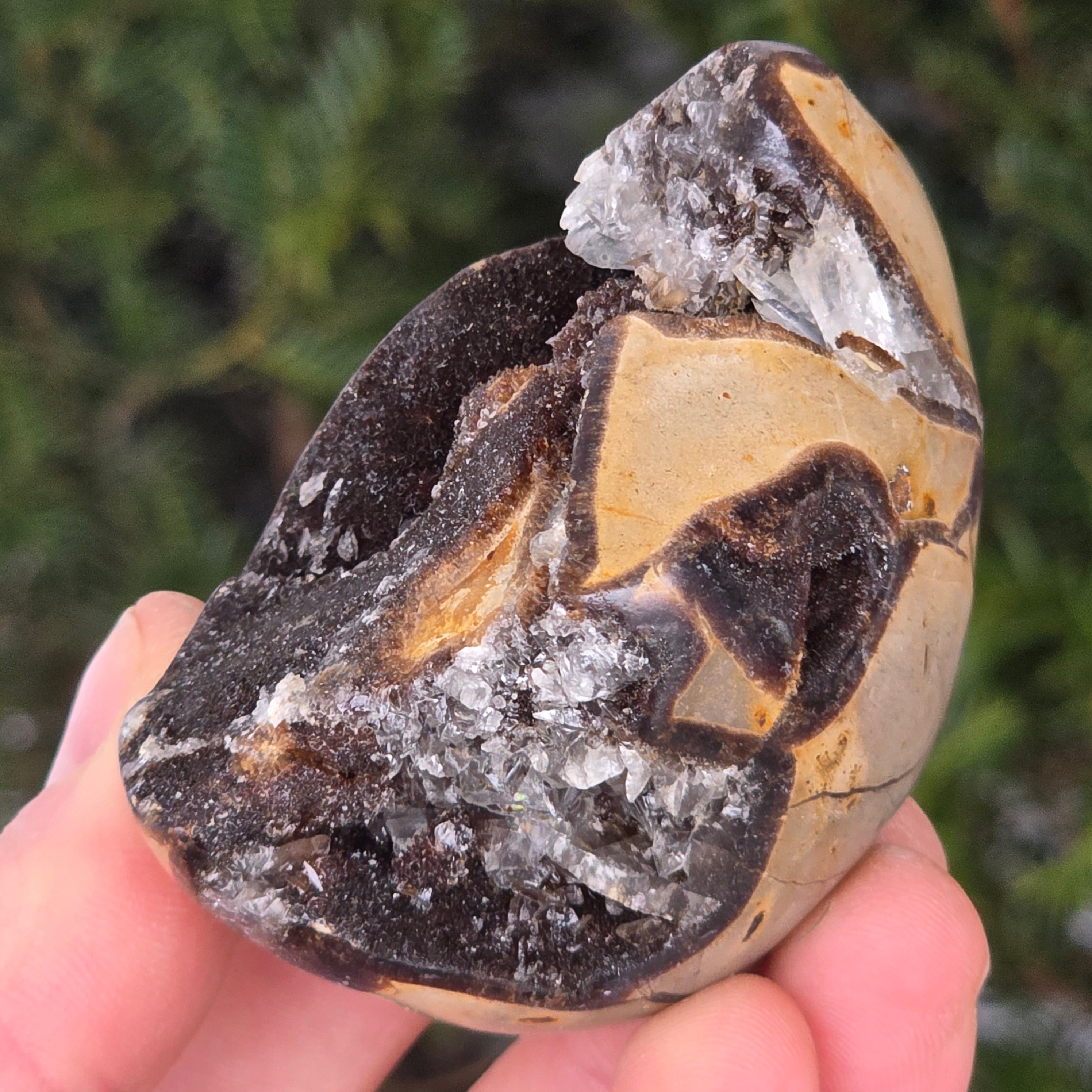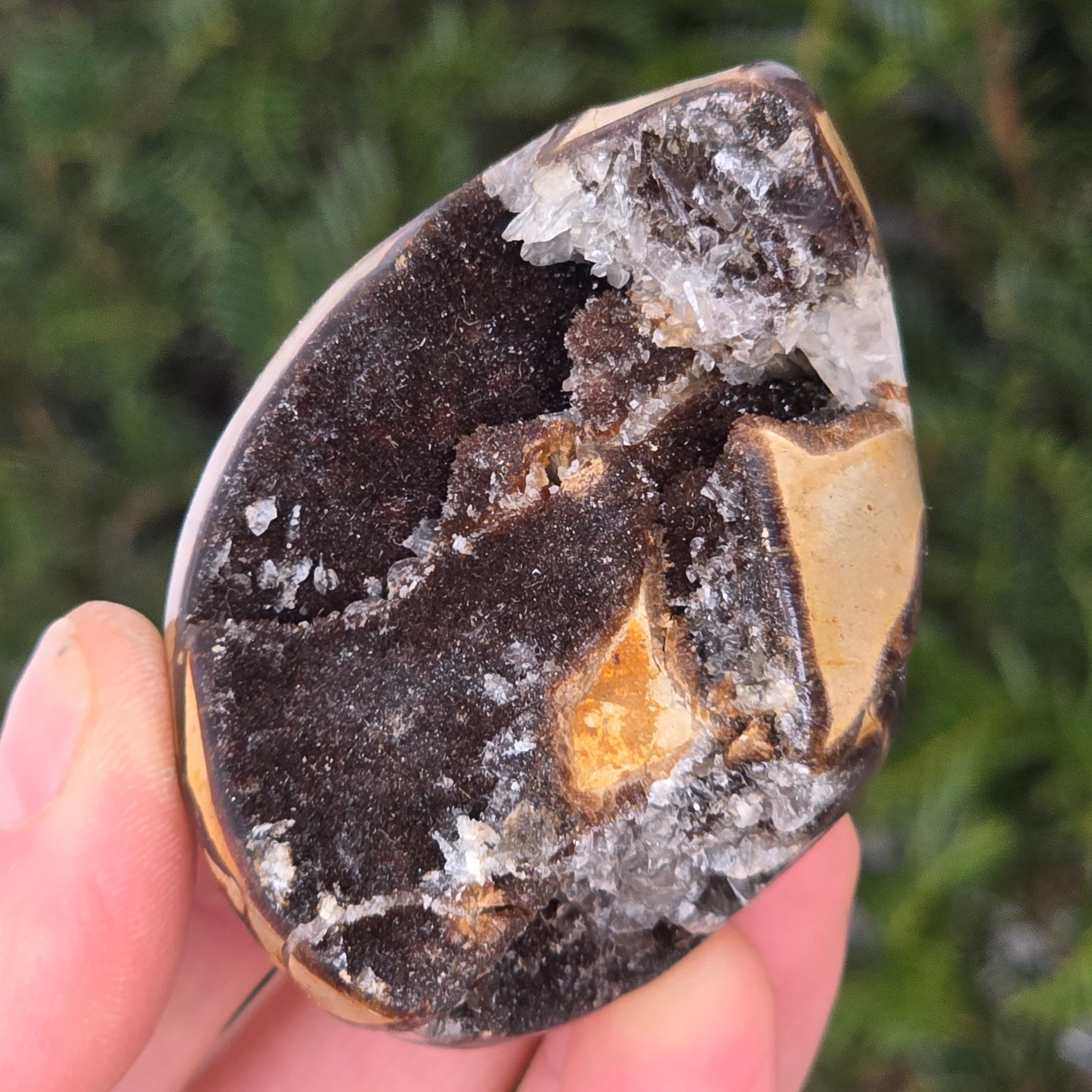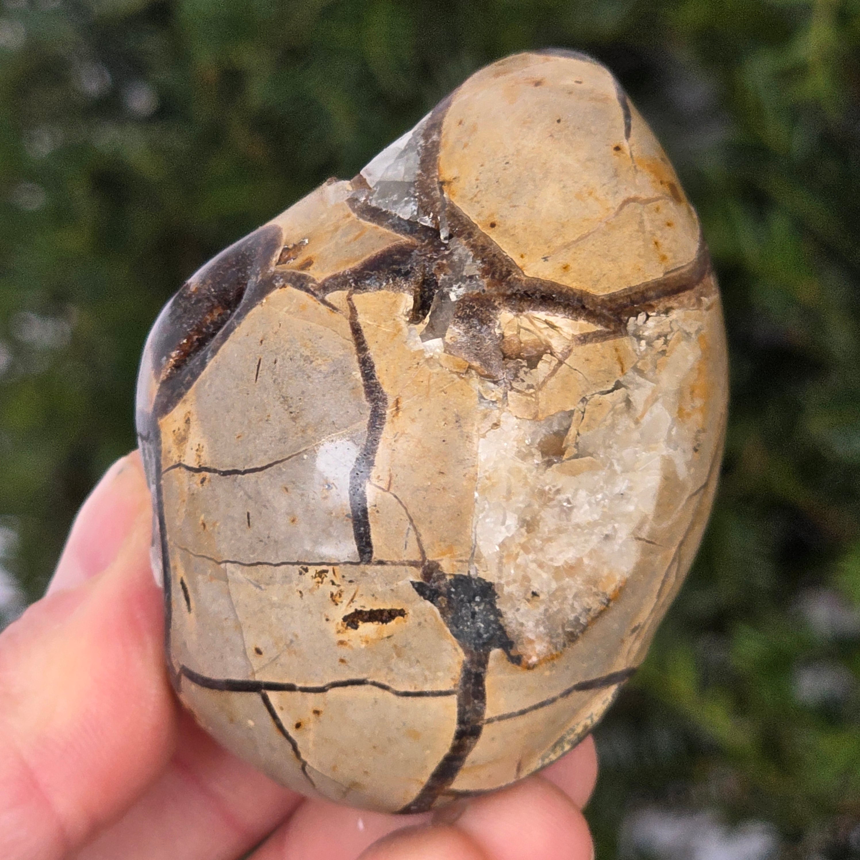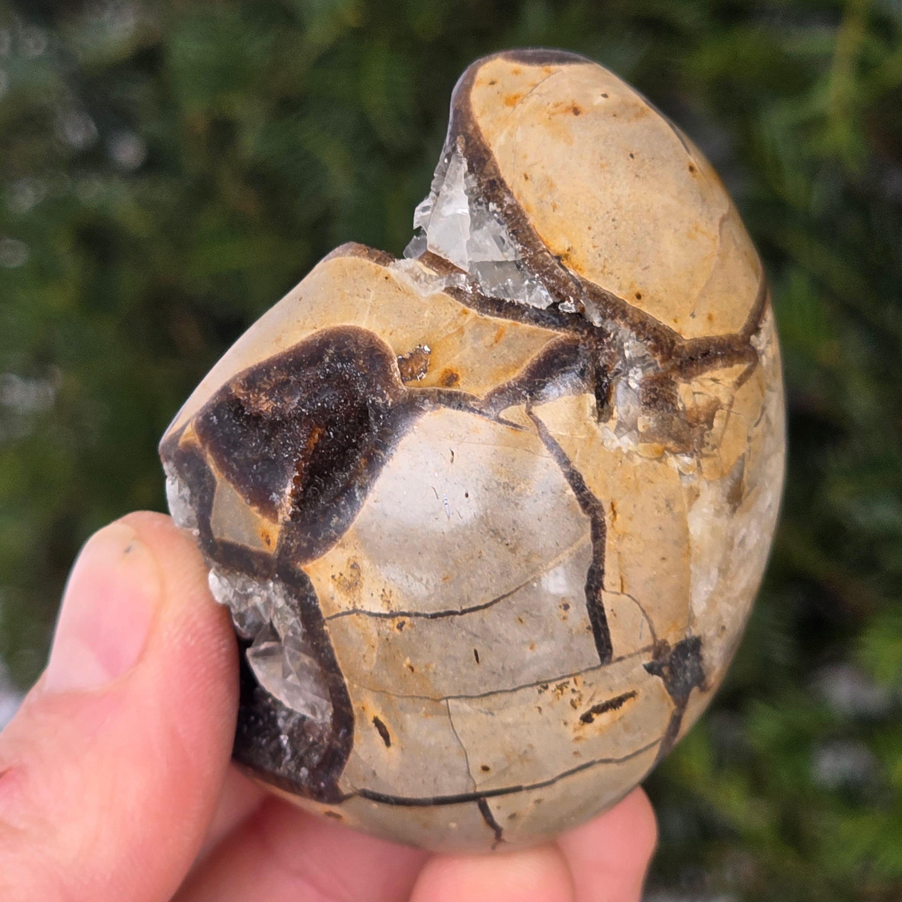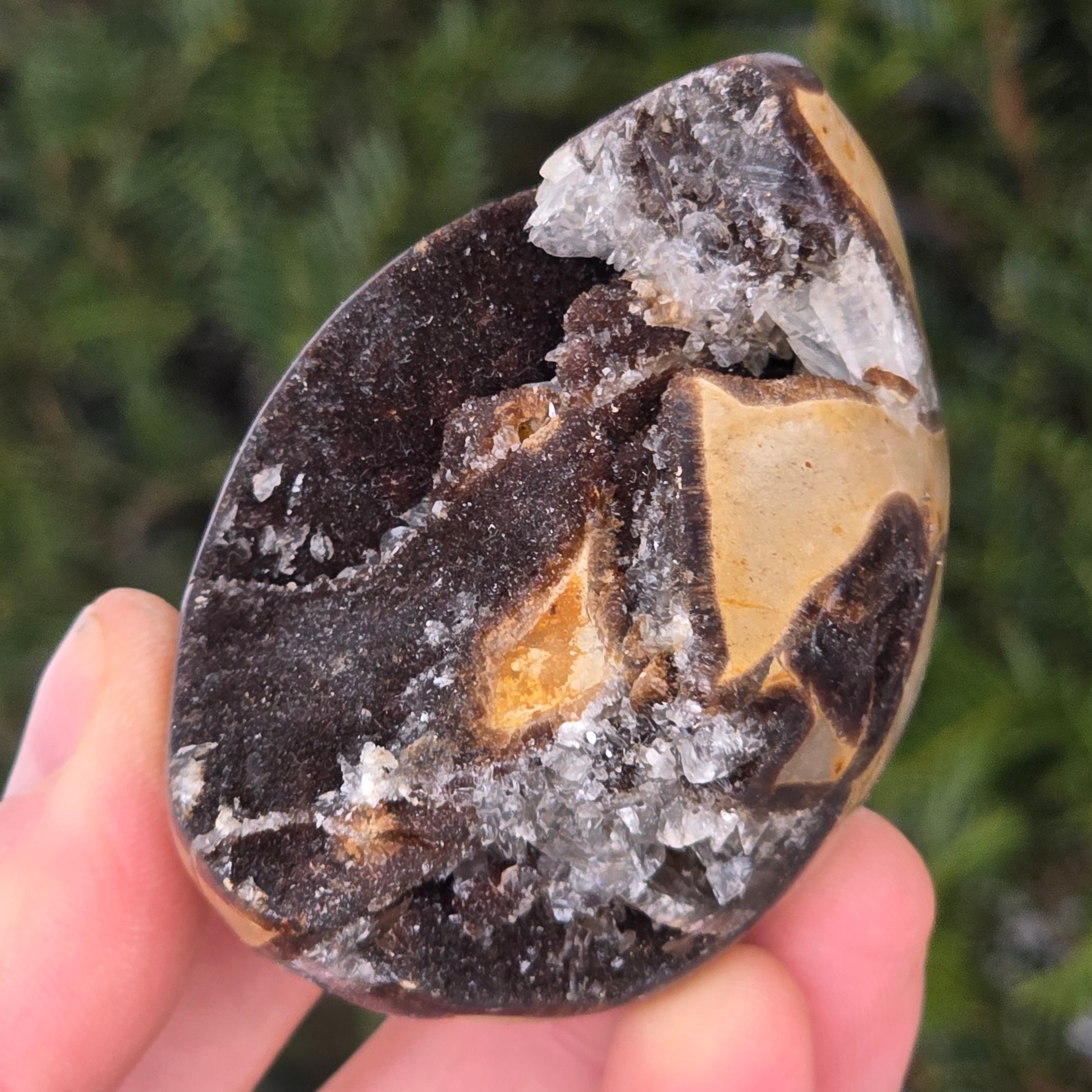 Septaria składa się z kalcytu, limonitu, gipsu i barytyny, minerałów, które tworzą unikalną grę w tym kamieniu i nadają mu wyjątkowy wygląd.