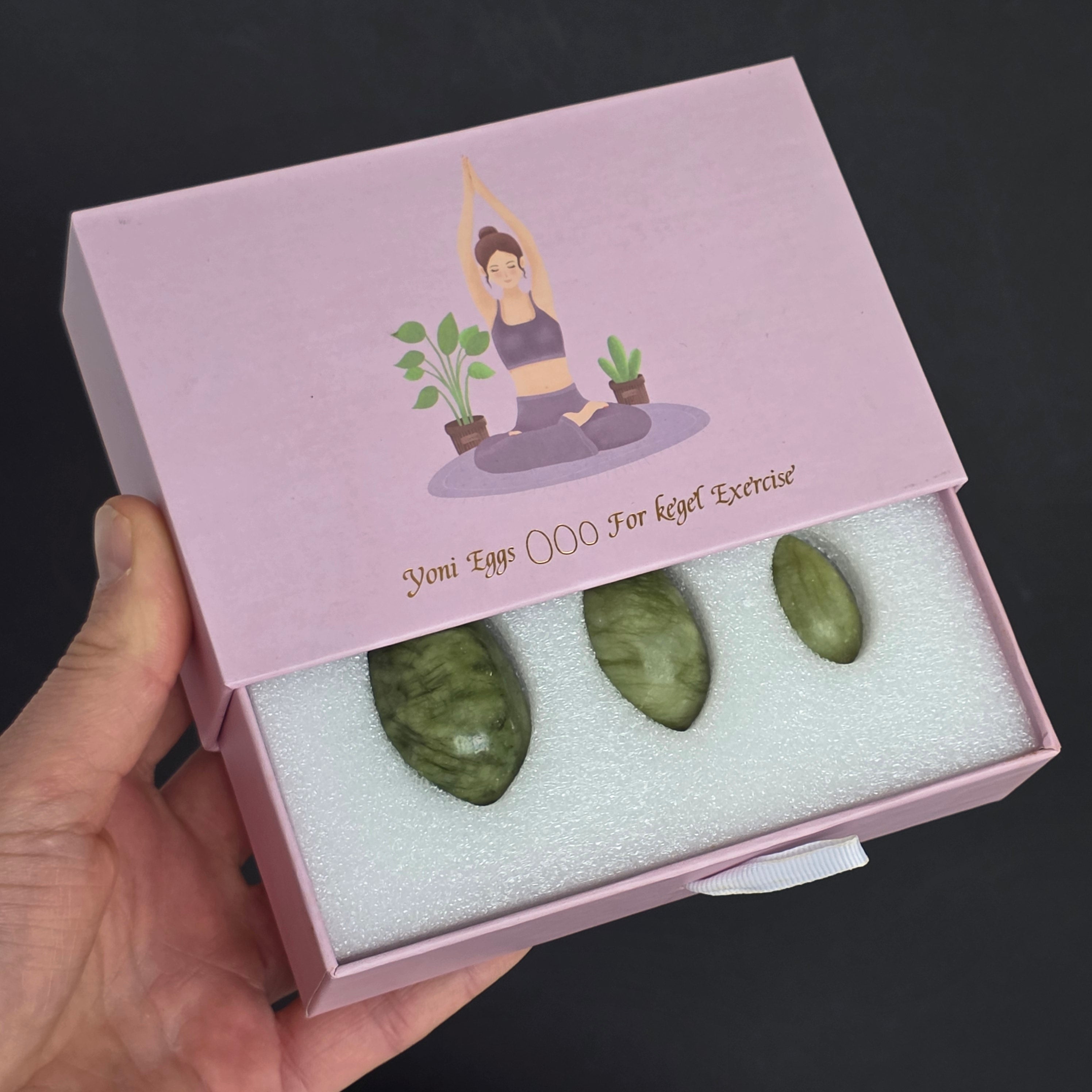 Opis - Oua Yoni z Green Jade (z dziurą, Snur) - Ustaw 3 sztuki zapakowane w pudełko na prezent