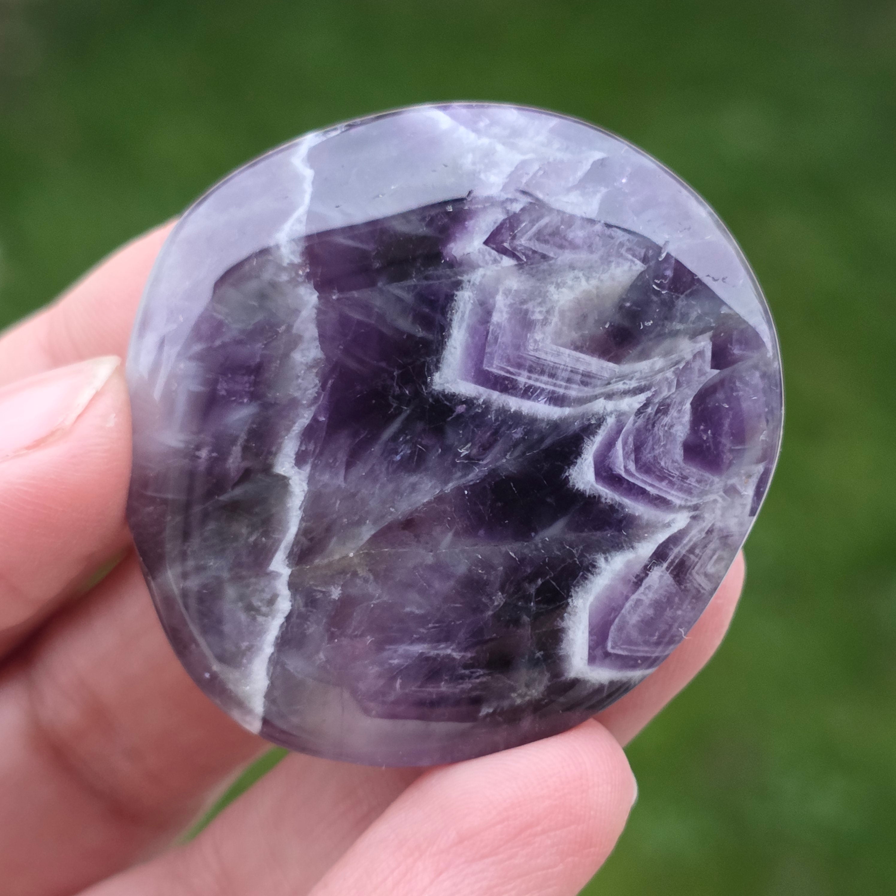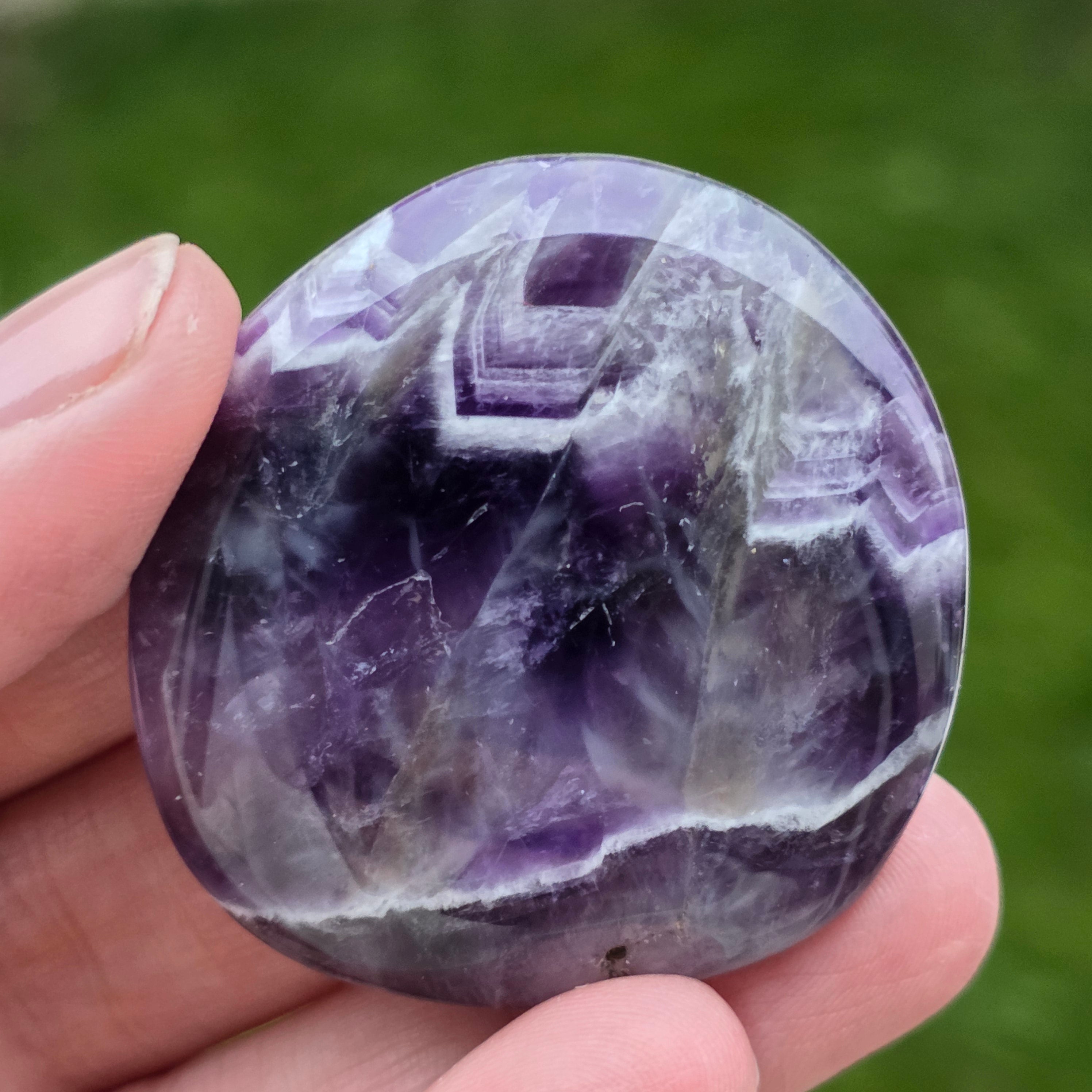 Ametyst Chevron jest rozpoznawany za powiązania z czakrami koronami i trzecim okiem, zwiększając intuicję i zdolność do podejmowania decyzji.