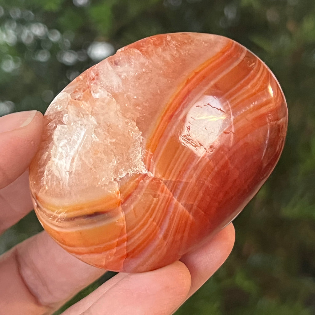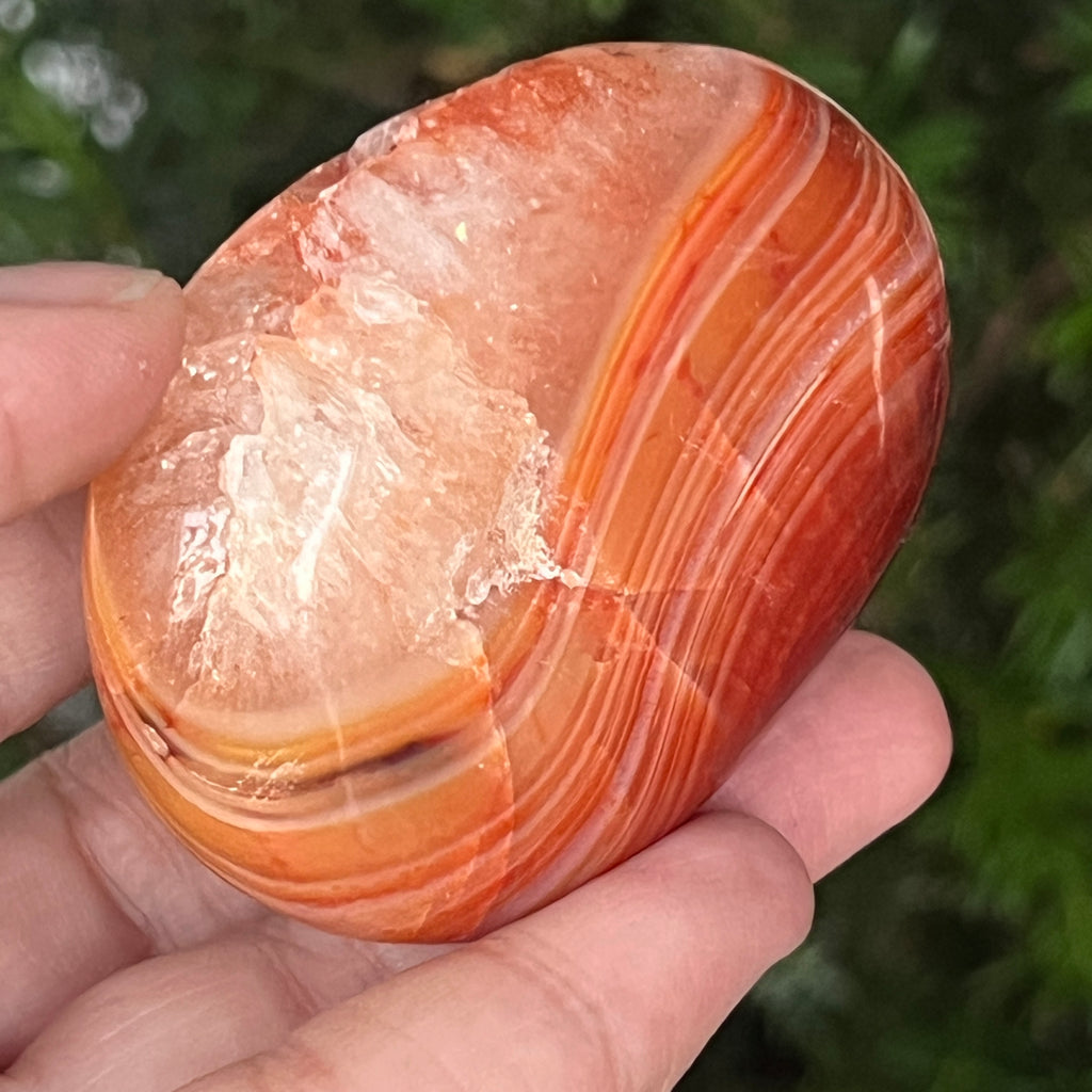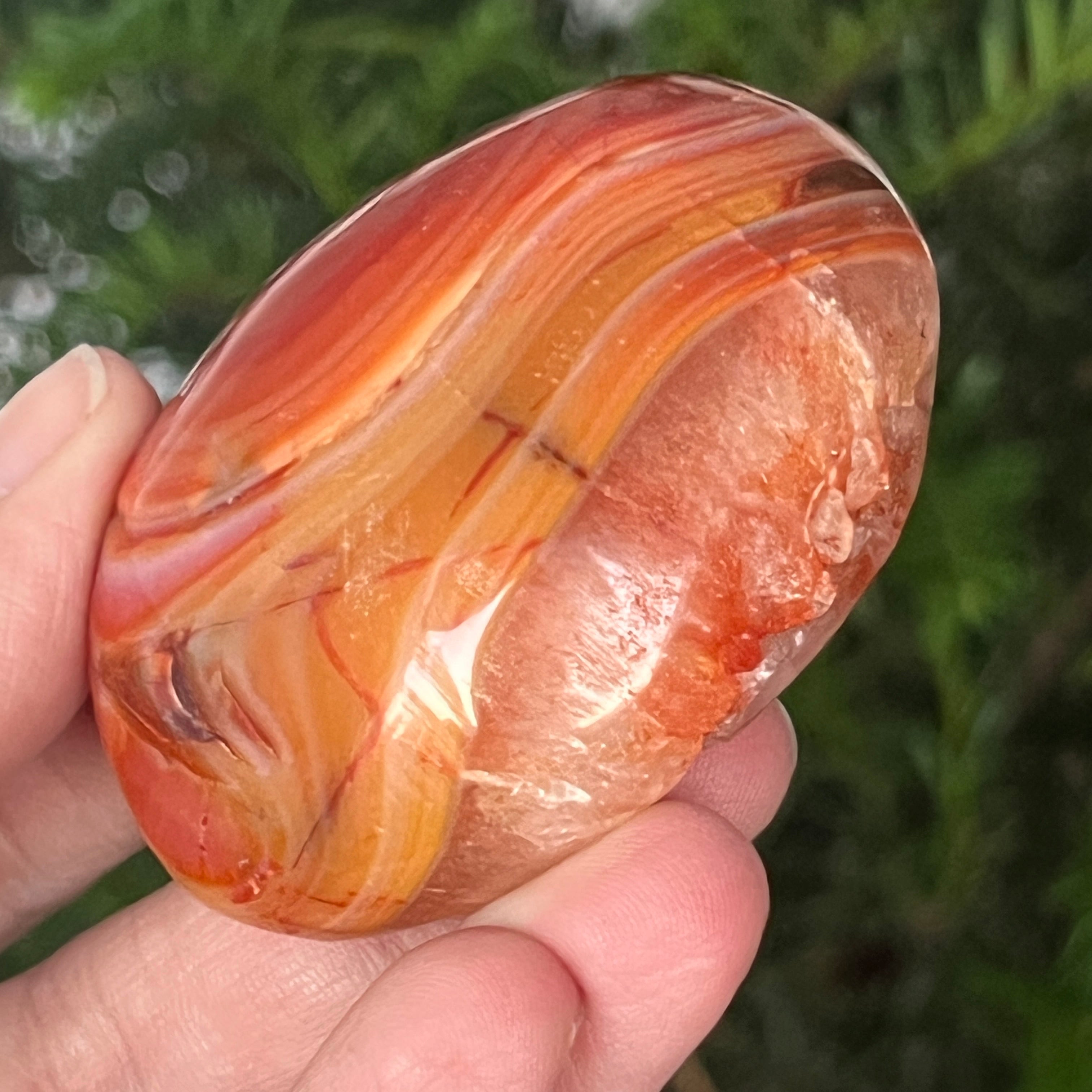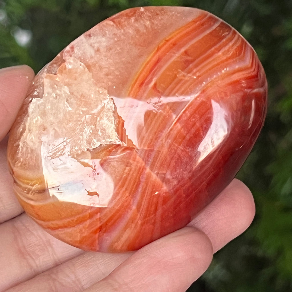 Trzymany w ręku, ten naturalny karneol palmowy staje się narzędziem pozytywnej energii i wewnętrznej przejrzystości. Można go używać w medytacji, praktykach zakotwiczania lub po prostu jako przedmiot dekoracyjny, który emanuje ciepłem, optymizmem i delikatną siłą.
