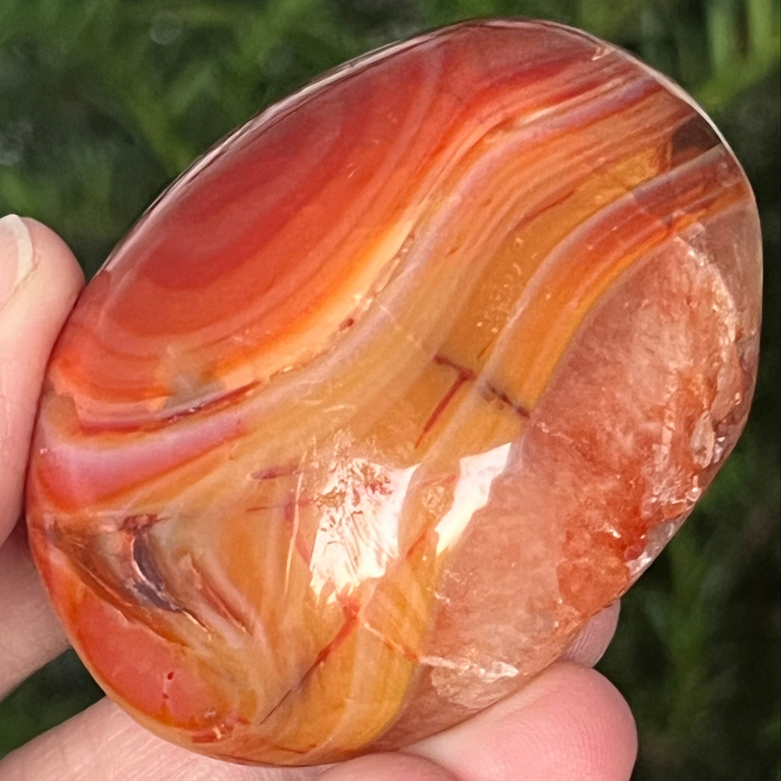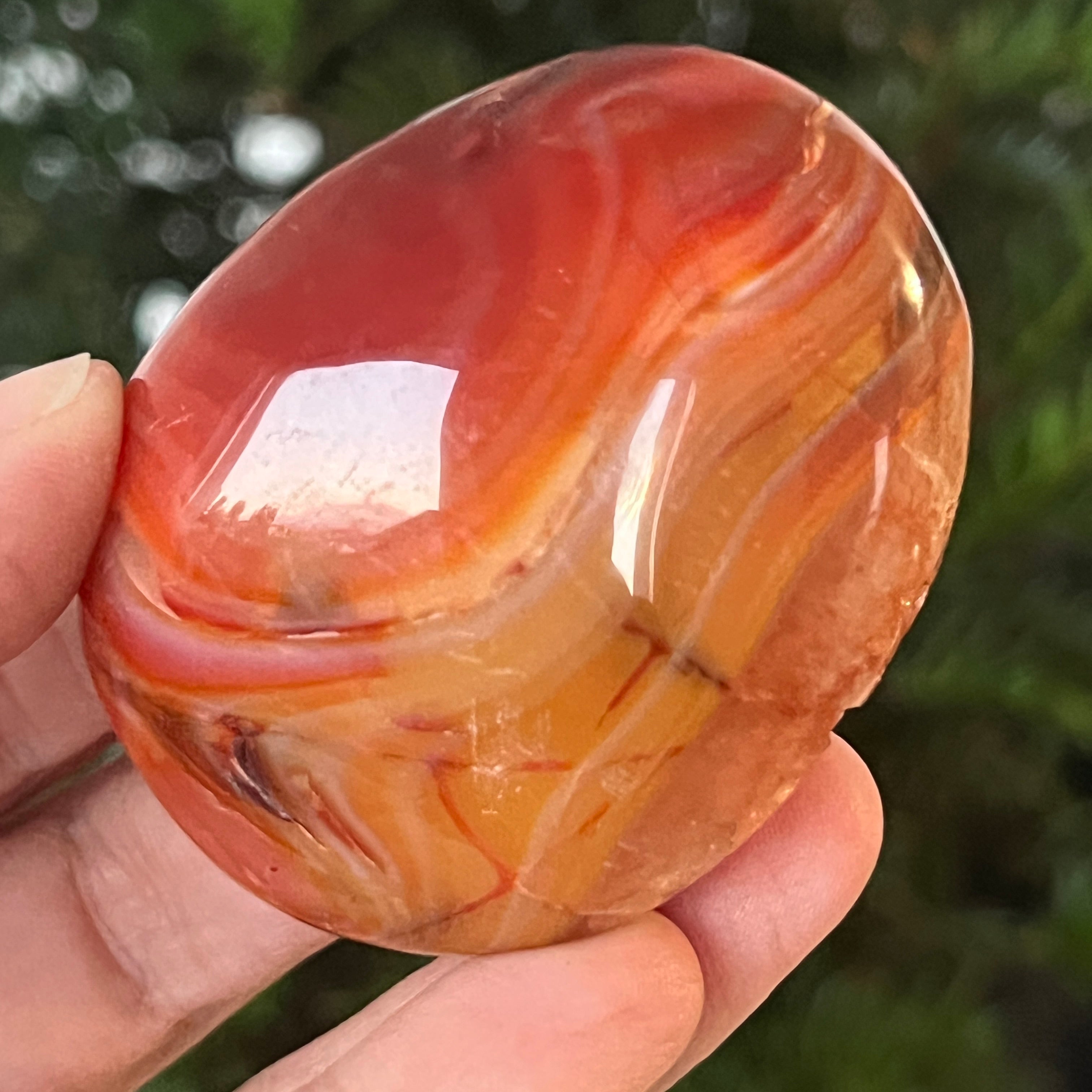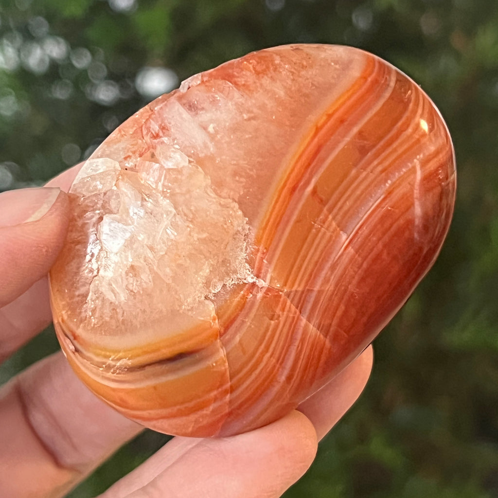 Trzymany w ręku, ten naturalny karneol palmowy staje się narzędziem pozytywnej energii i wewnętrznej przejrzystości. Można go używać w medytacji, praktykach zakotwiczania lub po prostu jako przedmiot dekoracyjny, który emanuje ciepłem, optymizmem i delikatną siłą.