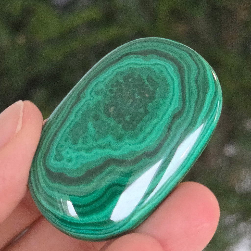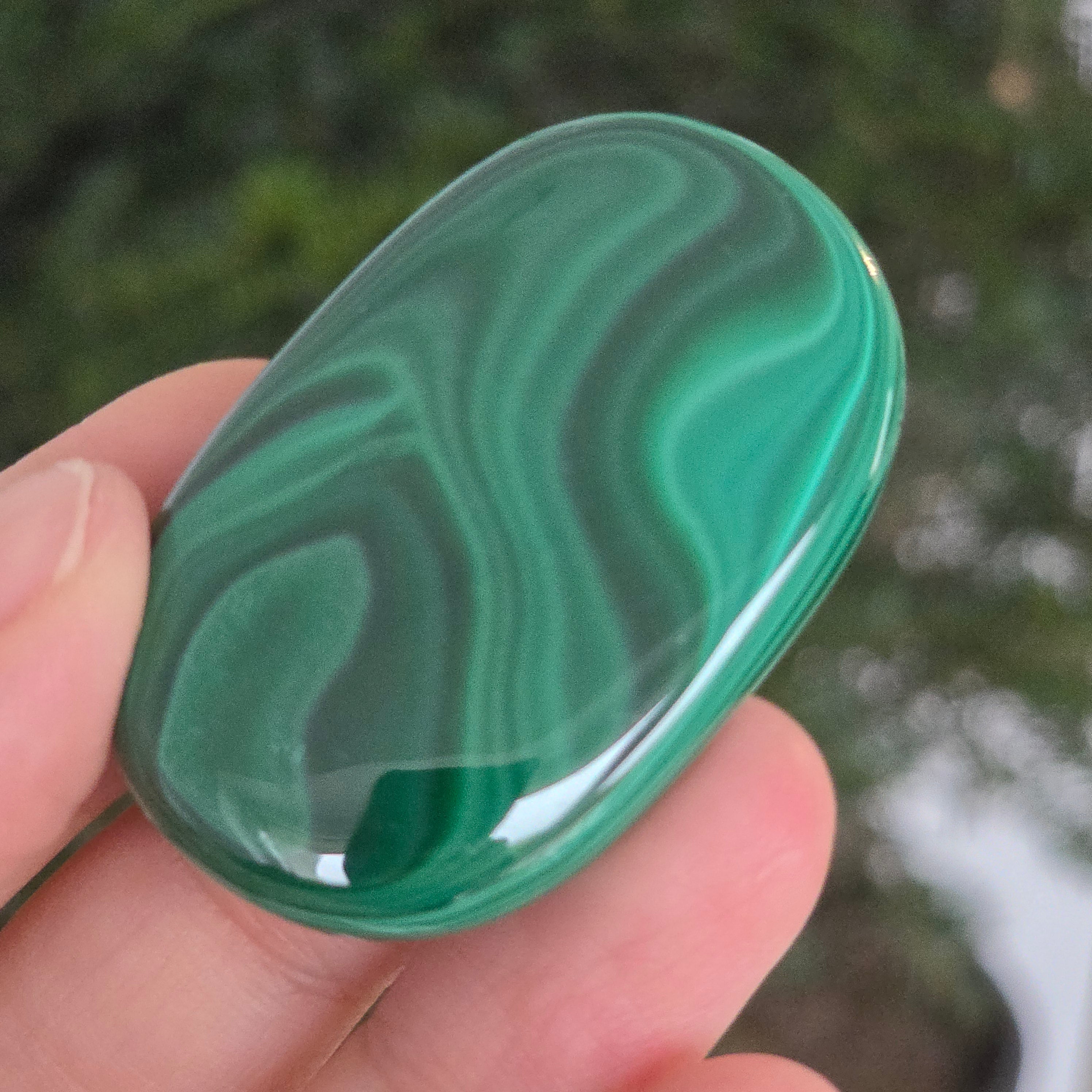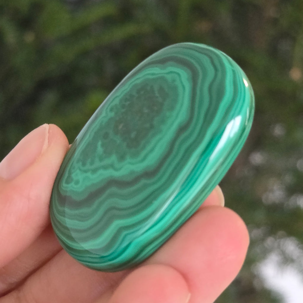 Un palmstone care pare să respire cu energia Pământului viu. Această piesă unicat din malachit natural, dezvăluie ondulații hipnotice de verde intens și smarald, traversate de inele și benzi concentrice ce par sculptate de însăși natura. Textura netedă, perfect șlefuită, face ca piatra să se așeze plăcut în palmă, emanând o vibrație caldă și protectoare.