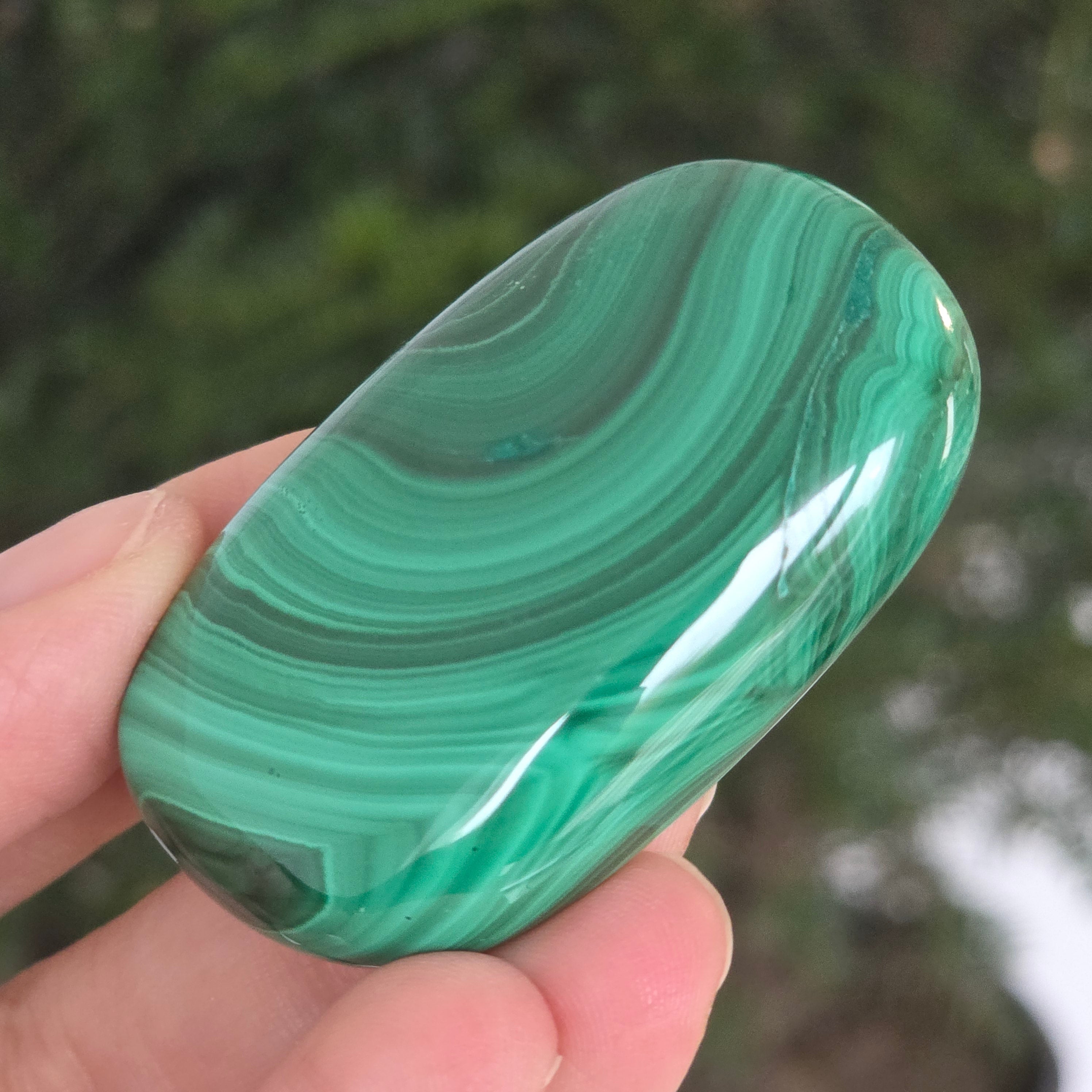 Un palmstone care pare să respire cu energia Pământului viu. Această piesă unicat din malachit natural, dezvăluie ondulații hipnotice de verde intens și smarald, traversate de inele și benzi concentrice ce par sculptate de însăși natura. Textura netedă, perfect șlefuită, face ca piatra să se așeze plăcut în palmă, emanând o vibrație caldă și protectoare.
