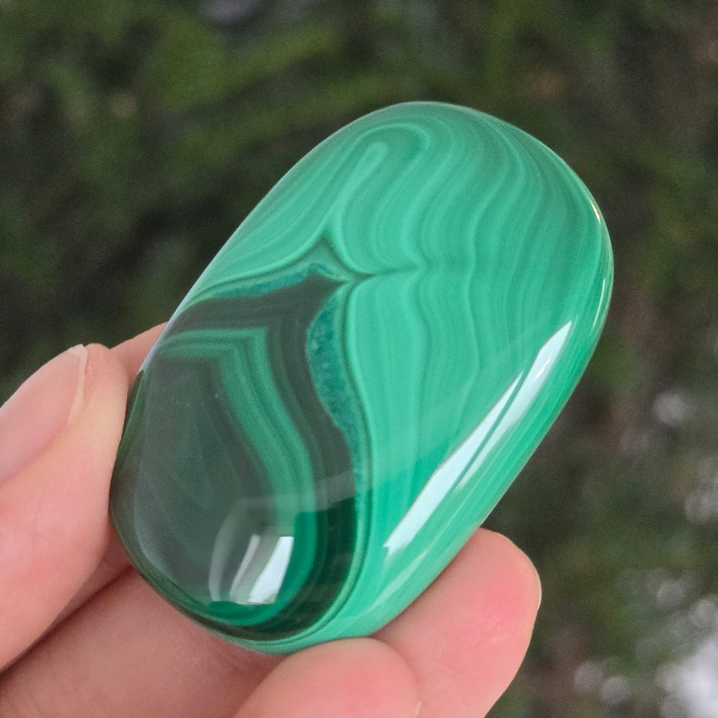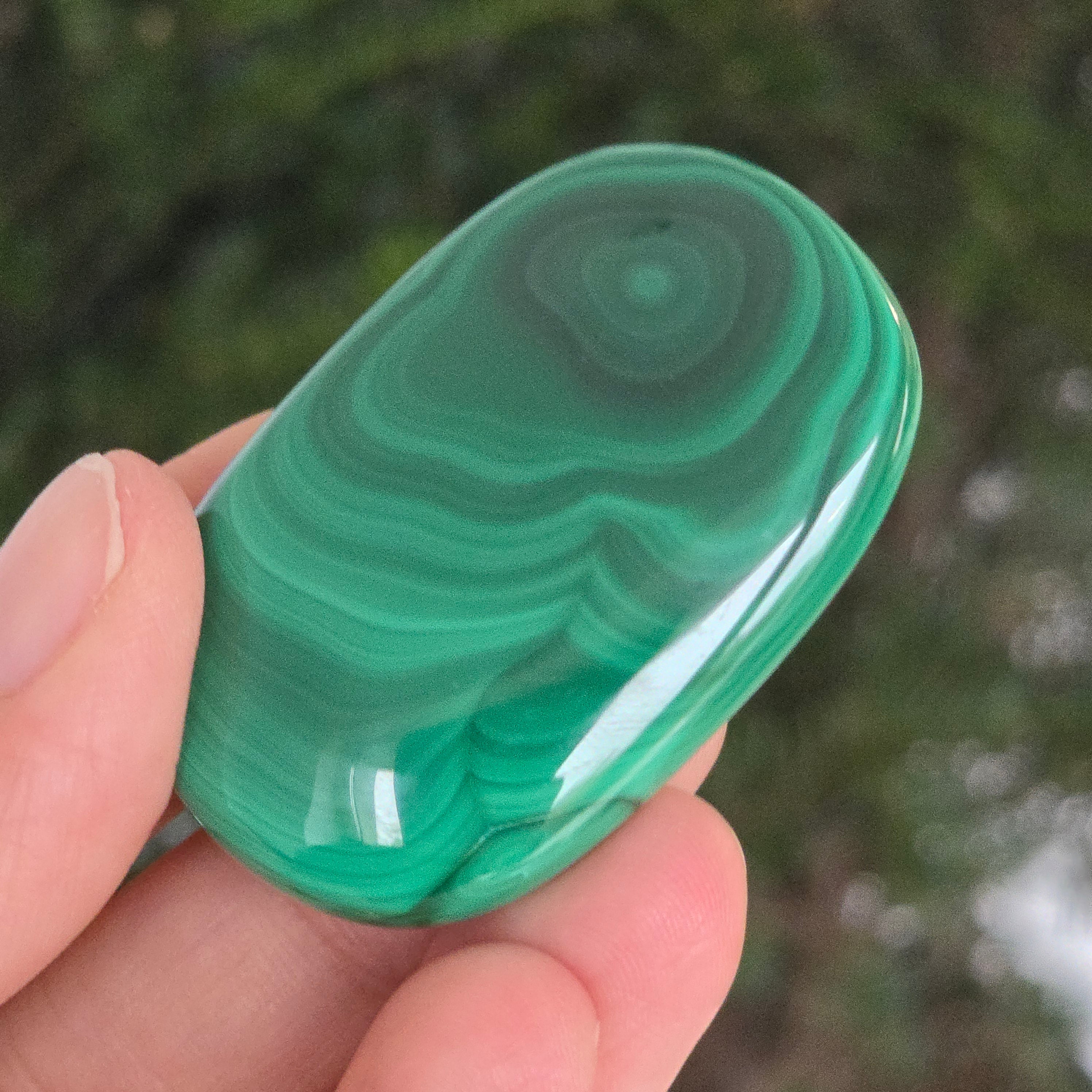 Un palmstone care pare să respire cu energia Pământului viu. Această piesă unicat din malachit natural, dezvăluie ondulații hipnotice de verde intens și smarald, traversate de inele și benzi concentrice ce par sculptate de însăși natura. Textura netedă, perfect șlefuită, face ca piatra să se așeze plăcut în palmă, emanând o vibrație caldă și protectoare.