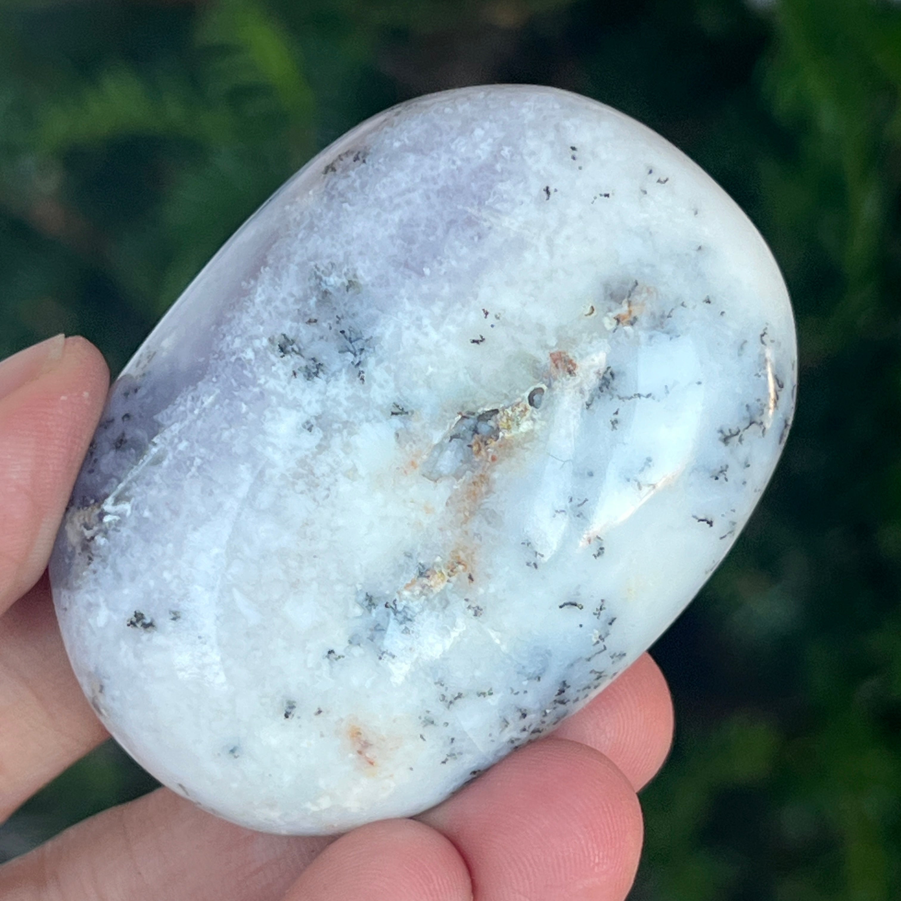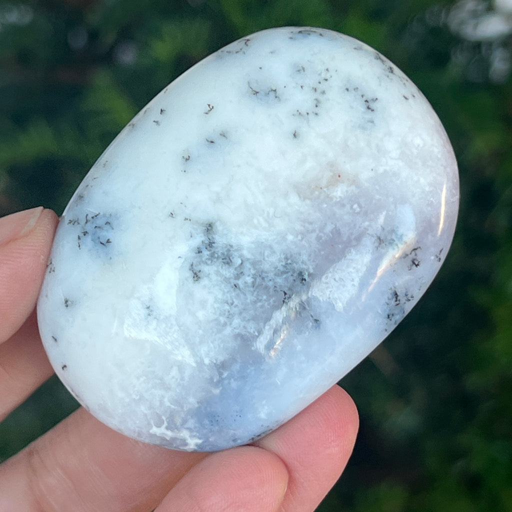 Acest palmstone din opal alb dendritic aduce o stare de pace și o ușoară expansiune a conștiinței. Ideal pentru meditație, pentru momente de reflecție sau pentru a fi păstrat ca piesă decorativă într-un spațiu sacru, el emană o frumusețe pură și organică, un echilibru între lumina albă și umbrele subtile ale naturii.