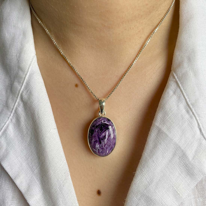 Wisior wyjątkowy, który łączy w sobie szlachetność srebra z intensywną wibracją charoitu – zarówno biżuterii kolekcjonerskiej, jak i osobistego talizmanu.