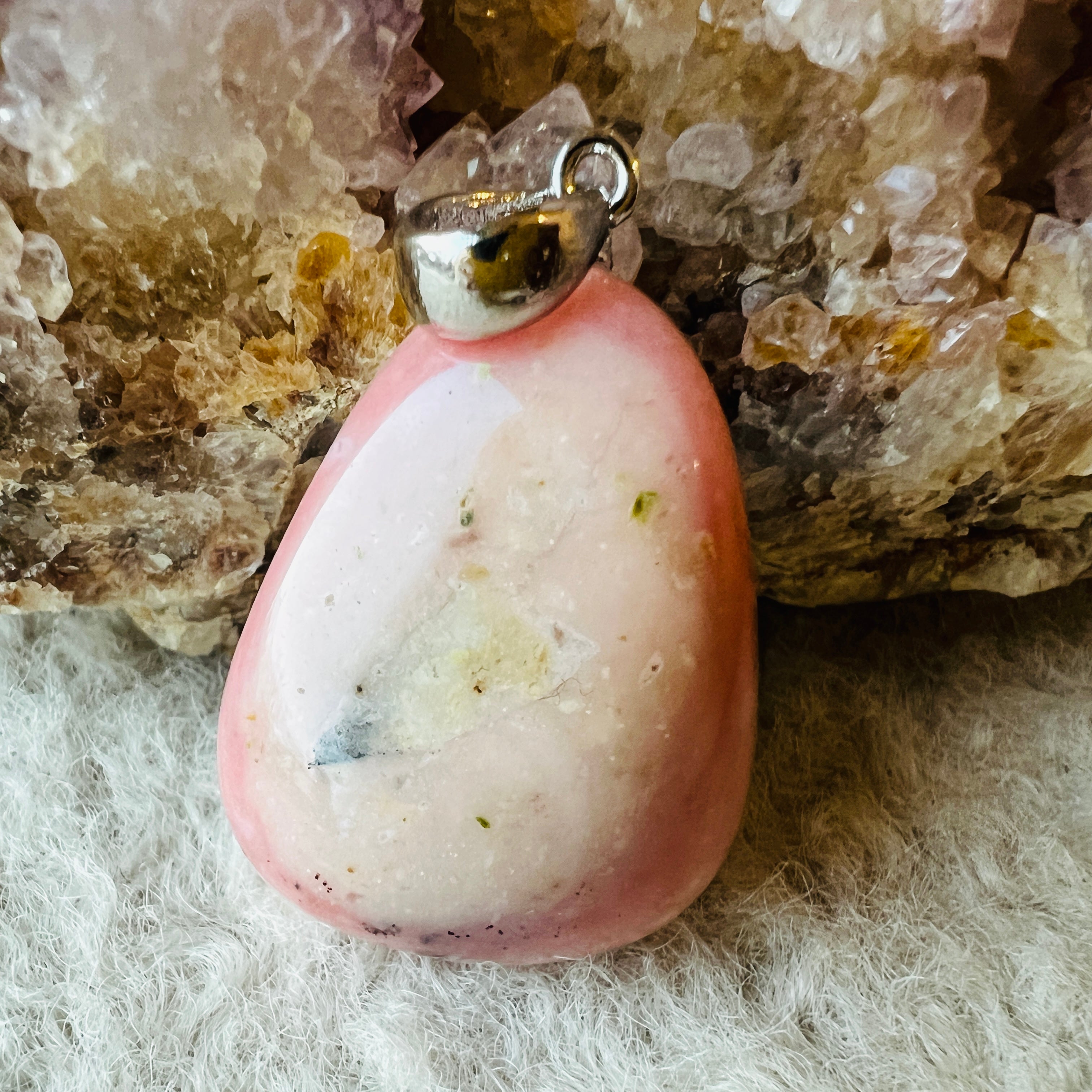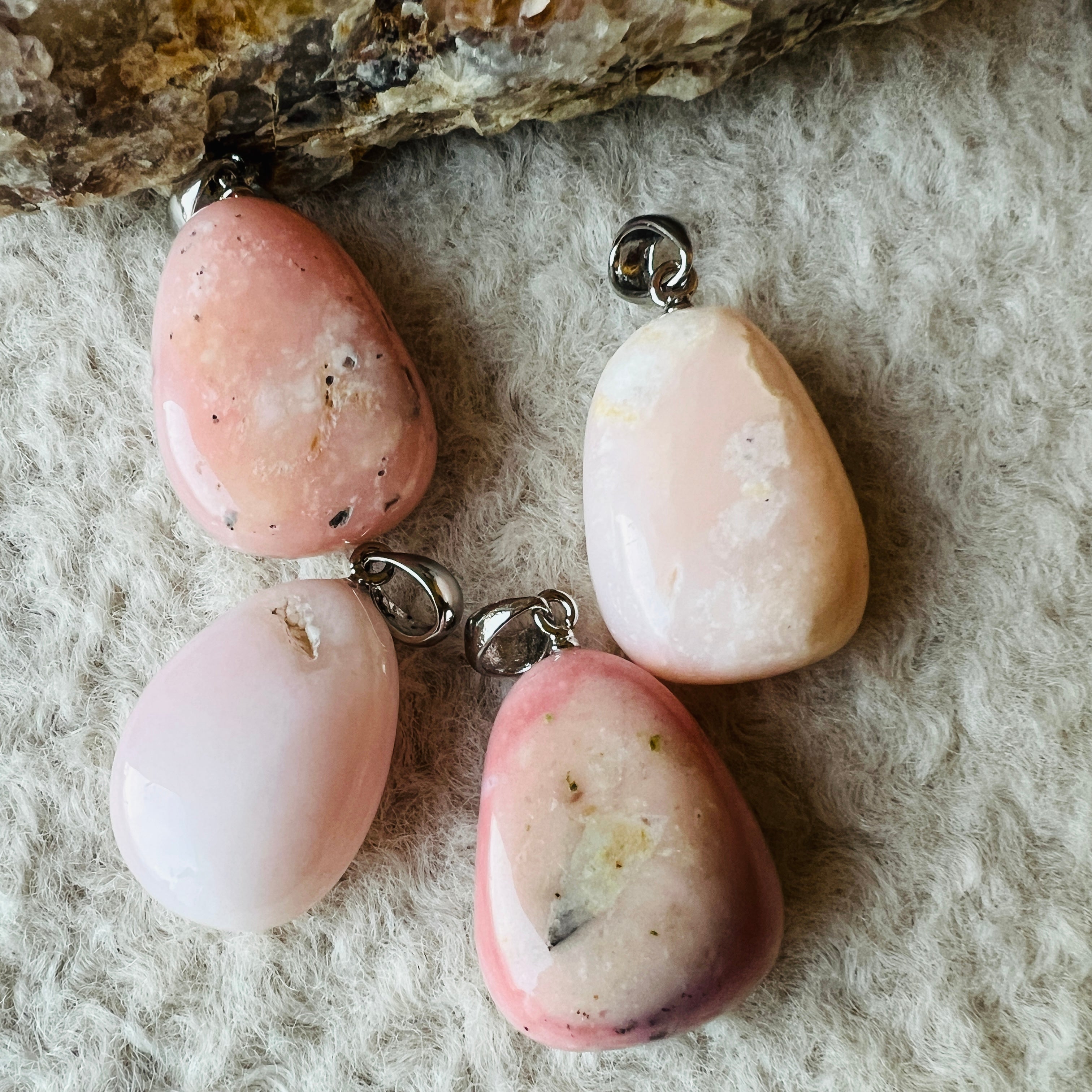 Pink Opal to różnorodne opal, doceniane za delikatny różowy róż. Ten rodzaj opal pochodzi głównie z Peru, jednego z niewielu różowych źródeł opal na świecie. Jego charakterystyczny kolor różni się od jasnoróżowego do bardziej intensywnych tonów różu łososia, czasem o delikatnych smugach lub półprzezroczystości.