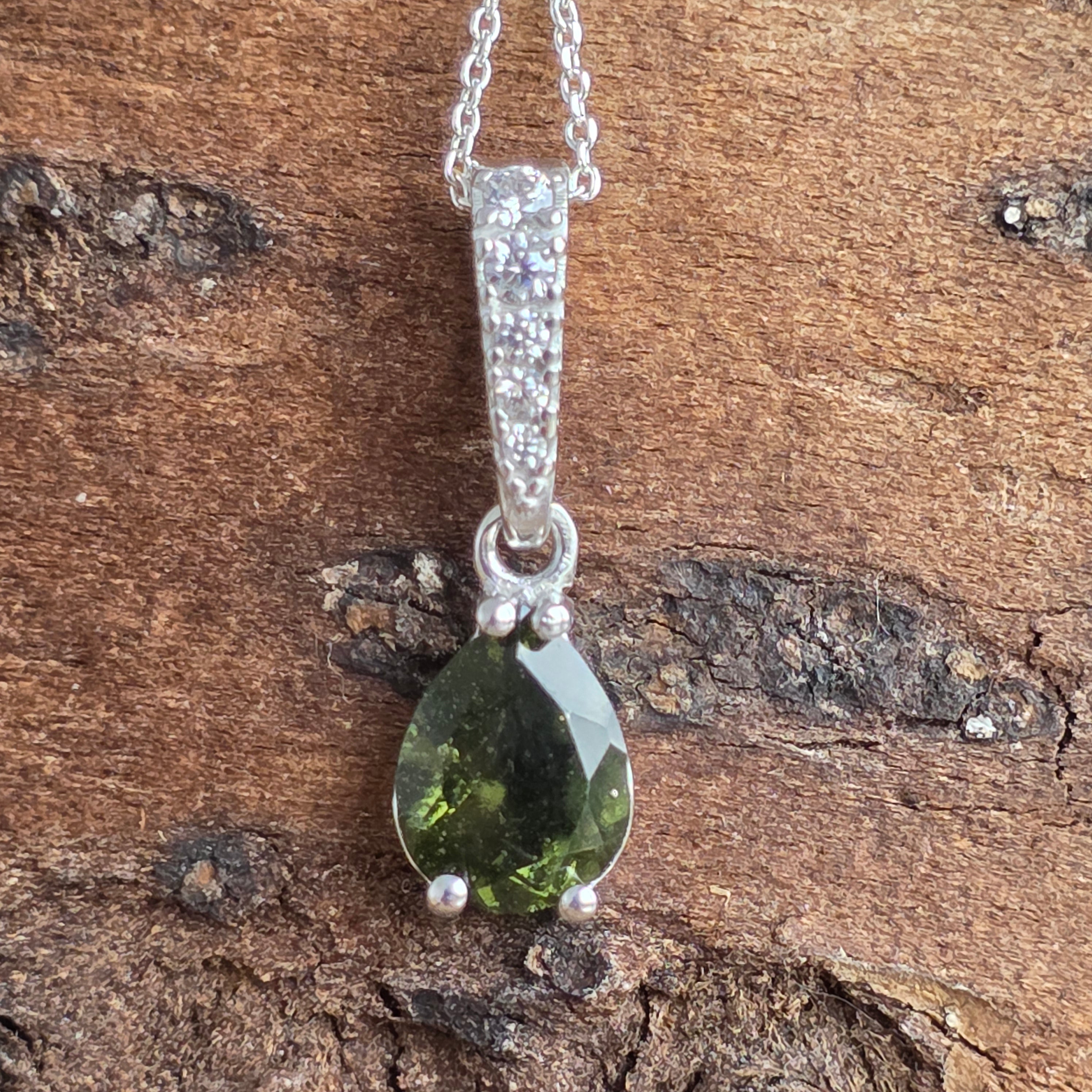 Pandantyczne materiały: Mołdawit, cyrkonia sześcienne, srebro