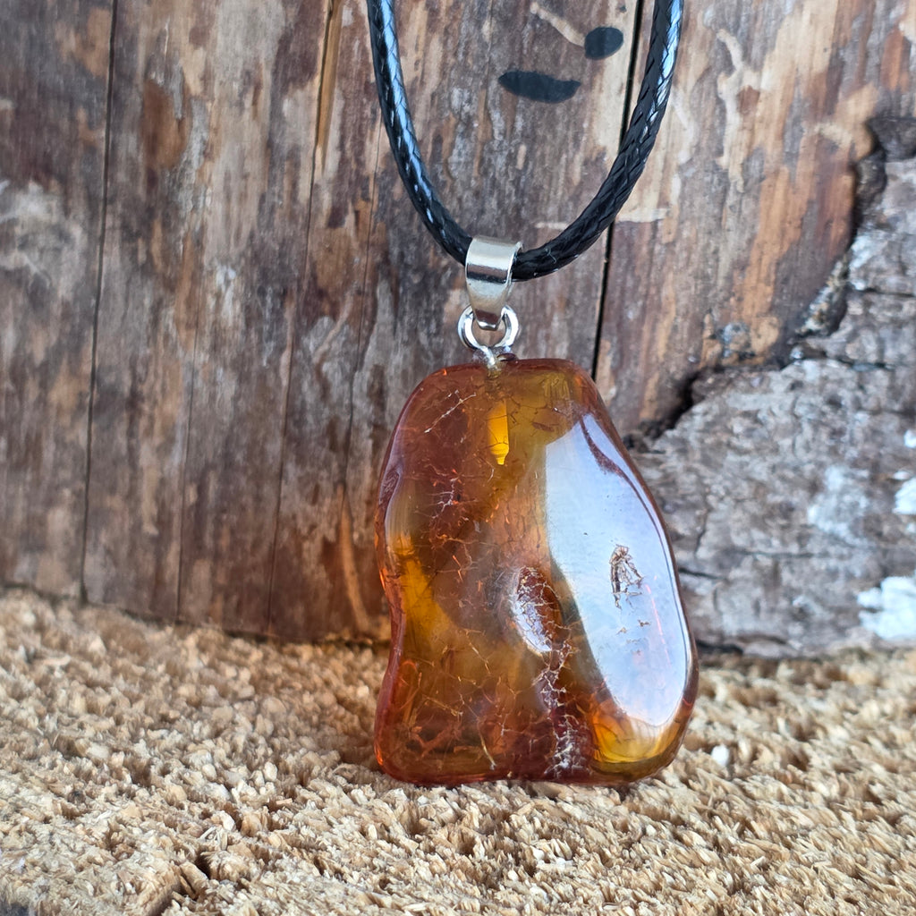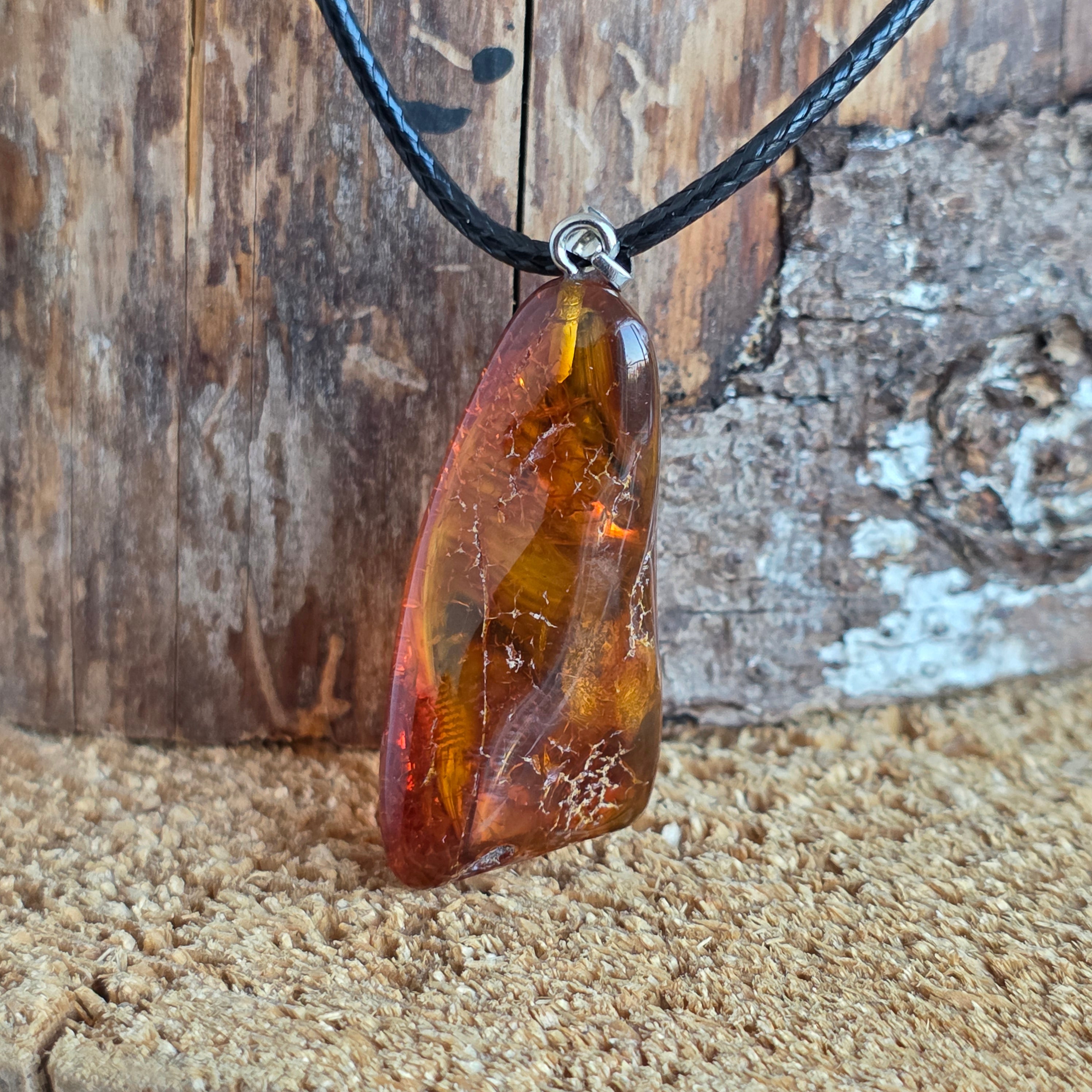 Poartă acest pandantiv din chihlimbar natural ca pe o rază de soare prinsă în bijuterie — o amintire vie a luminii care nu se stinge niciodată, indiferent de trecerea timpului.