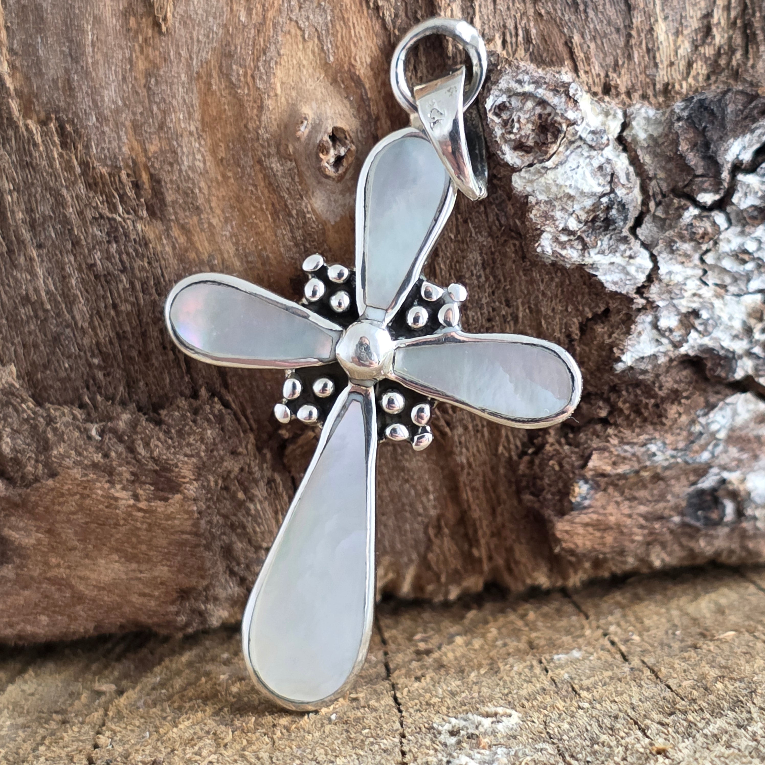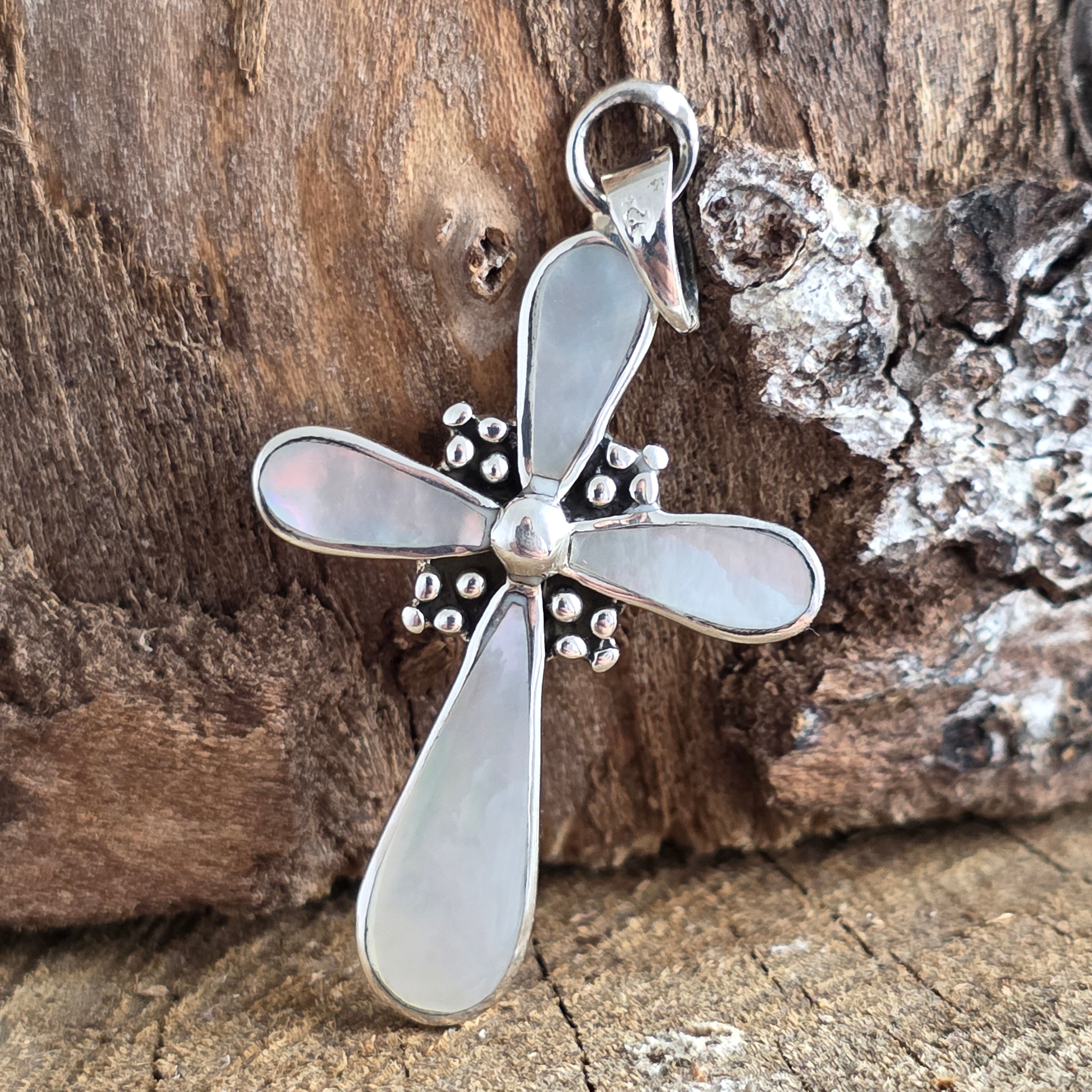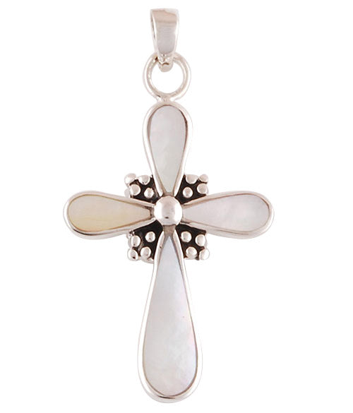 Forma clasică de cruce simbolizează protecția, credința și echilibrul interior, iar montura simplă, cu linii curate, pune în valoare luminozitatea organică a sidefului.