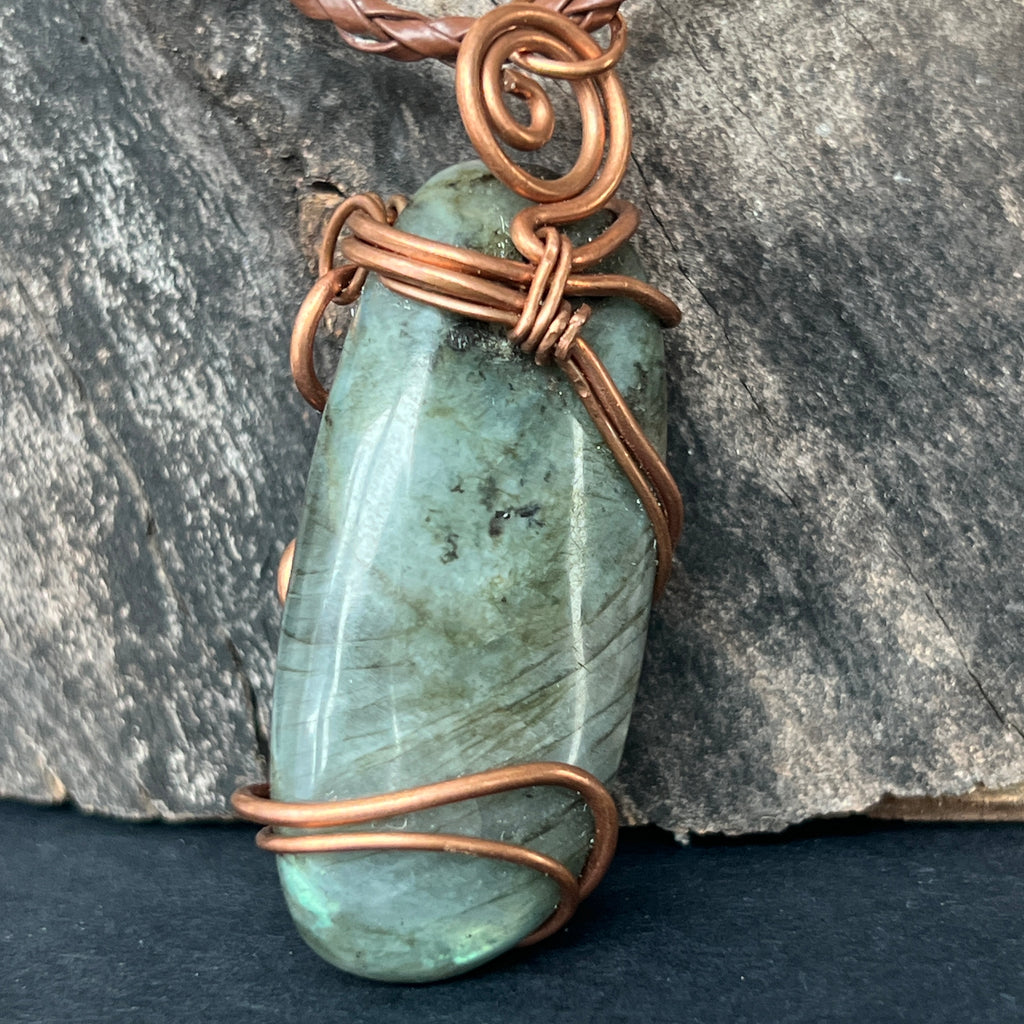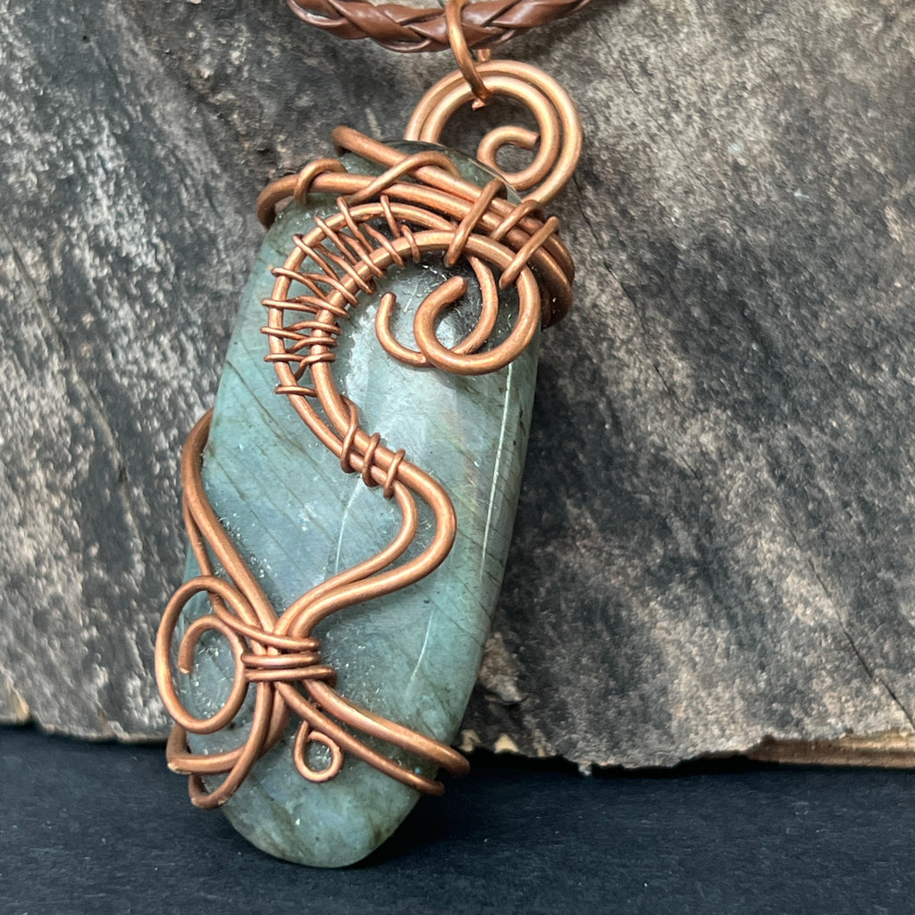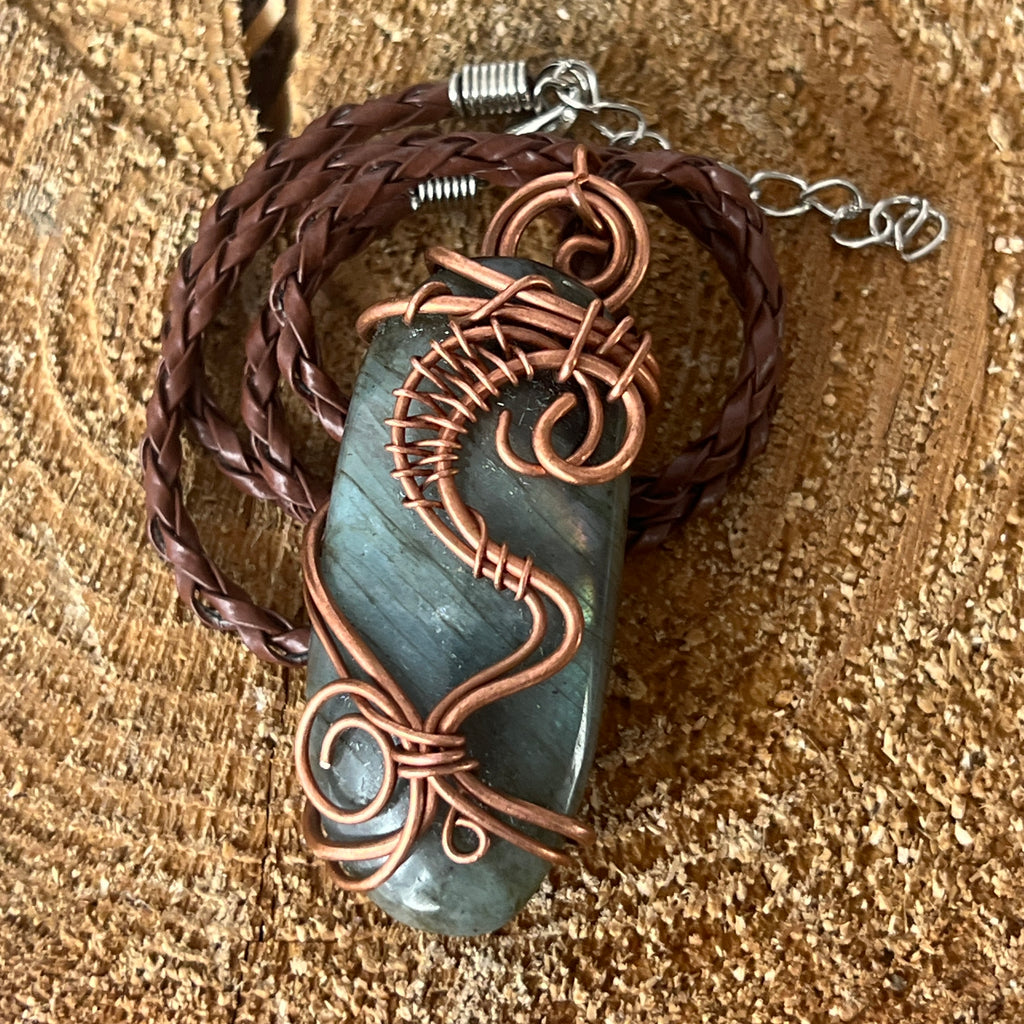 Pandtyczny naszyjnik labradorit w miedzi/drucie artystycznym model 3