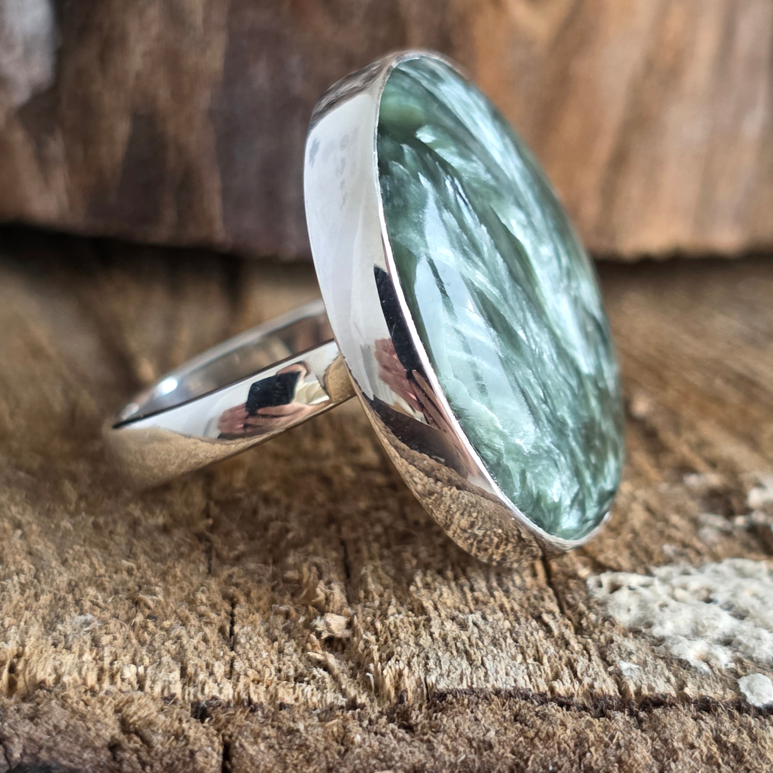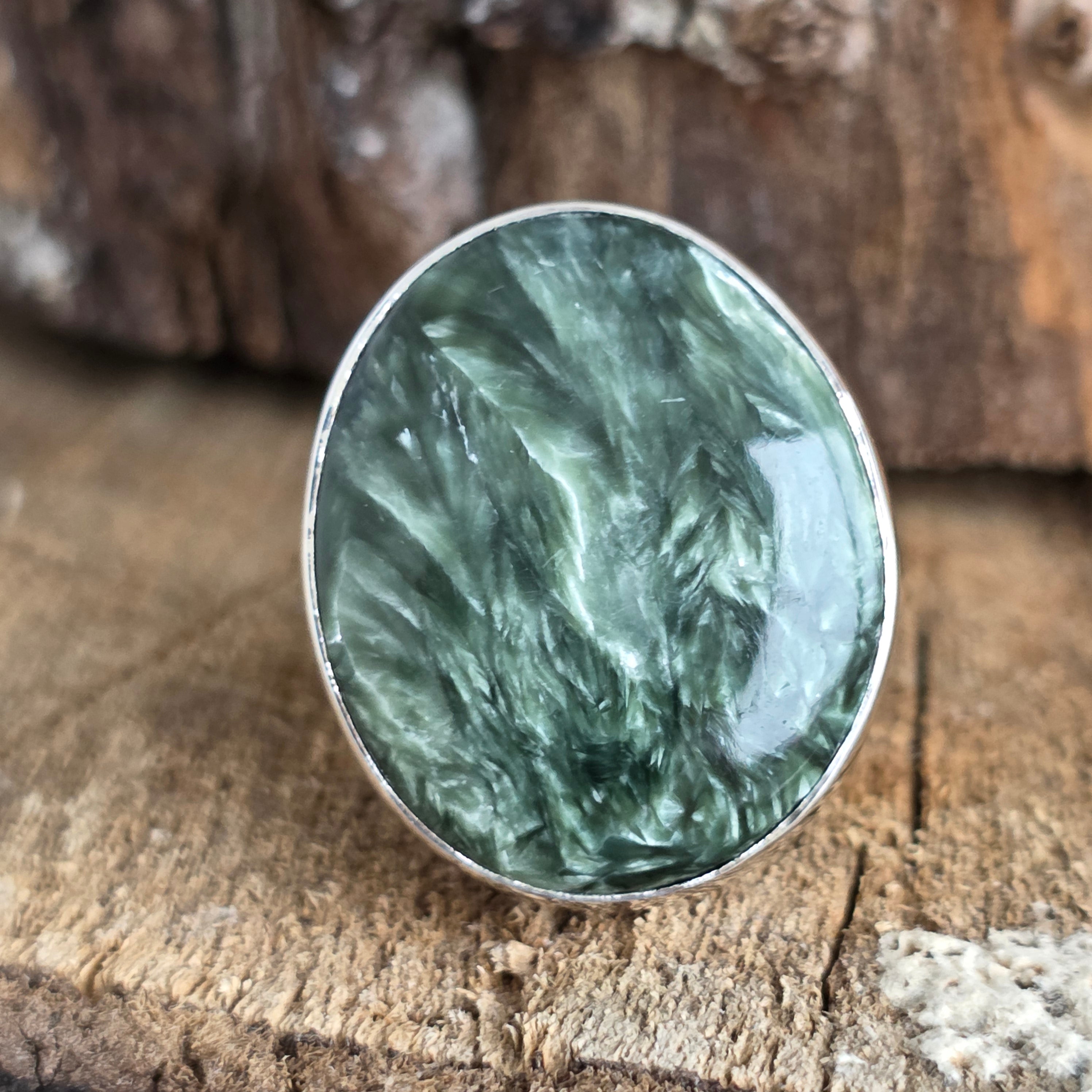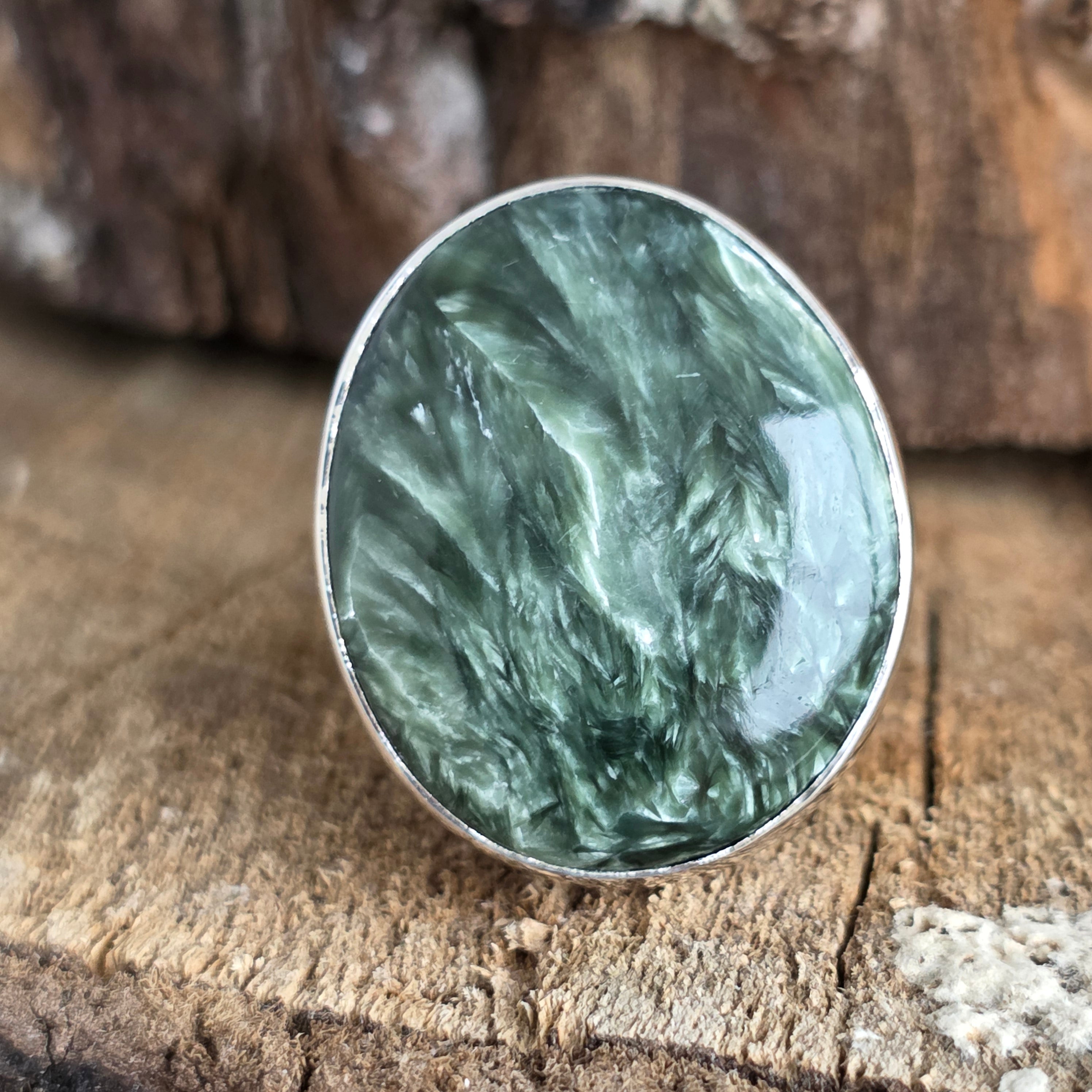 - Klejnot, który wydaje się być dotknięty skrzydłami aniołów – ten pierścionek naturalny serafinit emanuje specjalnym światłem, z zielono-srebrnymi refleksami przypominającymi pióra serafinów, czystych duchów światła.