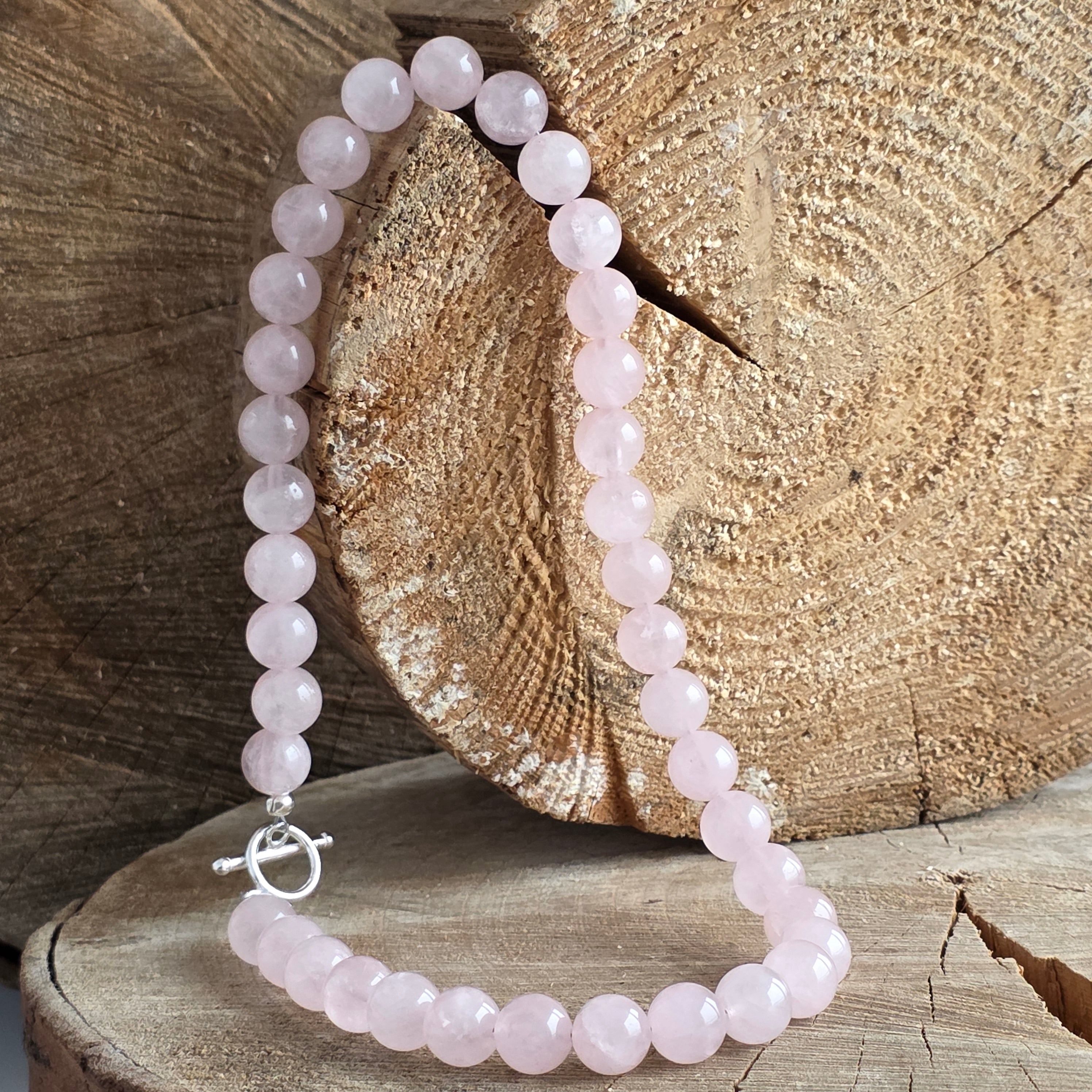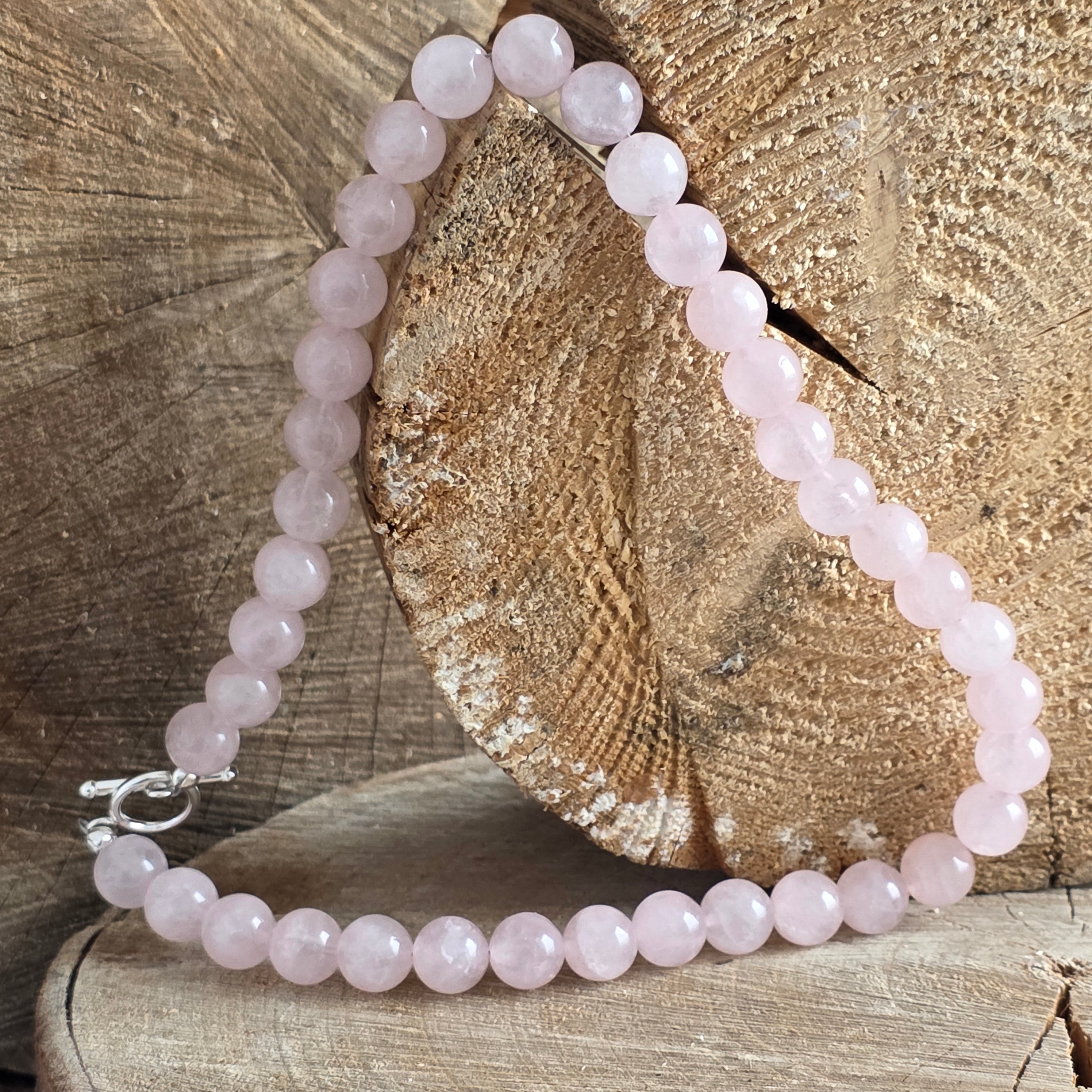 Przybory: Polerowany naturalny kwarc różowy (kulki 10 mm i 6 mm), zapięcie srebrne