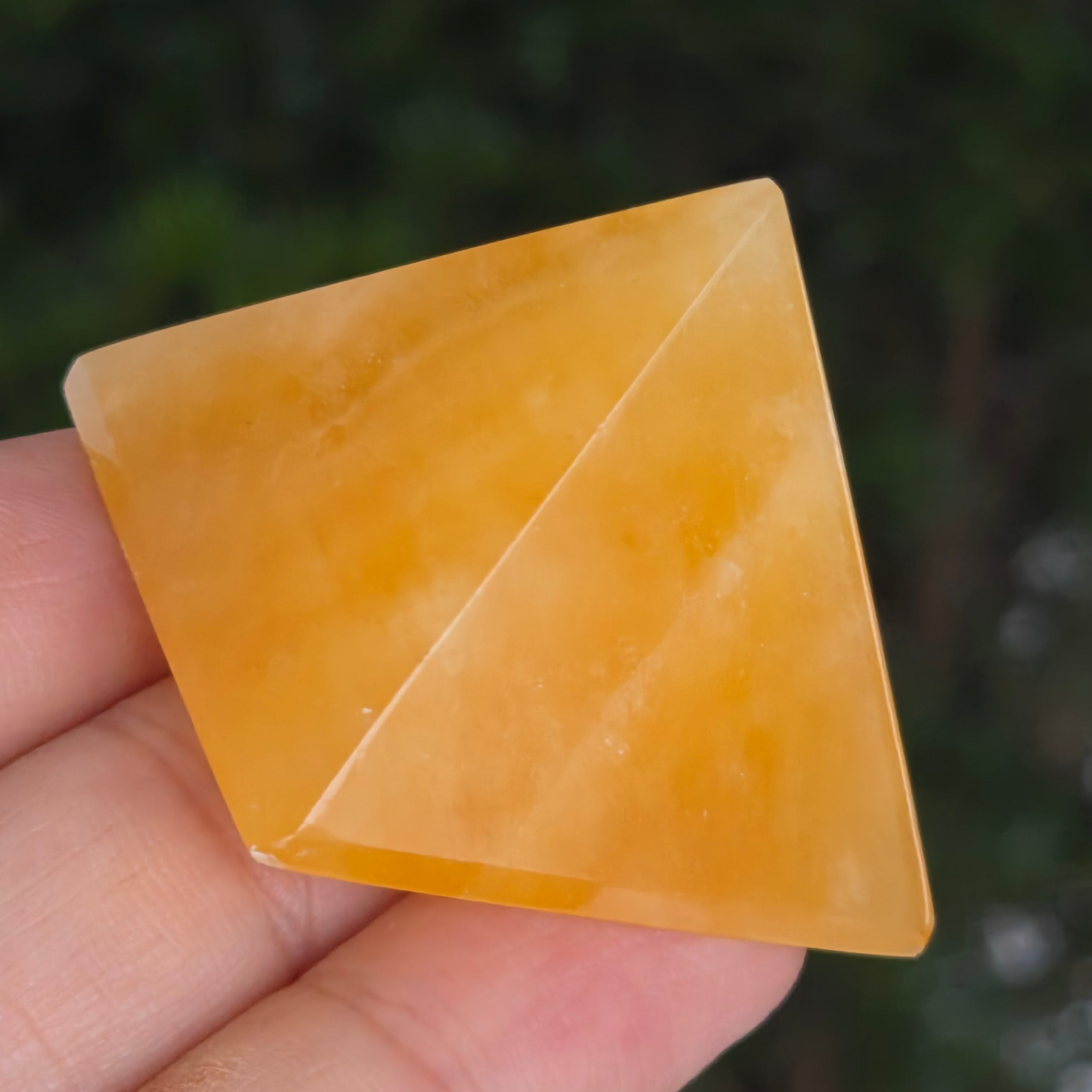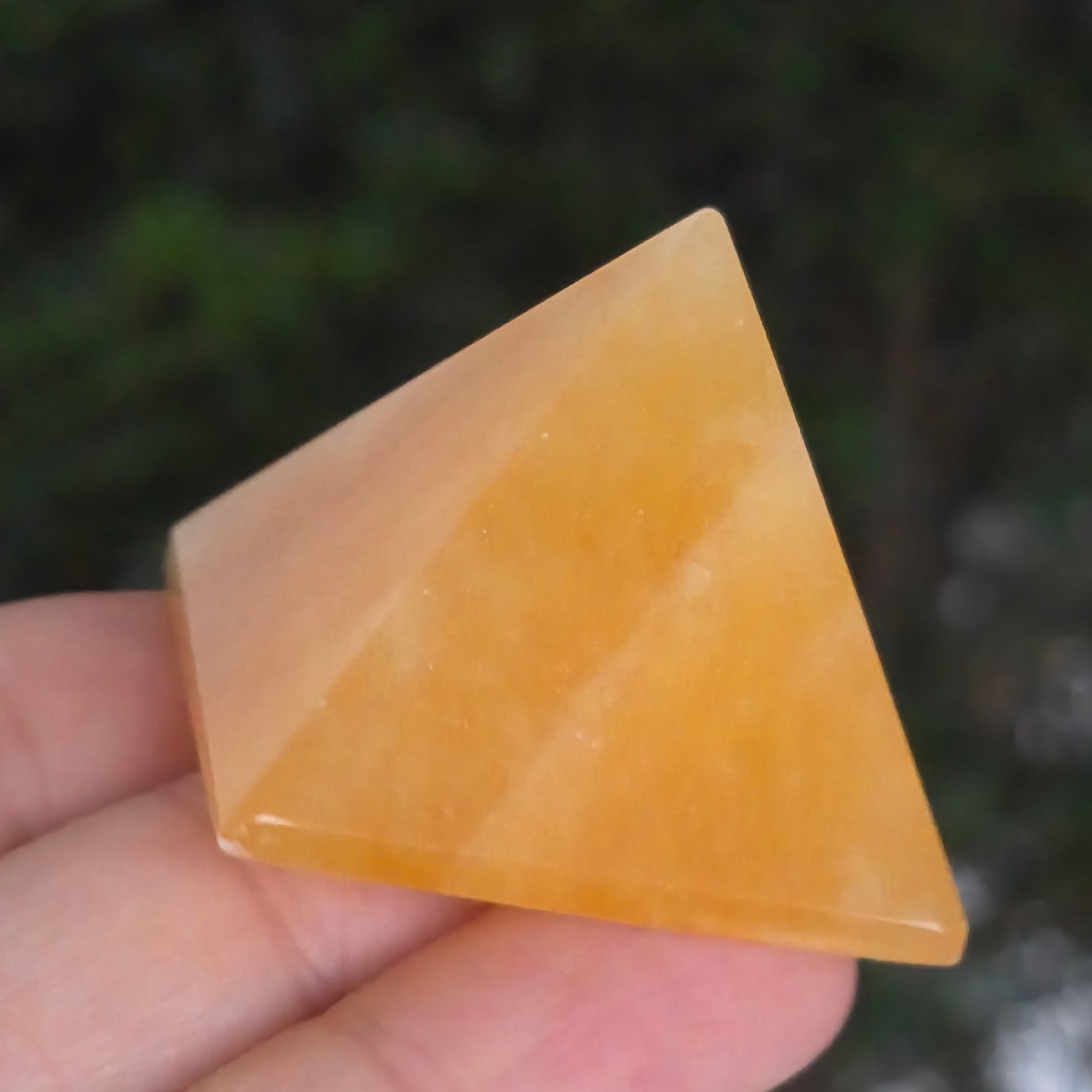 O piramidă ce pare sculptată din lumina soarelui. Această piesă din calcit portocaliu natural, radiază o căldură blândă, cu nuanțe ce variază de la portocaliu miere până la auriu translucid. Textura sa netedă, mătăsoasă la atingere, captează lumina și o reflectă cu o strălucire vie, aducând bucurie și prospețime în orice spațiu.