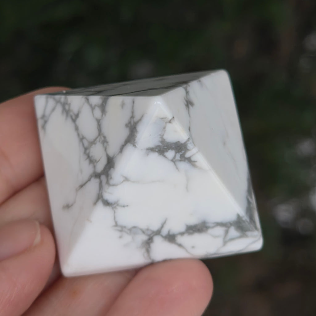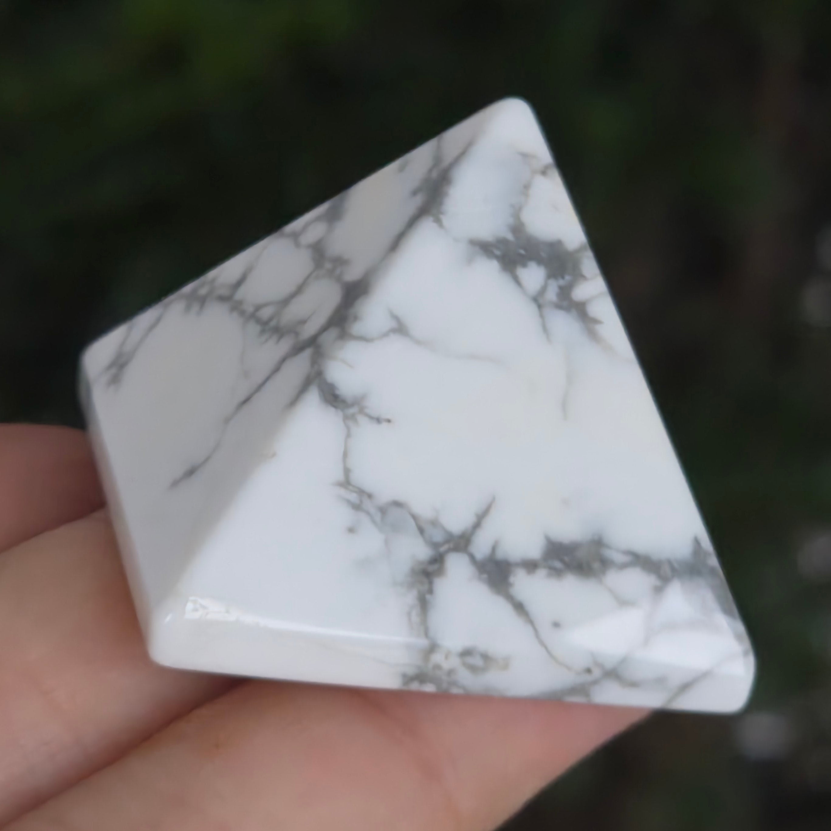 O piramidă ce pare sculptată din liniștea norilor. Această piesă din howlit alb natural, cu dimensiunile, impresionează prin desenul său delicat de vene gri-argintii ce se întrepătrund în textura mată a pietrei. Suprafața fin șlefuită reflectă o eleganță discretă, transformând fiecare unghi într-un joc subtil de lumină și puritate.