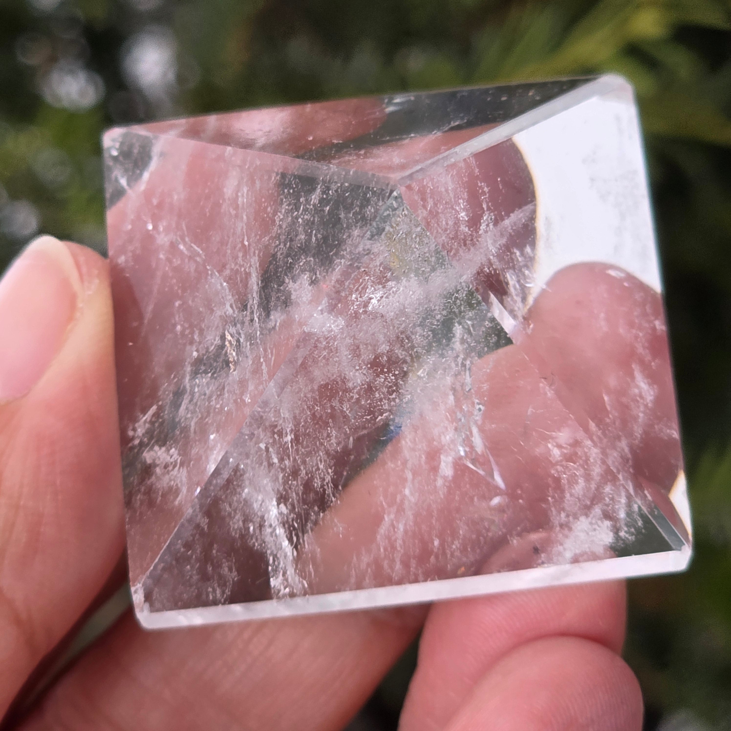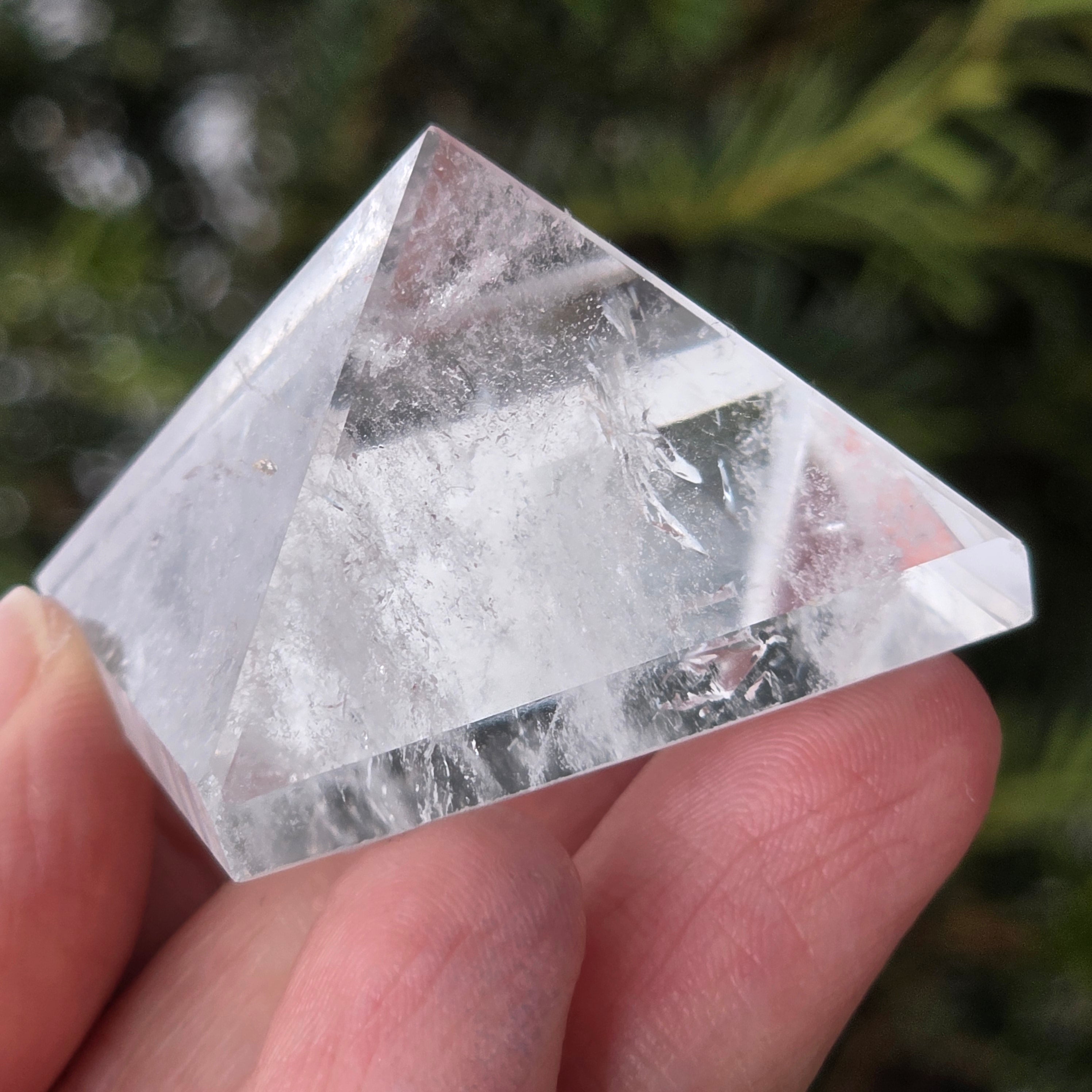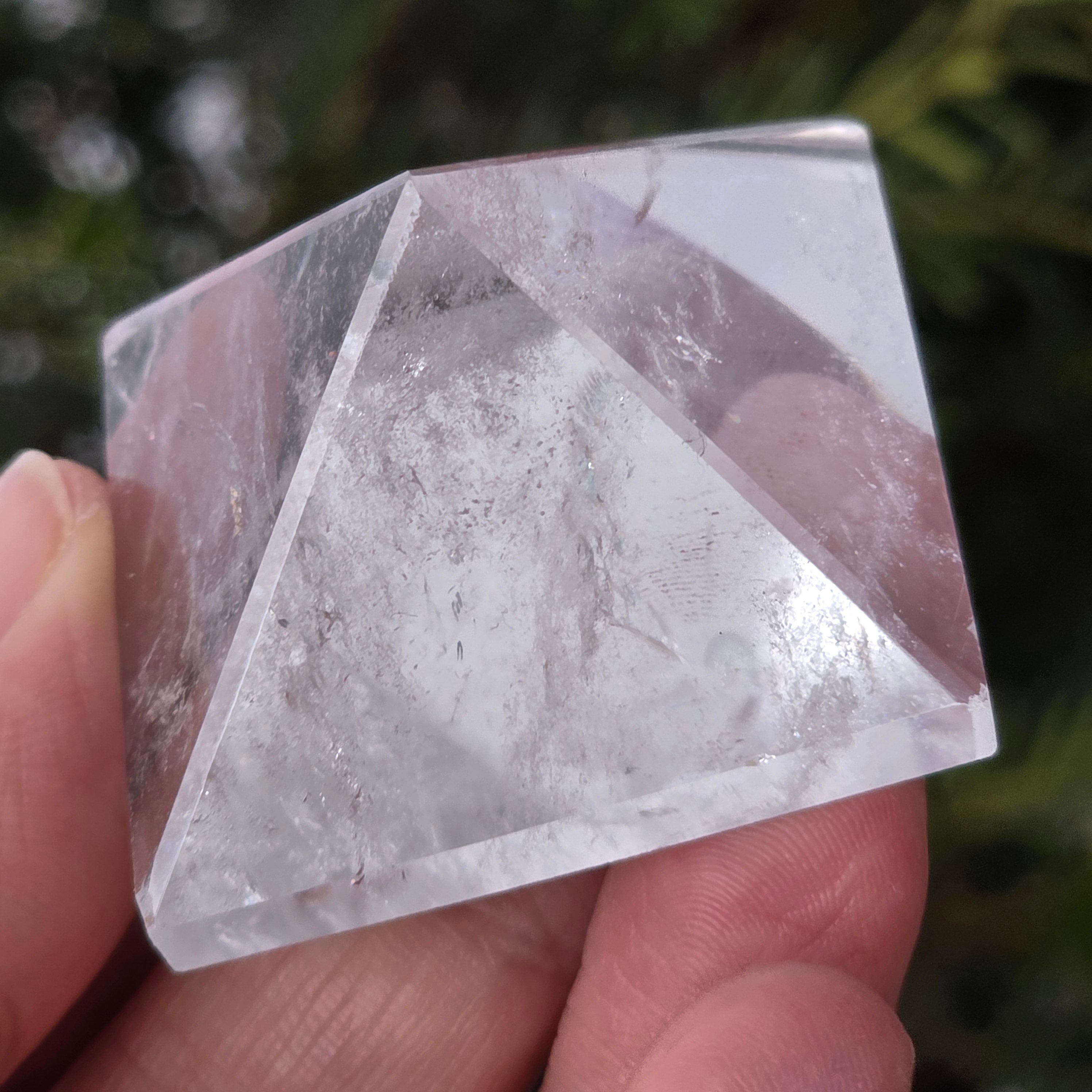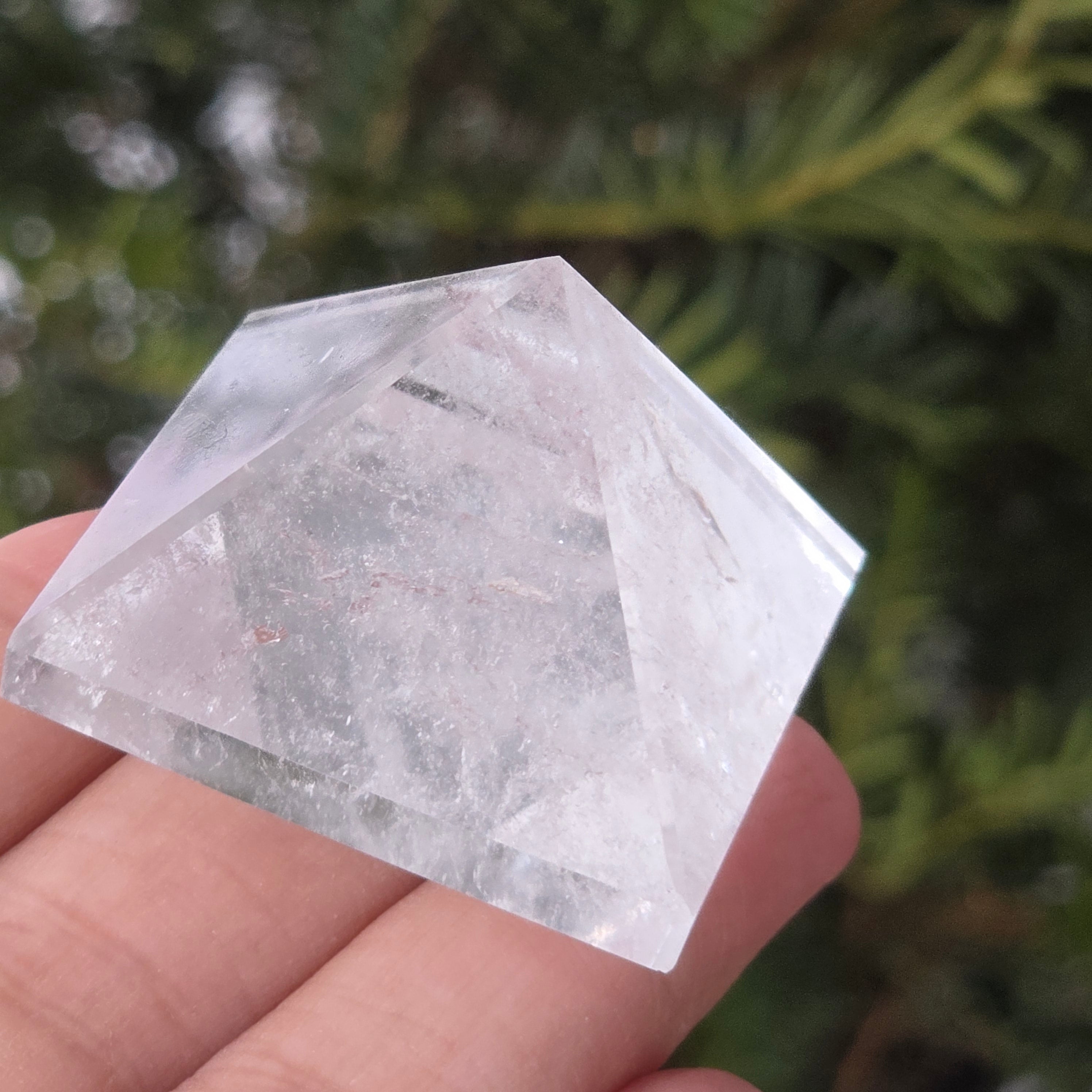 Przezroczysta piramida kwarcowa kojarzona jest z jasnością umysłu, wzmacnianiem intencji i równowagą energetyczną, jej kształt koncentruje i kieruje energię w uporządkowany sposób. Często używana jest jako symbol klarowności myśli i harmonii między myślą, emocją a działaniem.