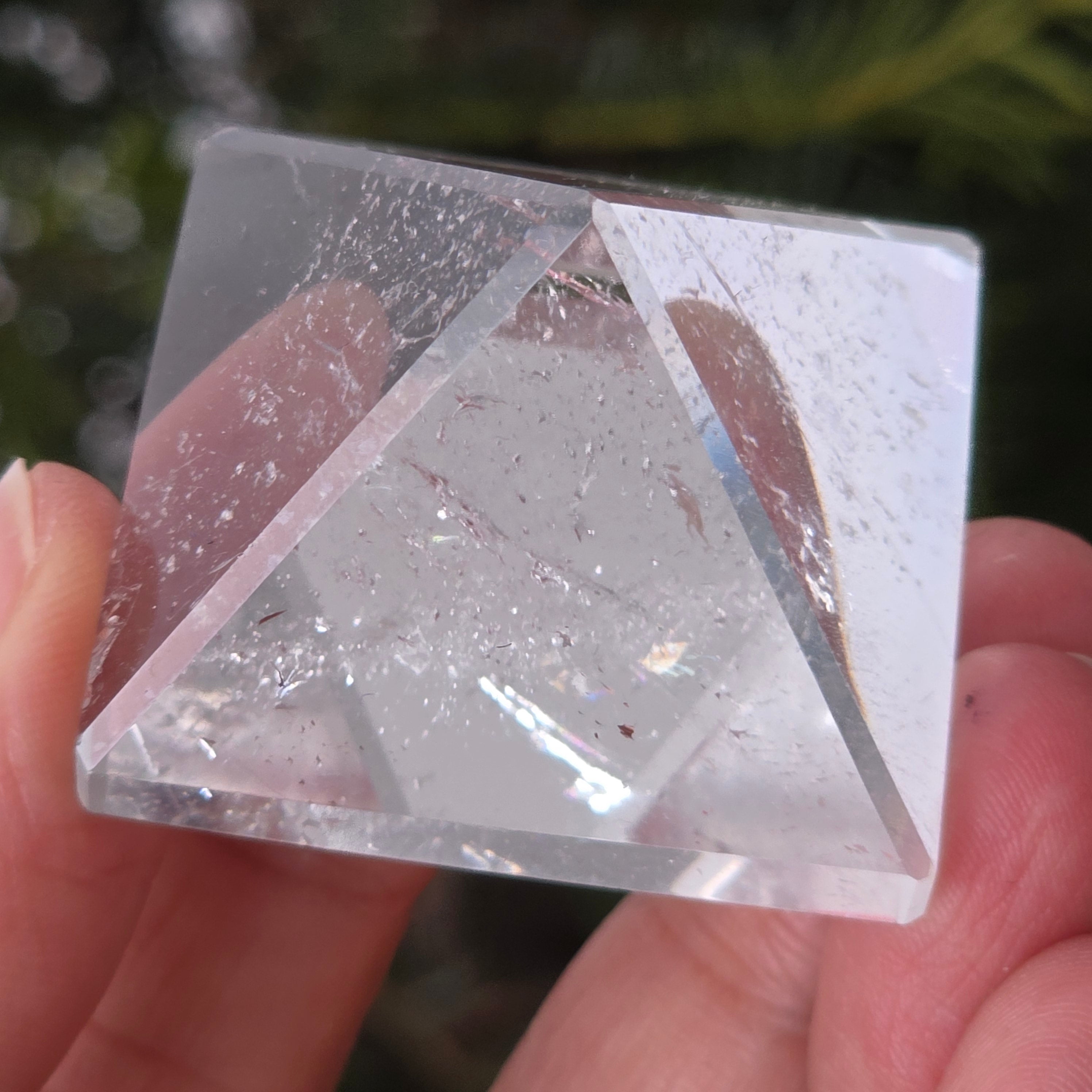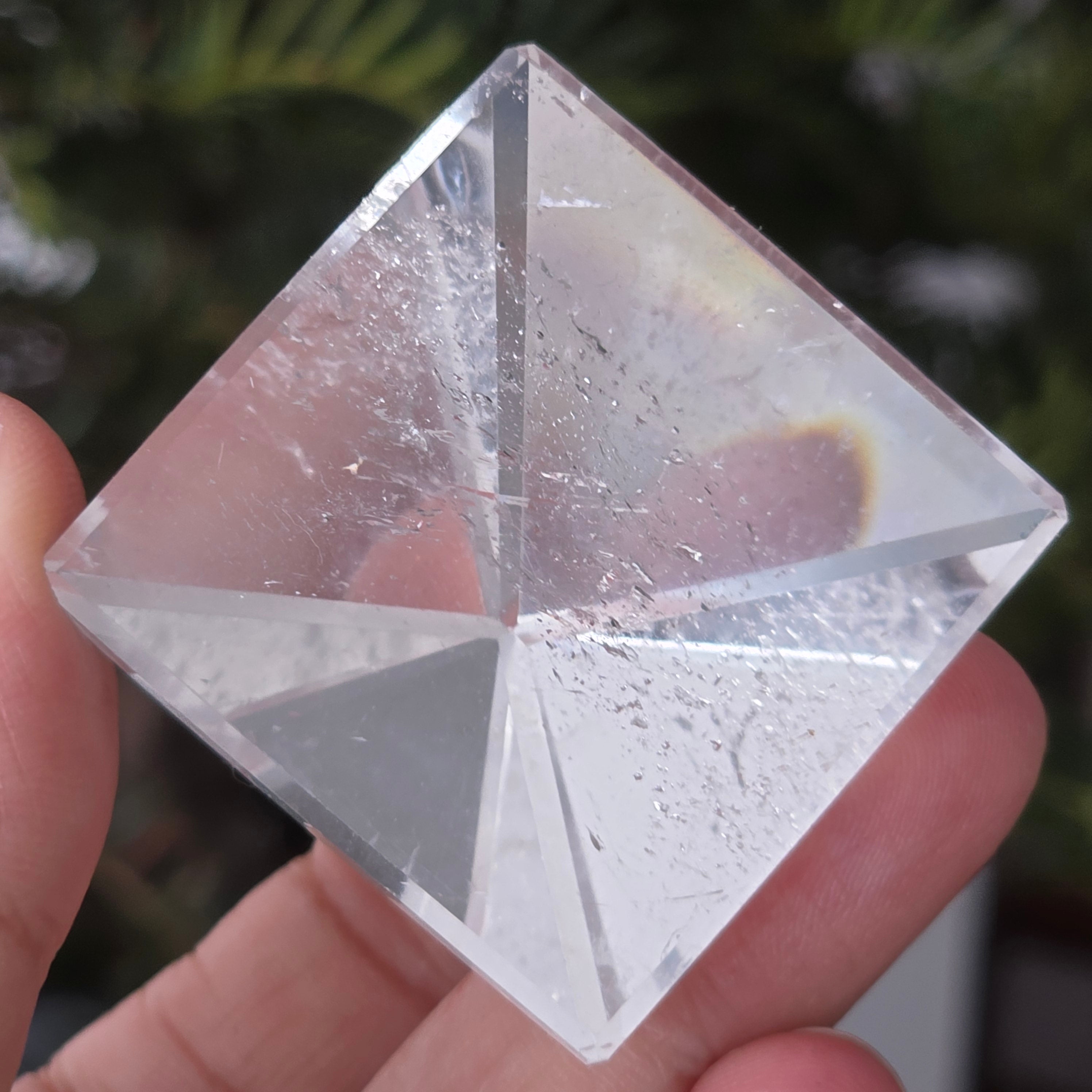 Przezroczysta piramida kwarcowa kojarzona jest z jasnością umysłu, wzmacnianiem intencji i równowagą energetyczną, jej kształt koncentruje i kieruje energię w uporządkowany sposób. Często używana jest jako symbol klarowności myśli i harmonii między myślą, emocją a działaniem.