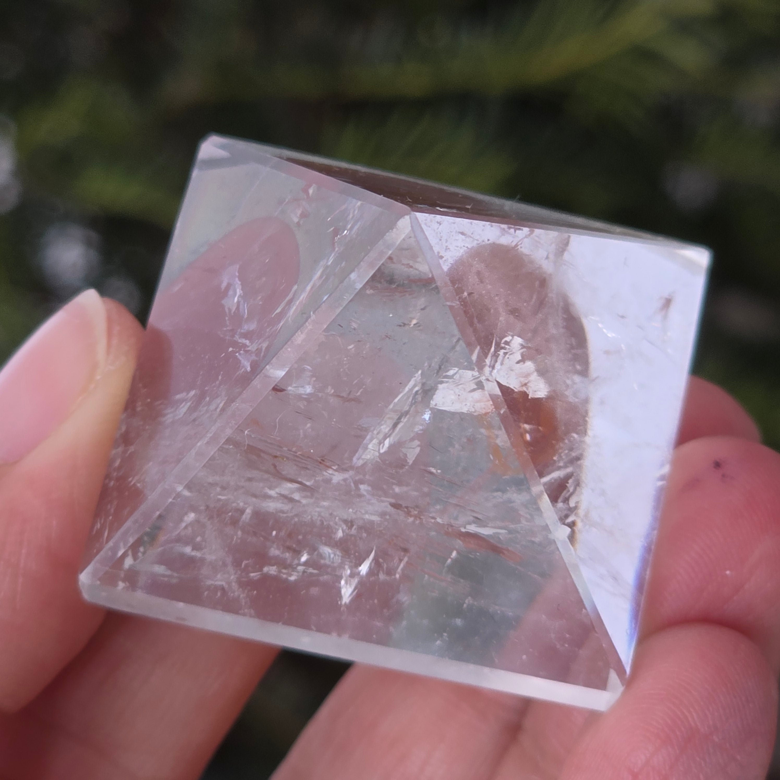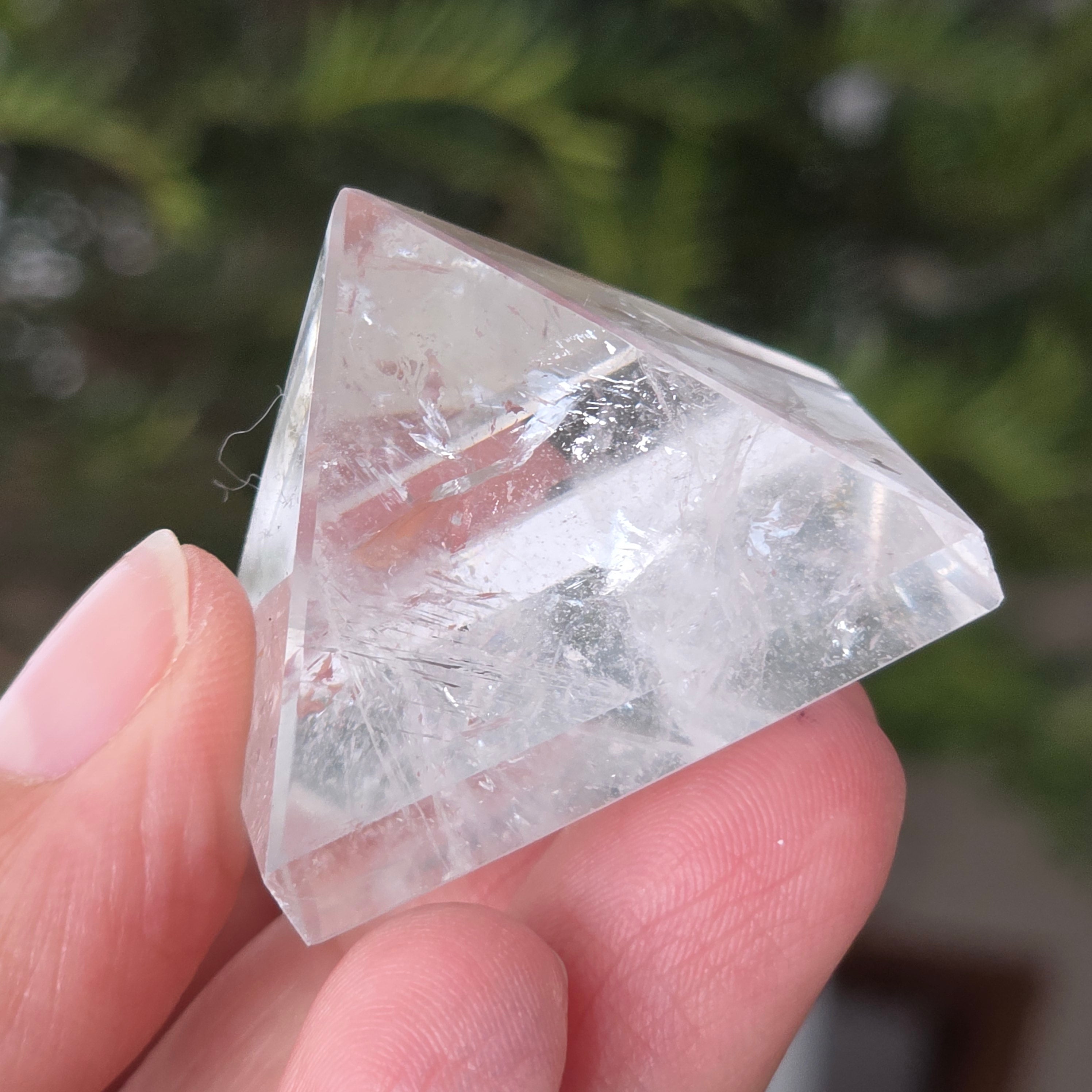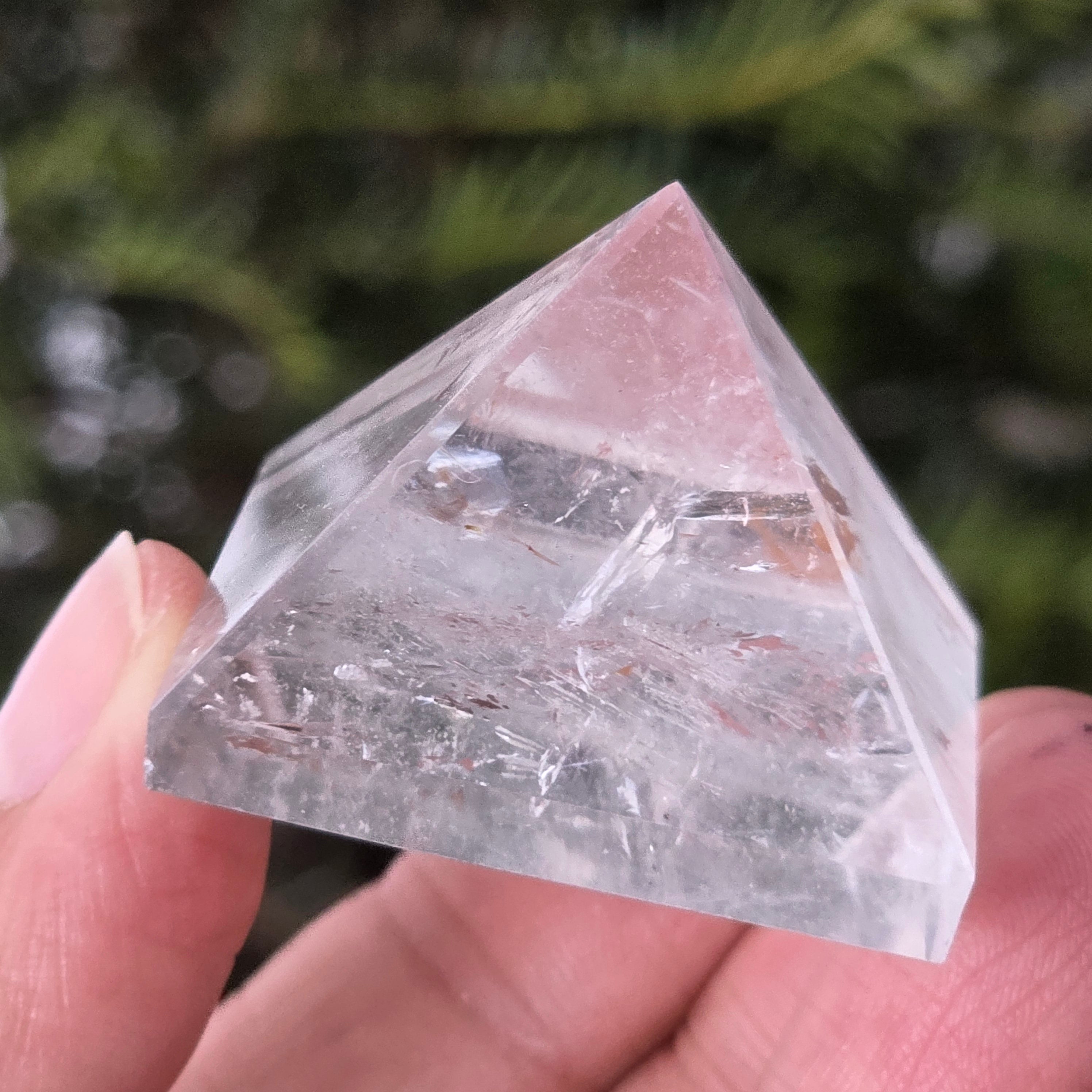 Piramida z przezroczystego kwarcu jest kojarzona z jasnością umysłu, wzmacnianiem intencji i równowagą energetyczną; jej forma koncentruje i kieruje energię w uporządkowany sposób. Często używana jest jako symbol klarowności myśli i harmonii między myślą, emocją a działaniem.