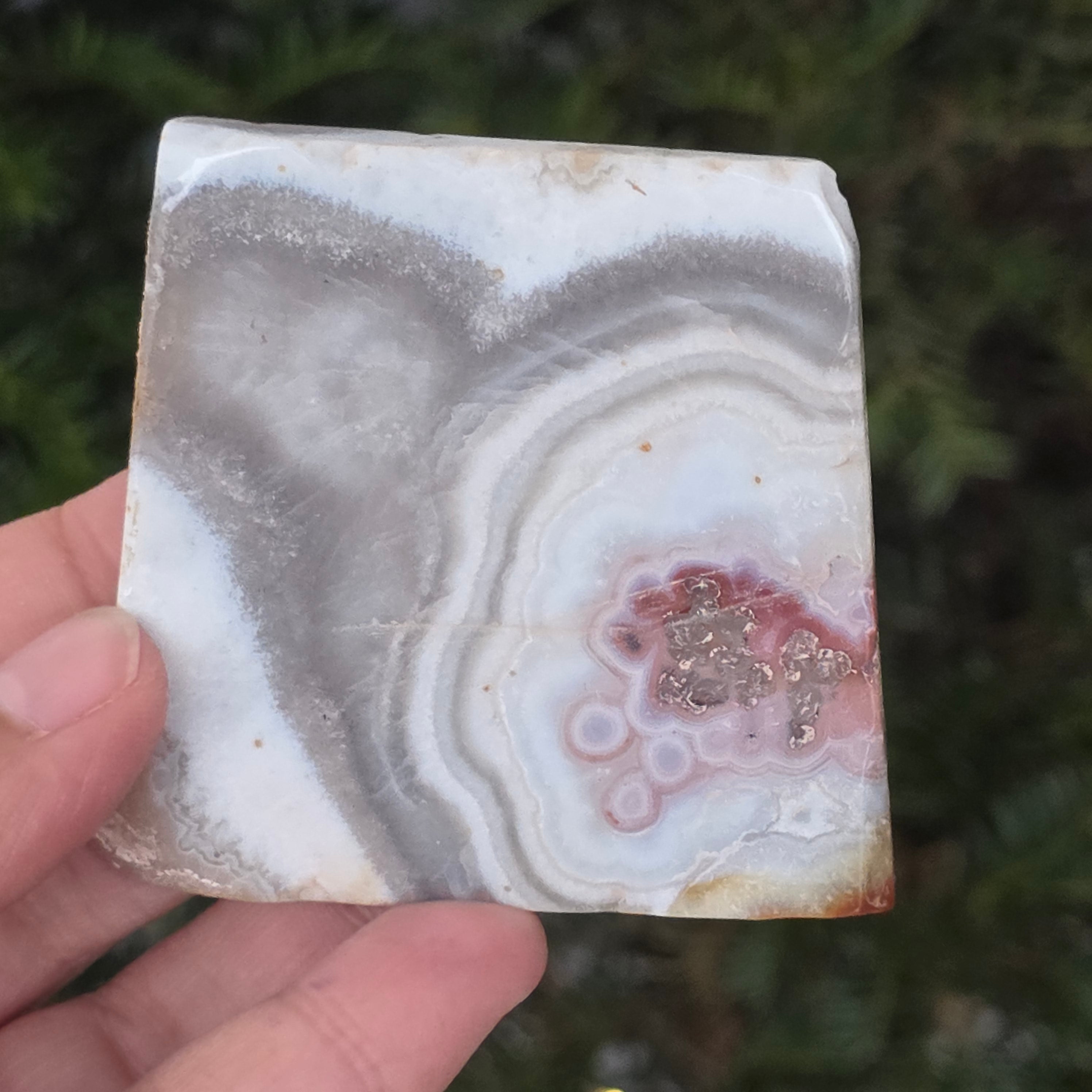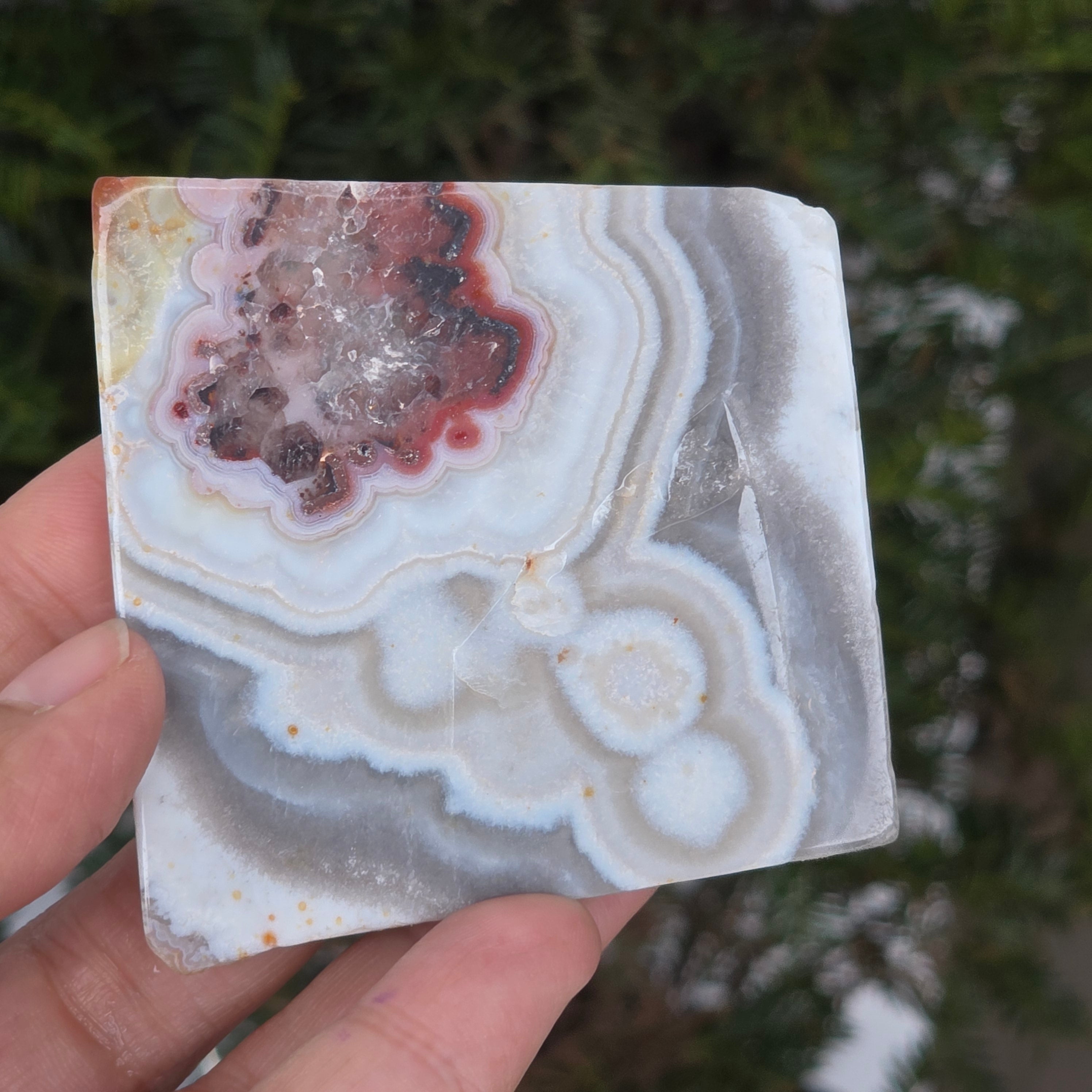 Agat Crazy z Meksyku jest jedną z najbardziej żywych i spektakularnych odmian agatu, znaną z falistych linii i szaleńczych gier kolorów, które wydają się być rysowane wolną ręką, bez zasad. W tym naturalnym plasterku, małym, ale niezwykle ekspresyjnym, ujawnia się cała opowieść kamienia: ziemiste warstwy, ciepłe odcienie karmelu, intensywna czerwień, pomarańcz, szarość i krem, wymieszane w spiralne wzory, które zdają się pulsować życiem.