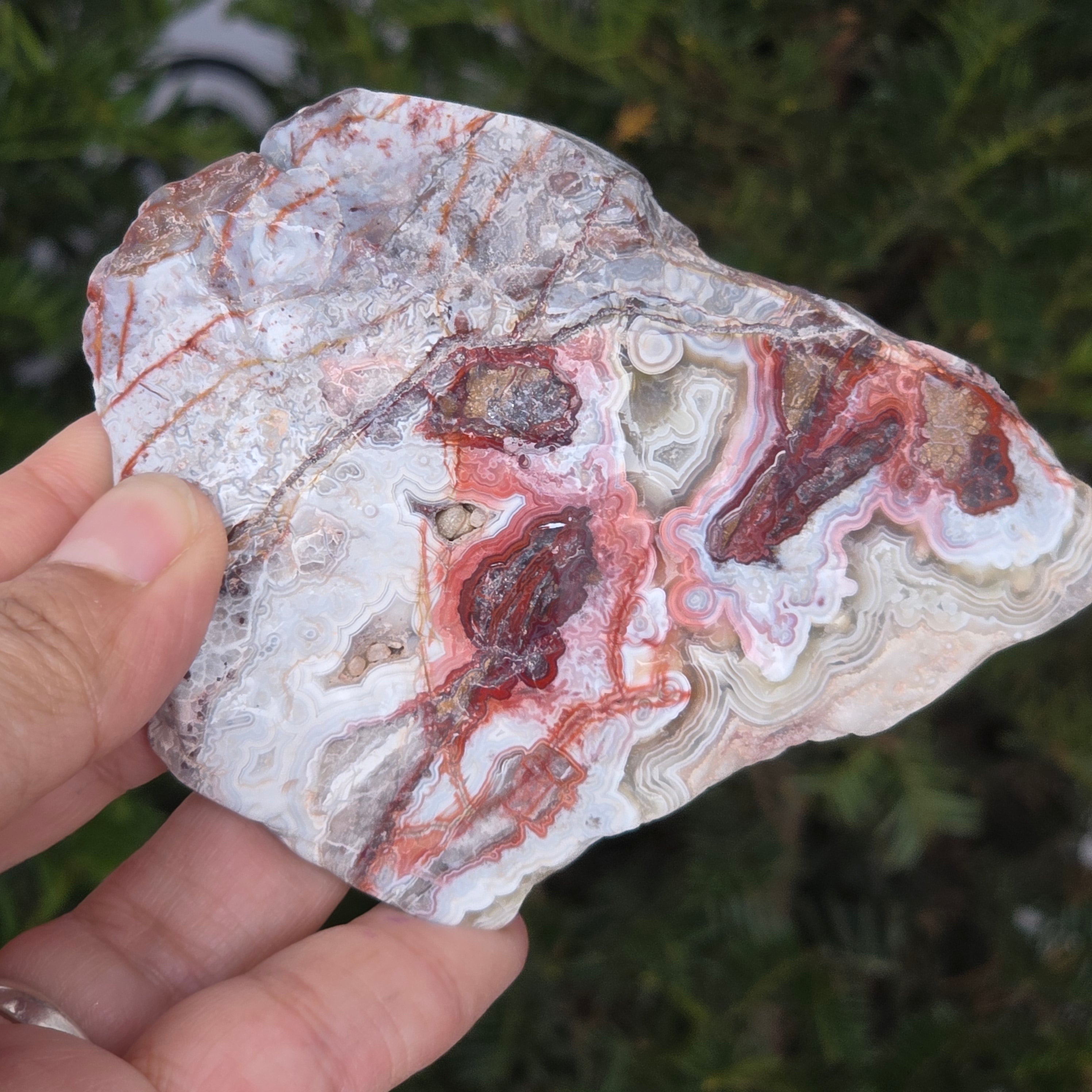 Agat Crazy z Meksyku to jedna z najbardziej żywych i spektakularnych odmian agatu, znana z falistych linii i szaleńczych gier kolorów, które wydają się być rysowane wolną ręką, bez zasad. W tym naturalnym plasterku, małym, ale niezwykle ekspresyjnym, objawia się cała opowieść kamienia: ziemiste warstwy, ciepłe odcienie karmelu, jaskrawa czerwień, pomarańcz, szarość i krem, wymieszane w spiralne wzory, które zdają się pulsować życiem.