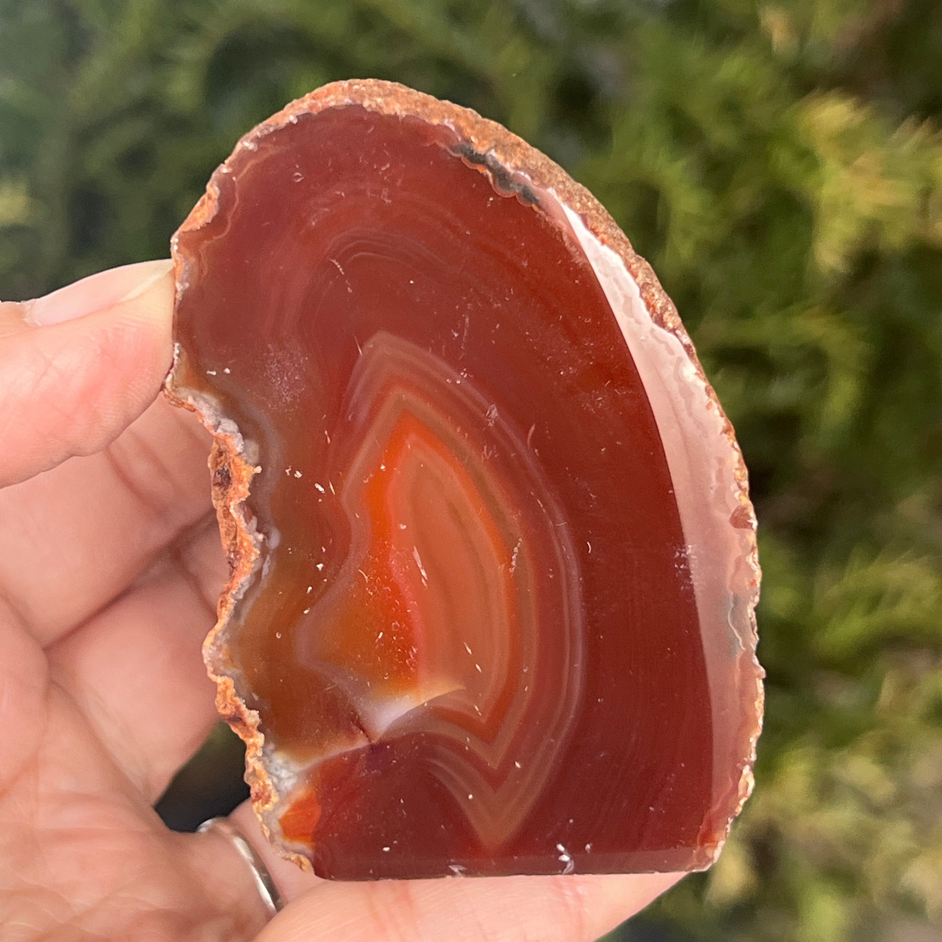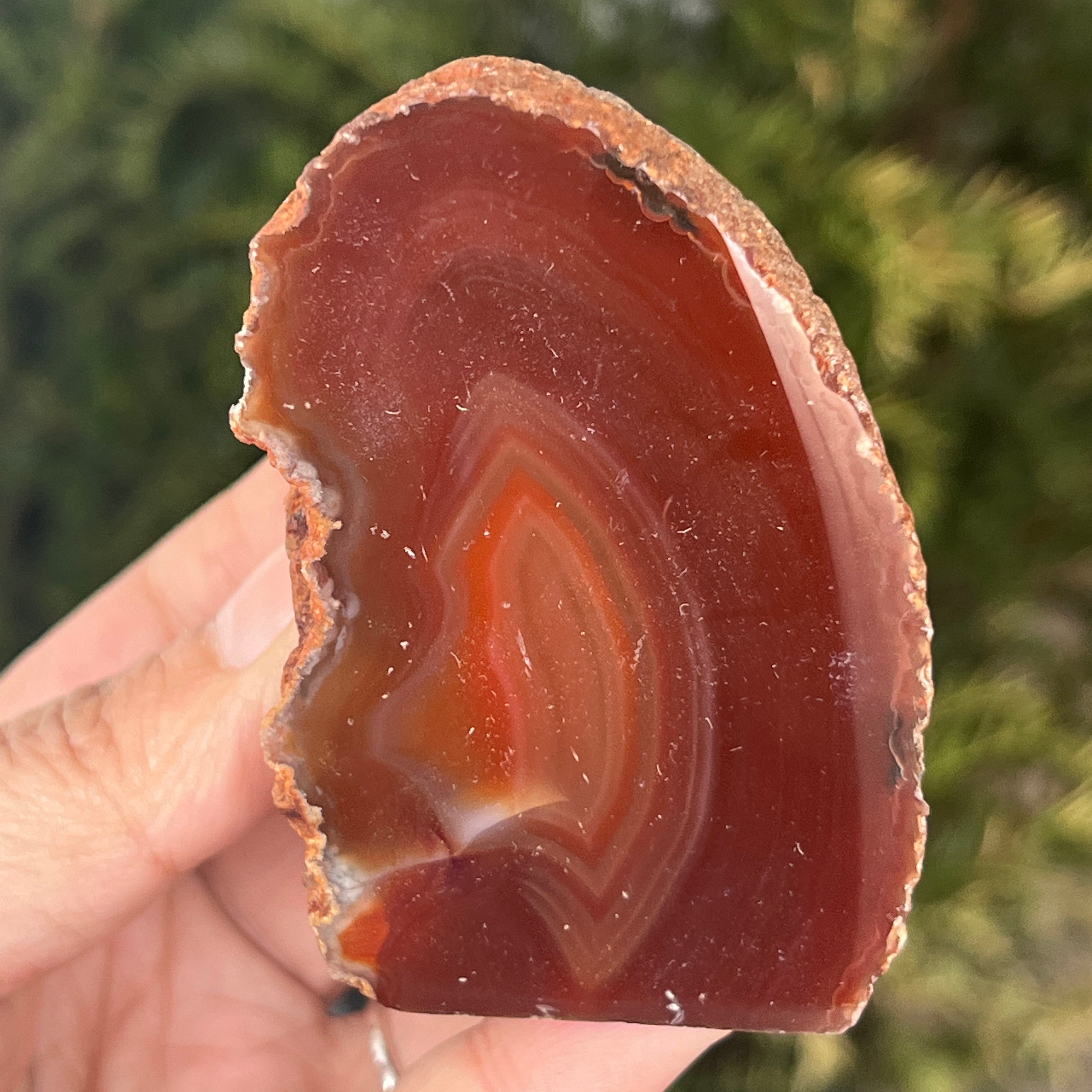 Czerwony agat jest odmianą mikrokryształowego kwarcu z rodziny chalcedonów, powstałą w wyniku kolejnych osadów krzemionki w wulkanicznych jamach. Jego ciepłe odcienie często są wpływane przez obecność tlenków żelaza, co nadaje mu intensywny kolor. Jest to odmiana agatu ceniona zarówno za naturalne piękno swoich pasm, jak i za symbolikę związaną z witalnością, odwagą i równowagą emocjonalną.